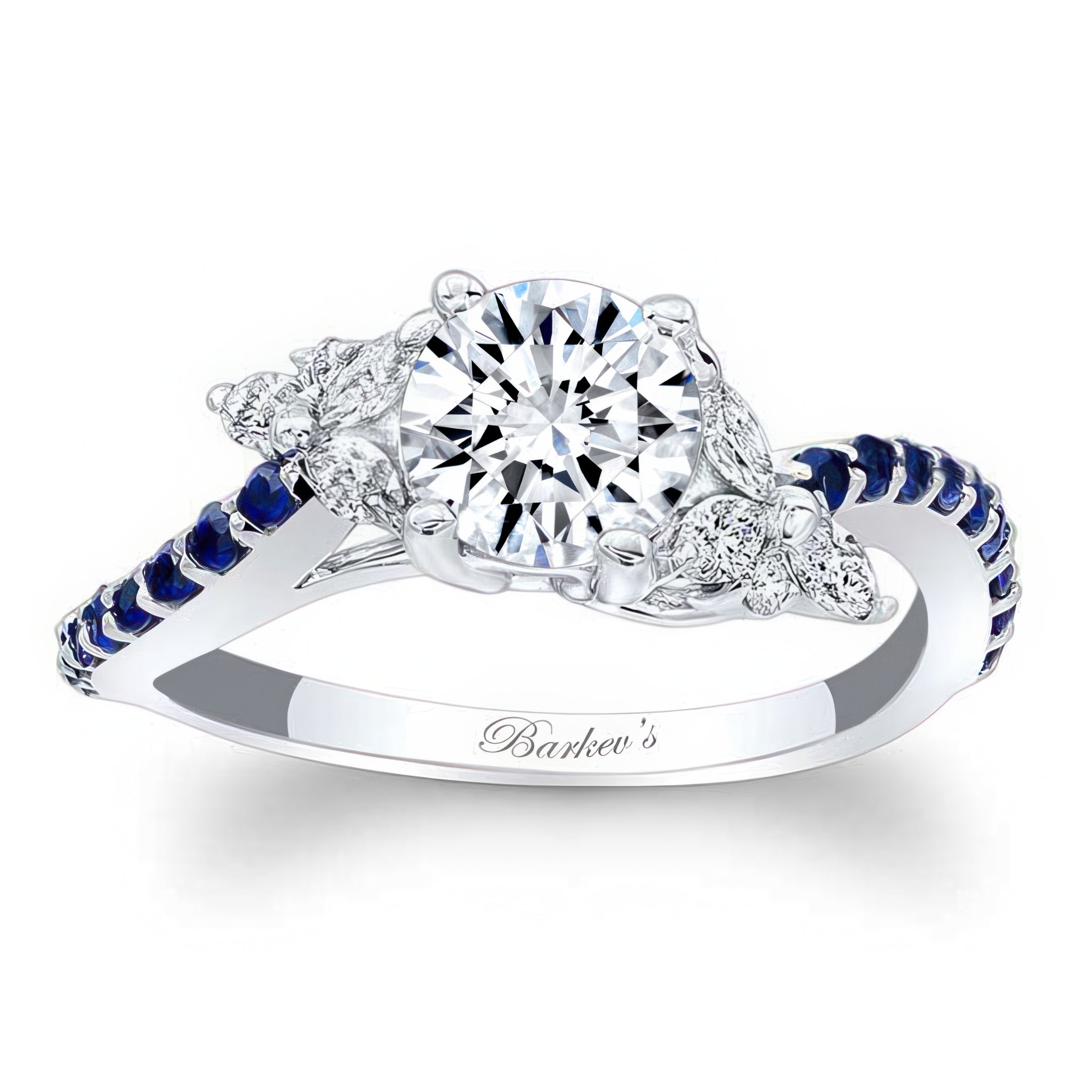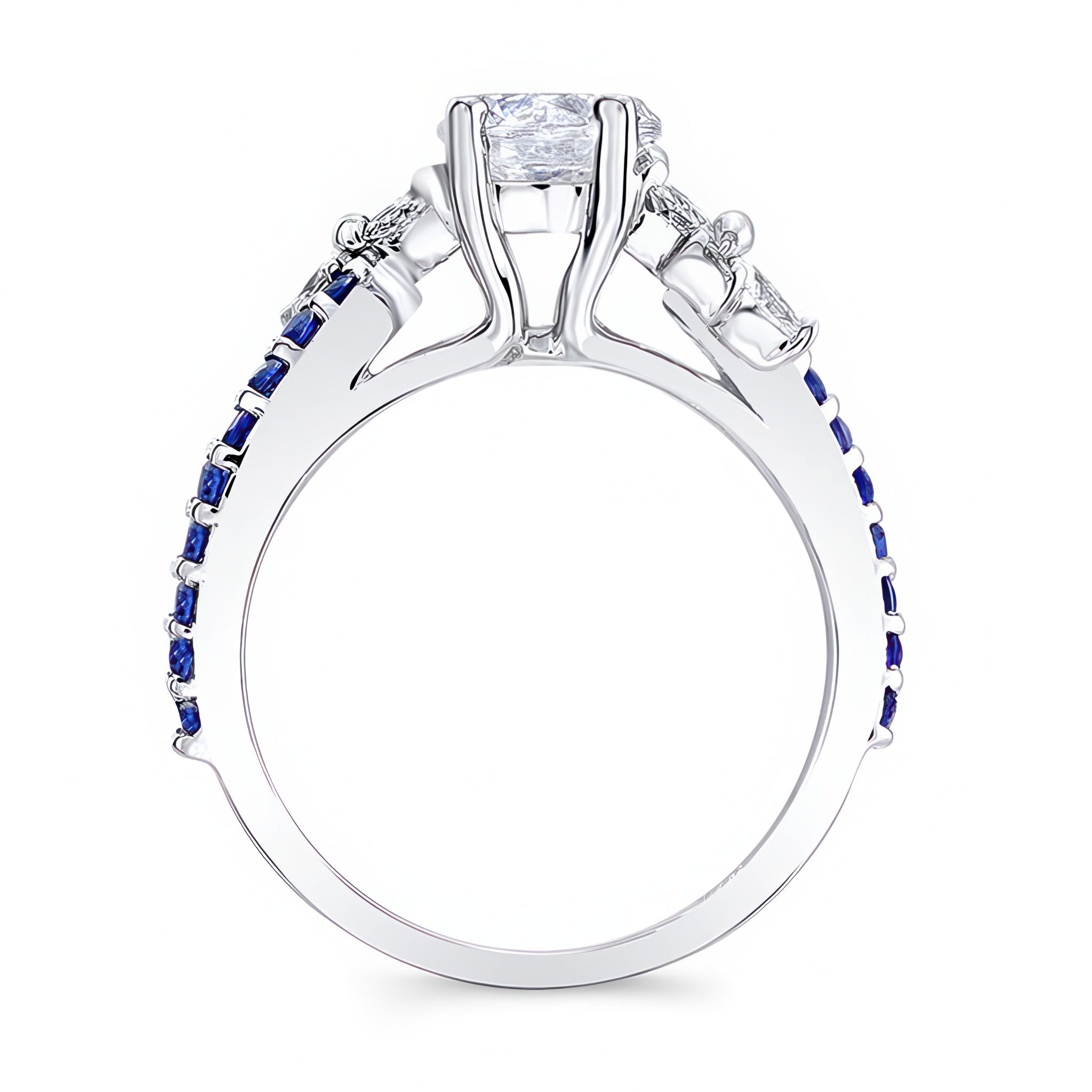 This round blue sapphire accent ring features a prong set center flanked on each side by fancy marquise diamonds with blue sapphires cascading down the shoulders for an elegant fashion statement.