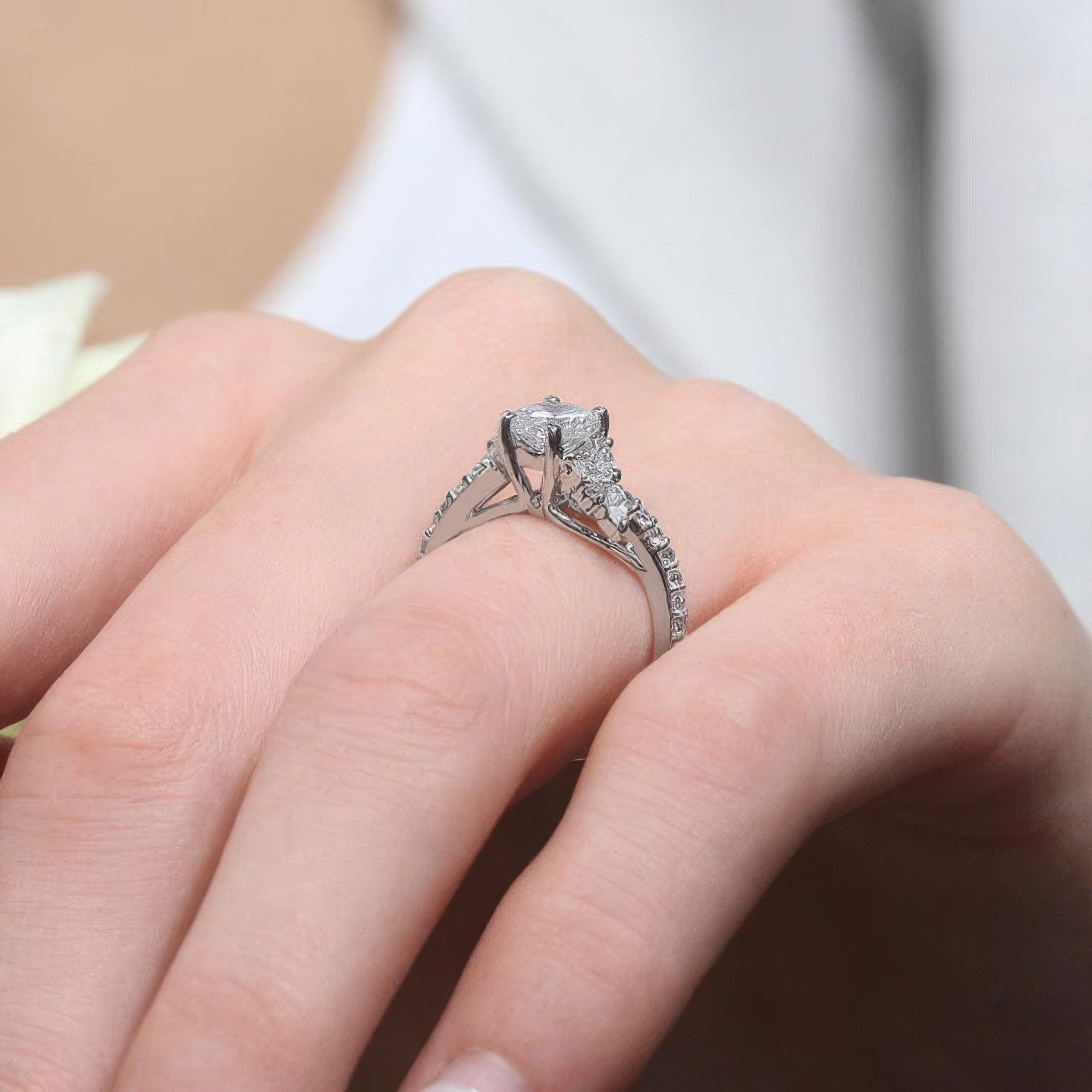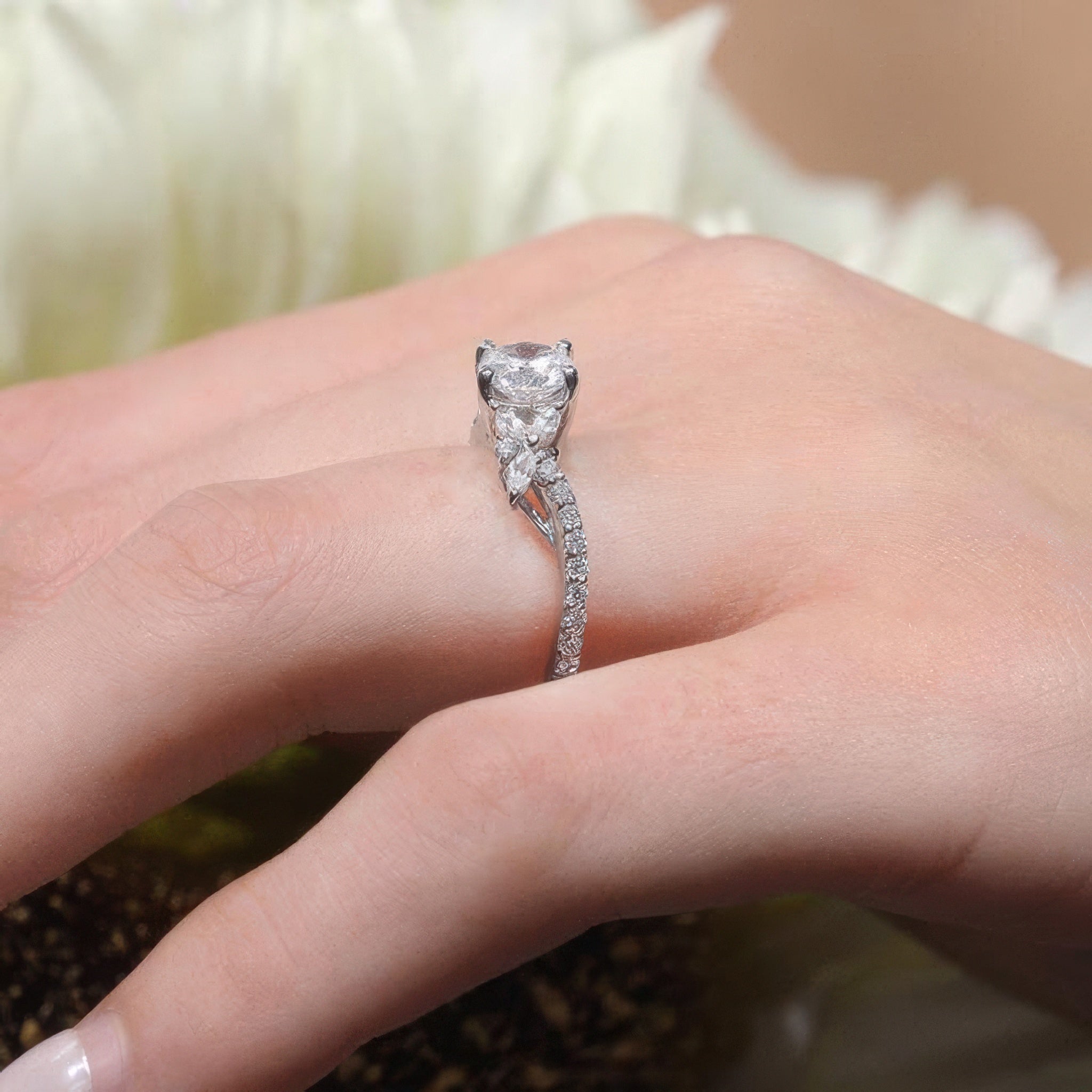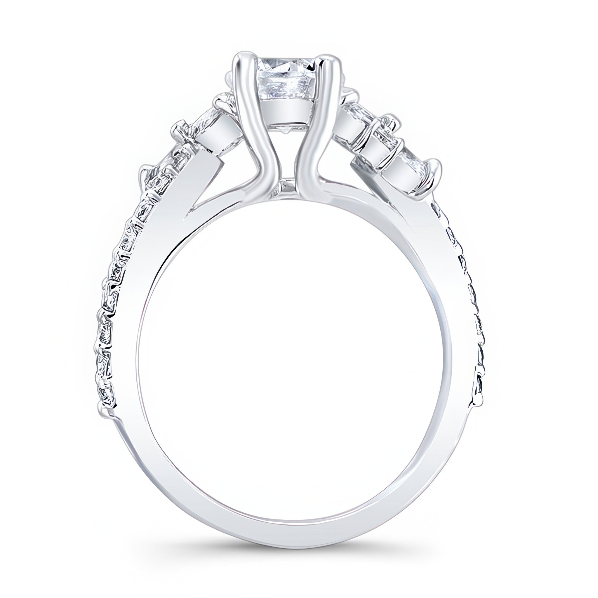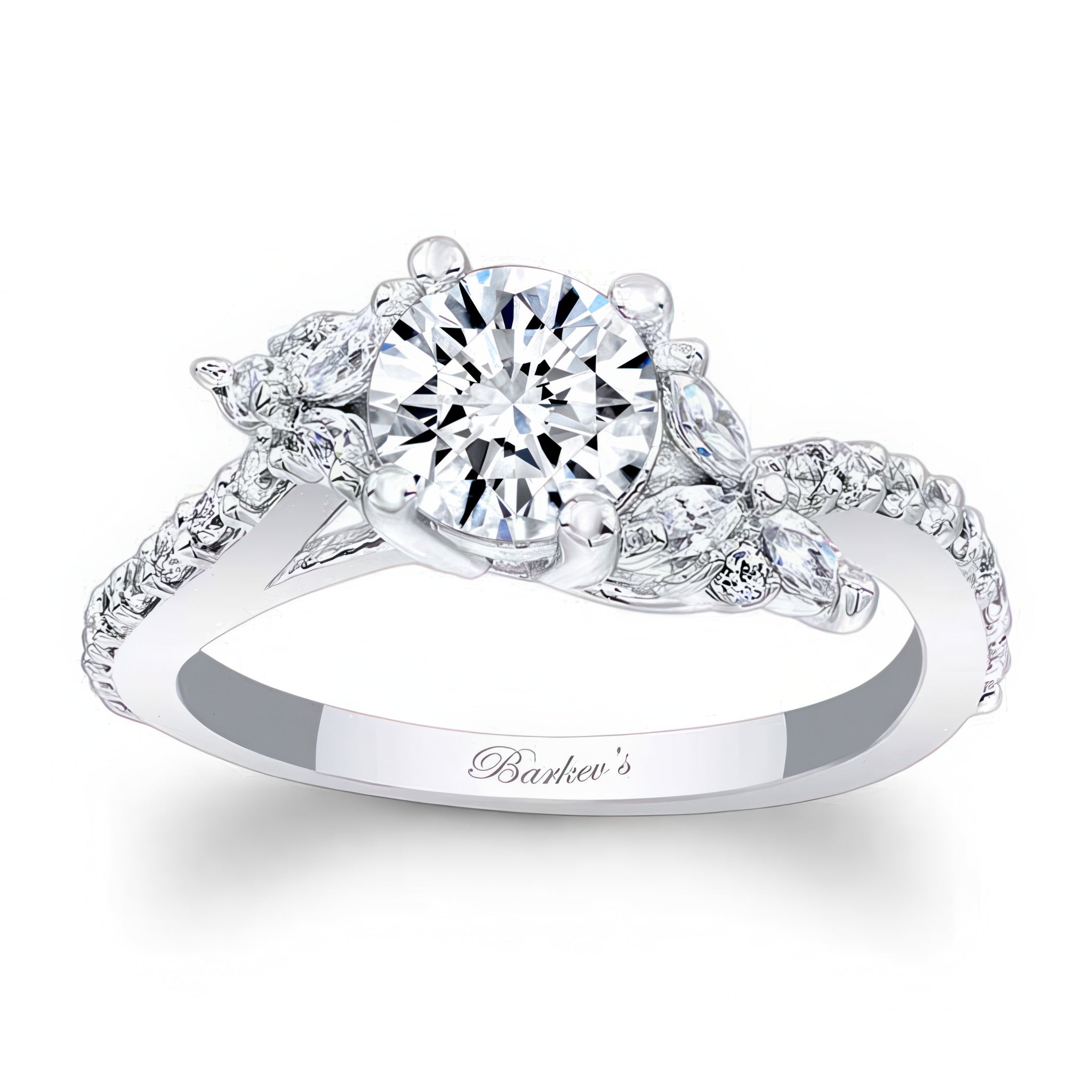 This round diamond ring features a prong set center flanked on each side by fancy marquise diamonds with more cascading down the shoulders for an elegant fashion statement.