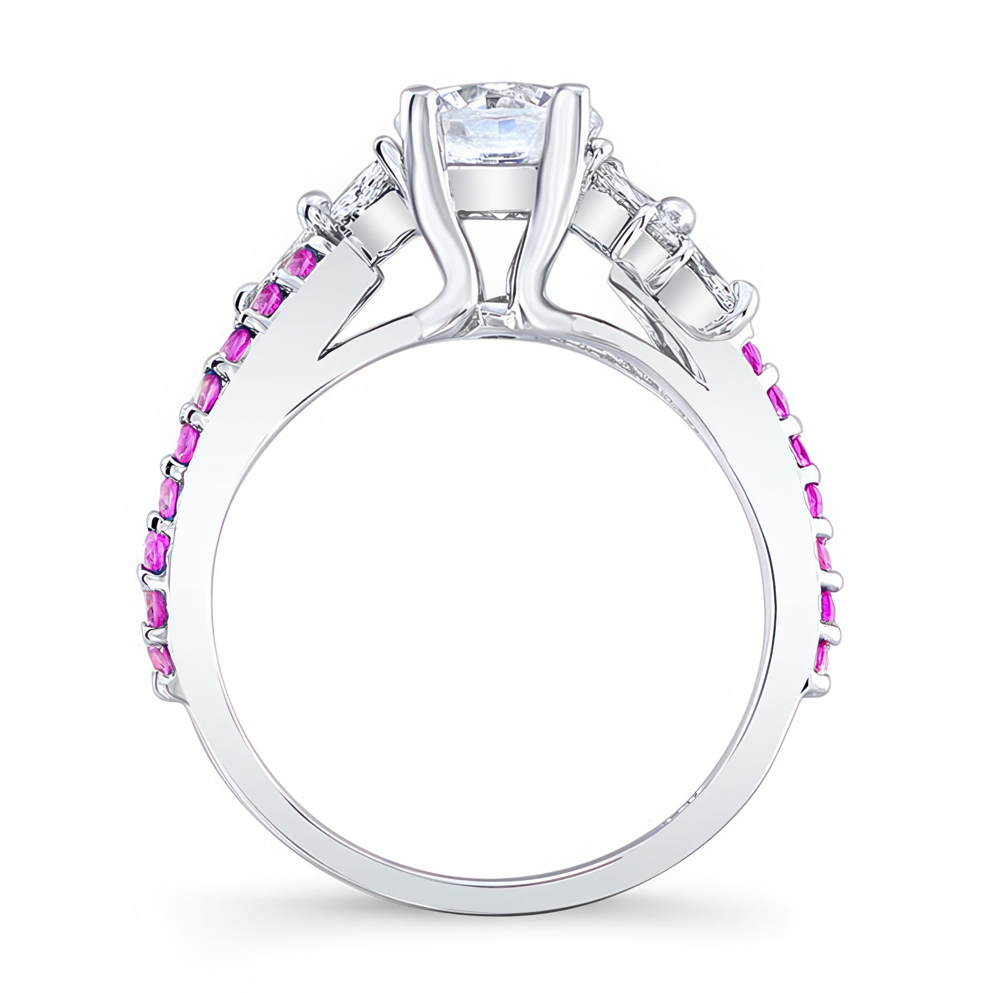This round pink sapphire accent ring features a prong set center flanked on each side by fancy marquise diamonds with pink sapphires cascading down the shoulders for an elegant fashion statement.
