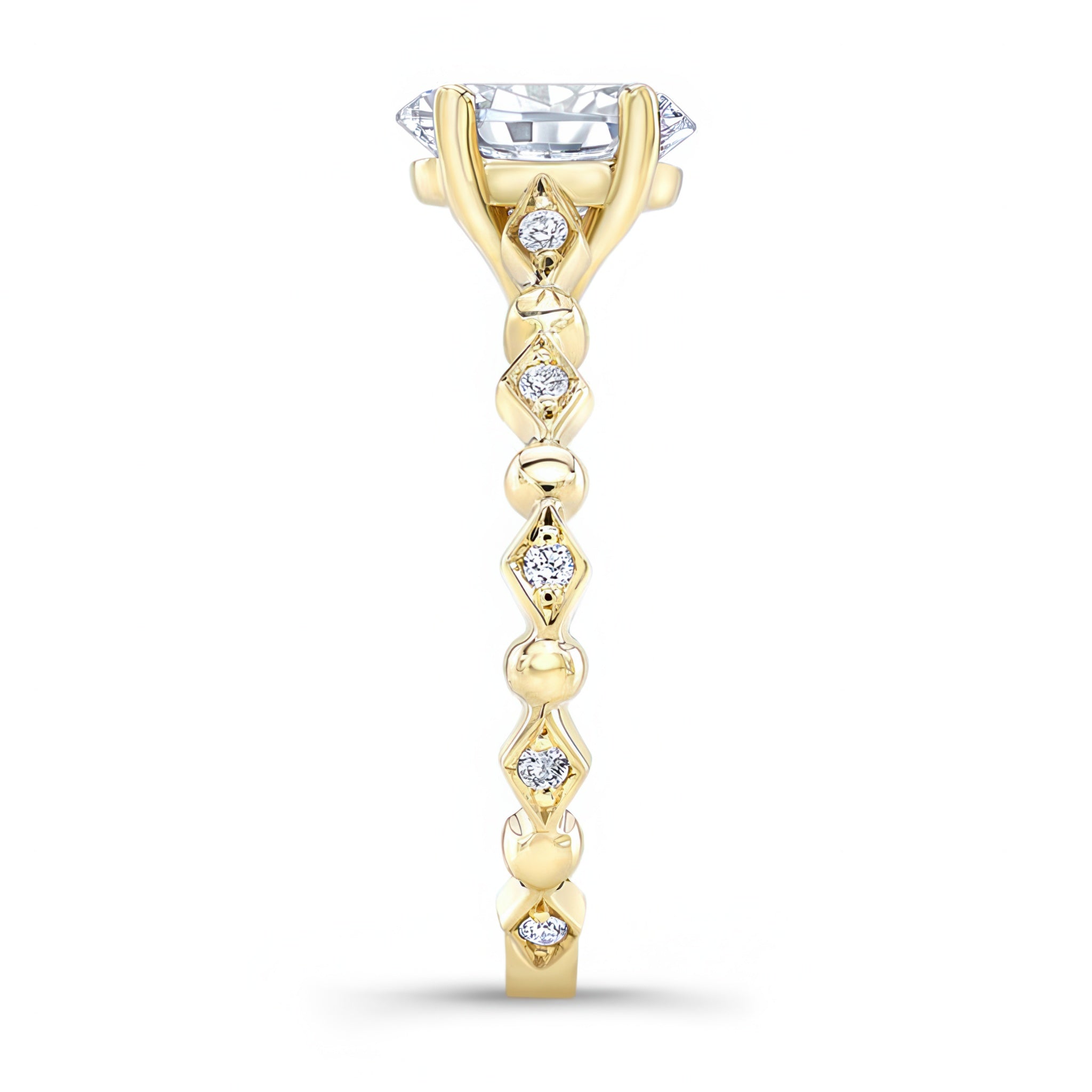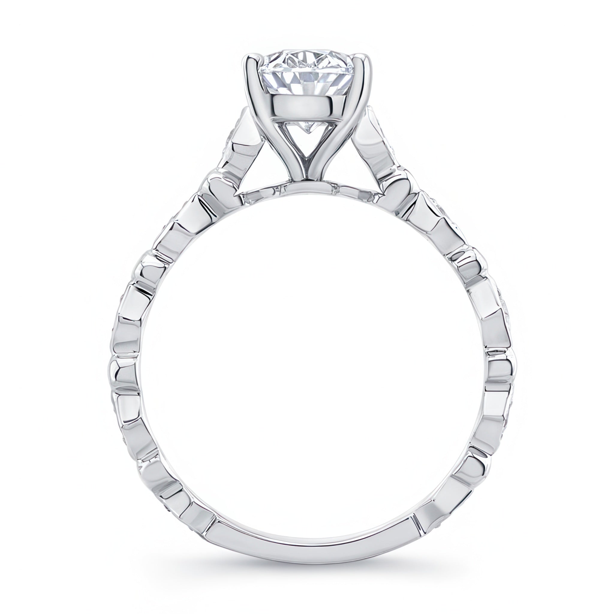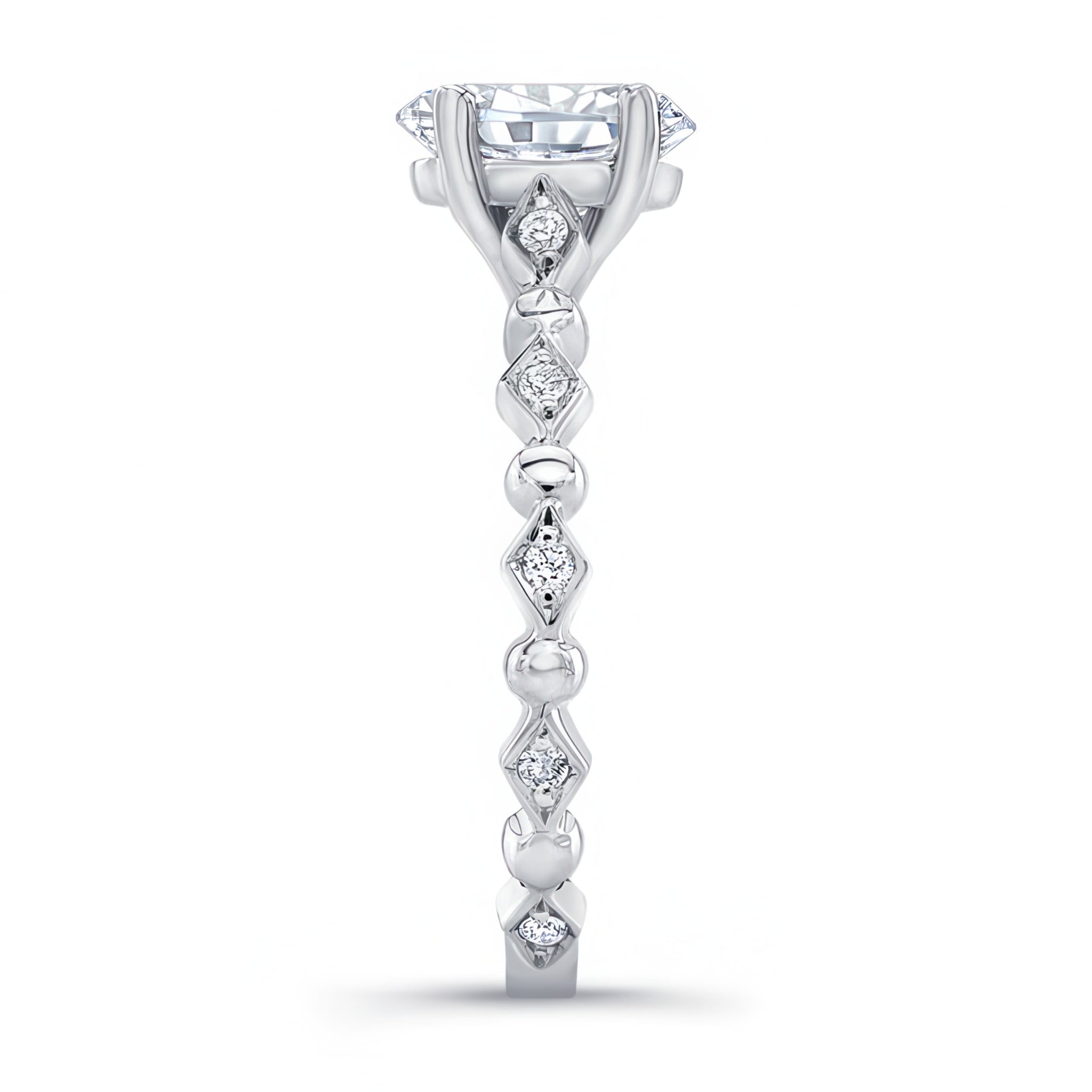 This art deco oval engagement ring combines simplicity and uniqueness in a dainty design. The center stone sits beautifully on the playful diamond pave setting adorning the band.