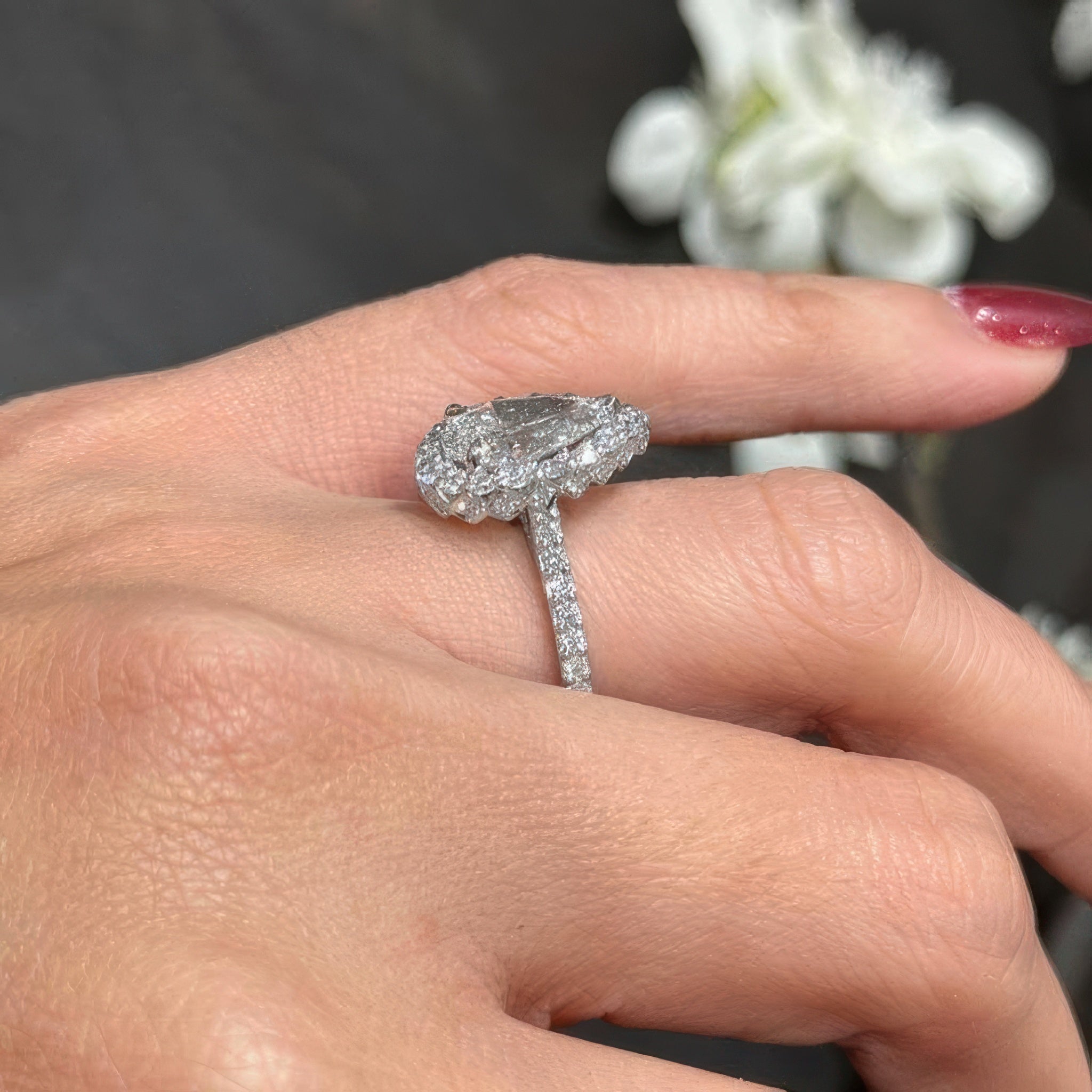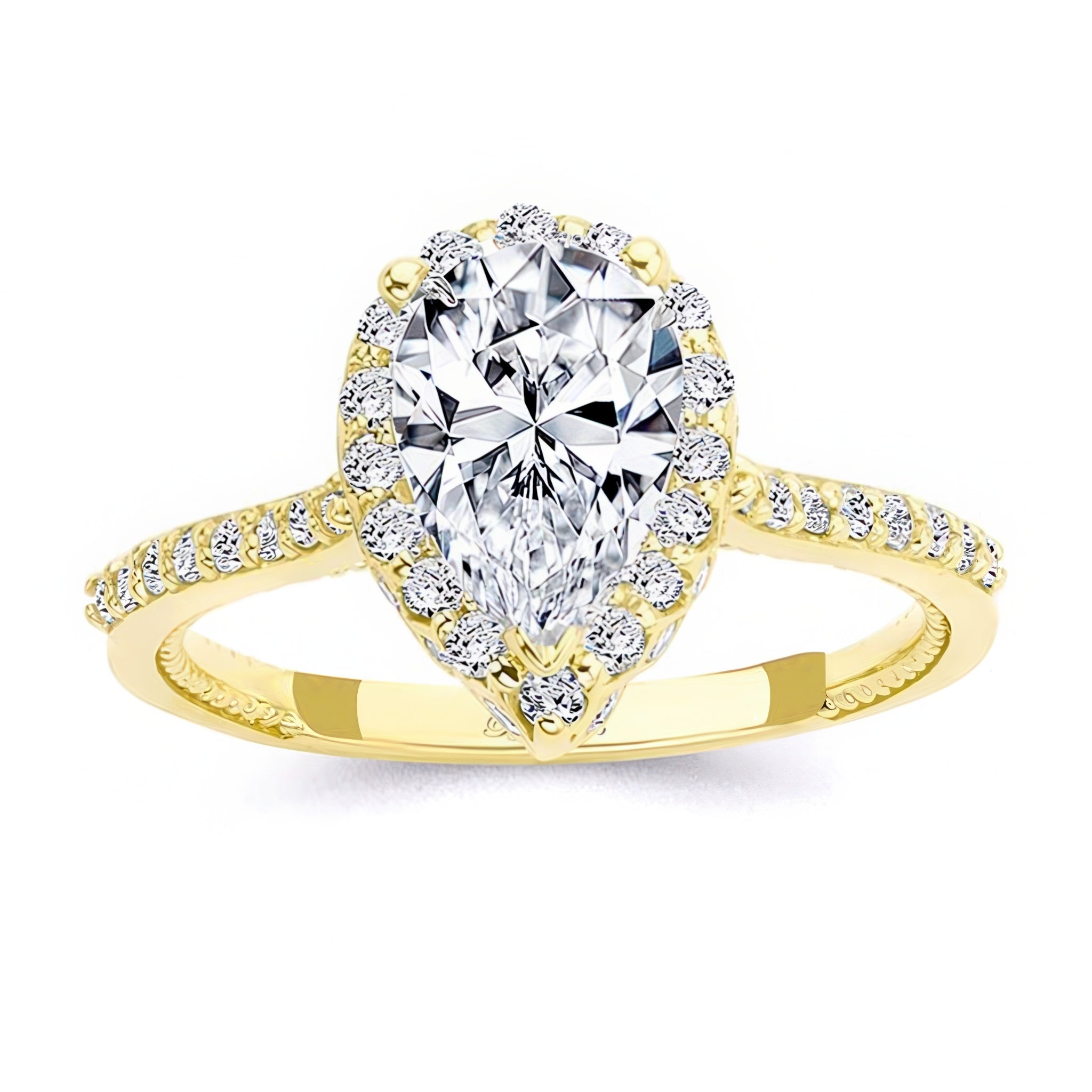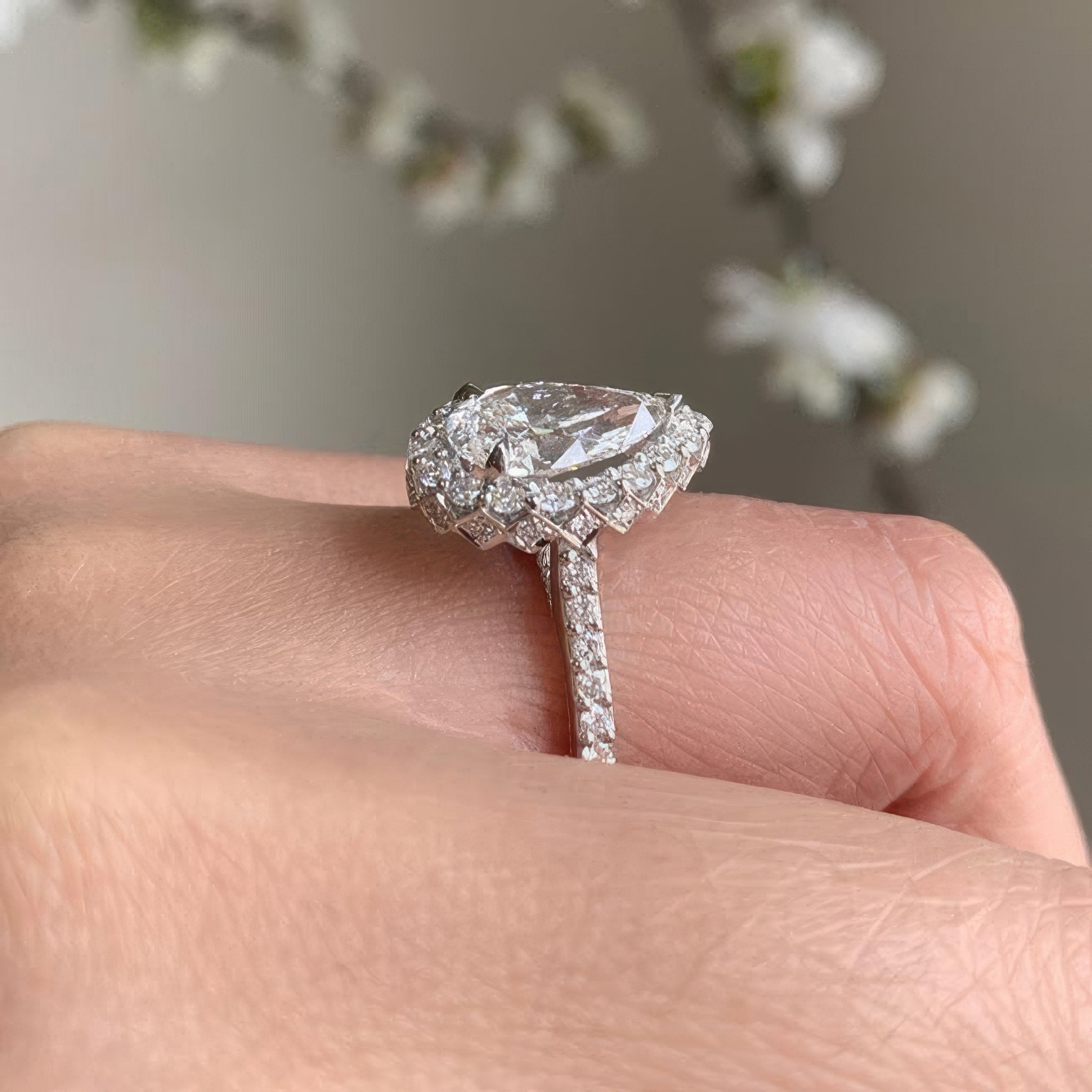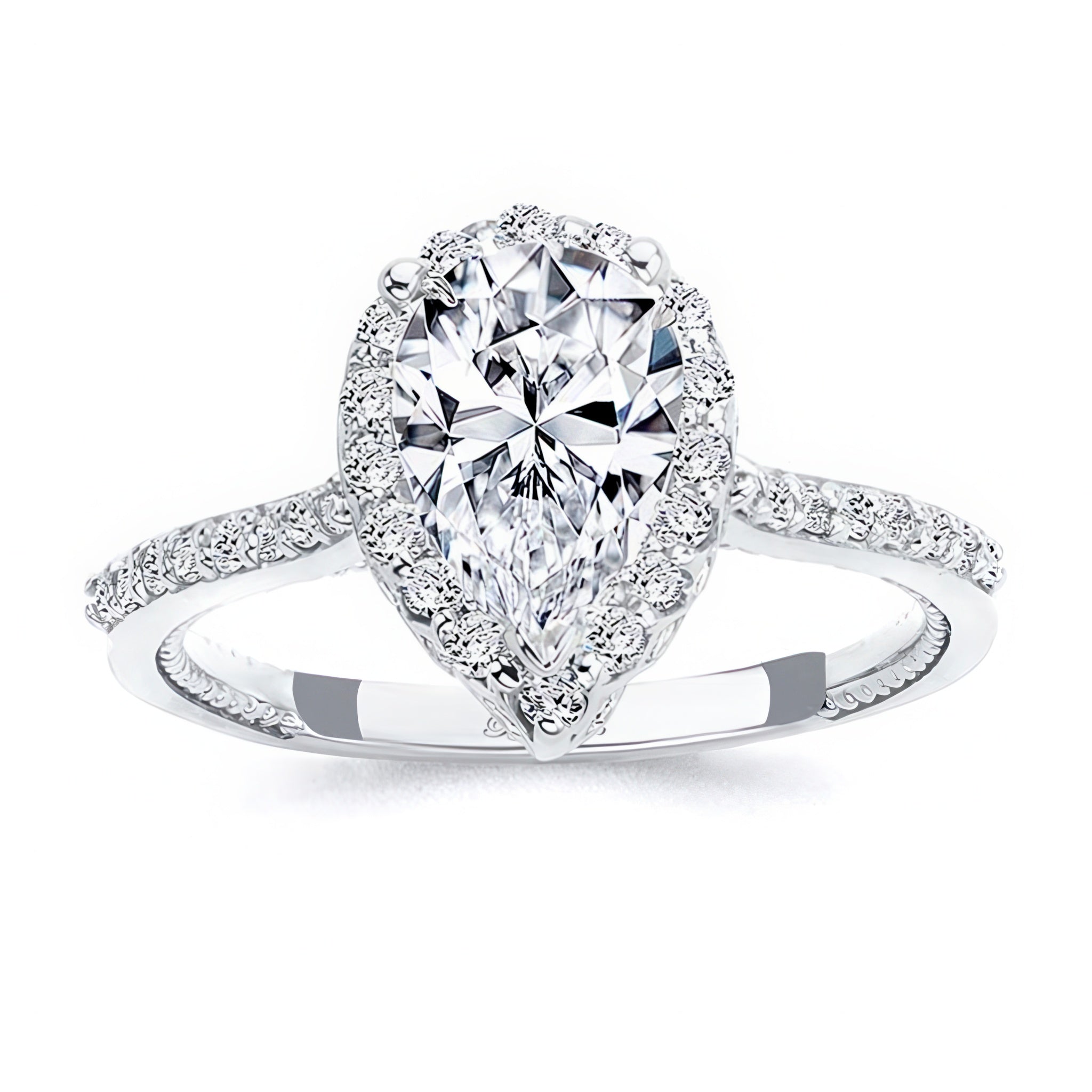A beautiful 2 carat pear shaped halo ring featuring a teardrop center surrounded by diamonds with melees flowing down the shank. The profile view reveals a second set of diamonds surrounding the center from underneath with two bezel set diamonds that give this ring a distinct look.