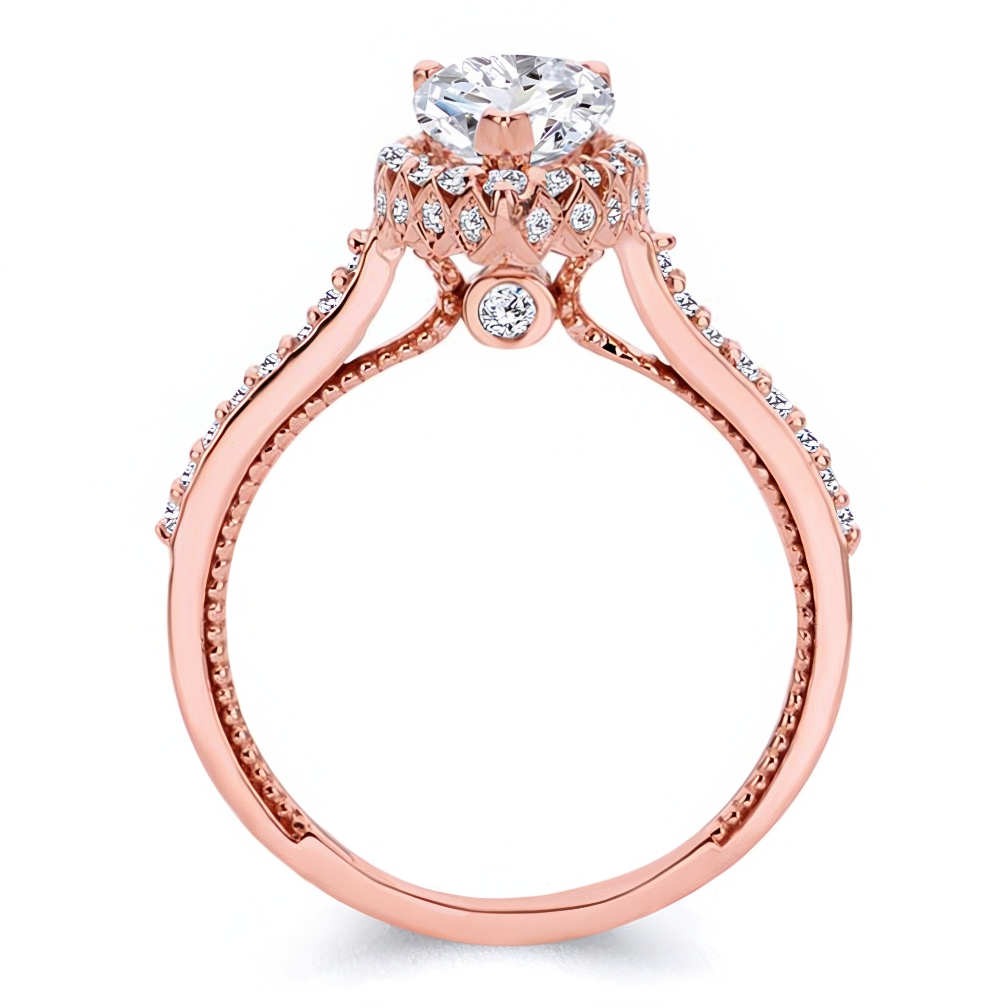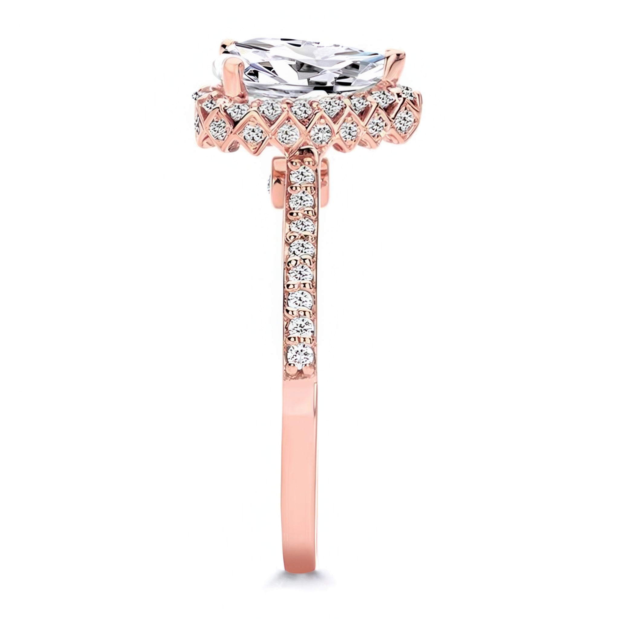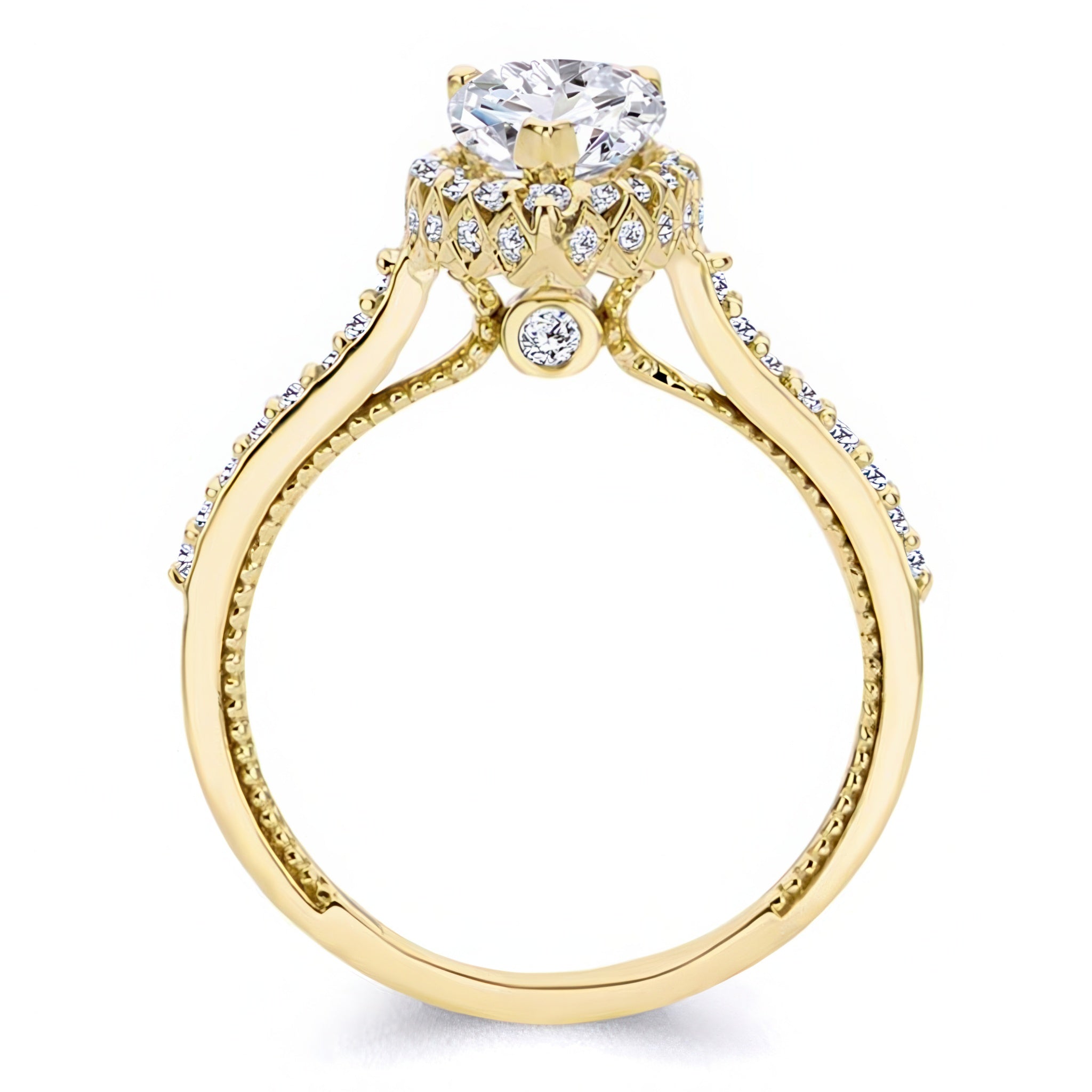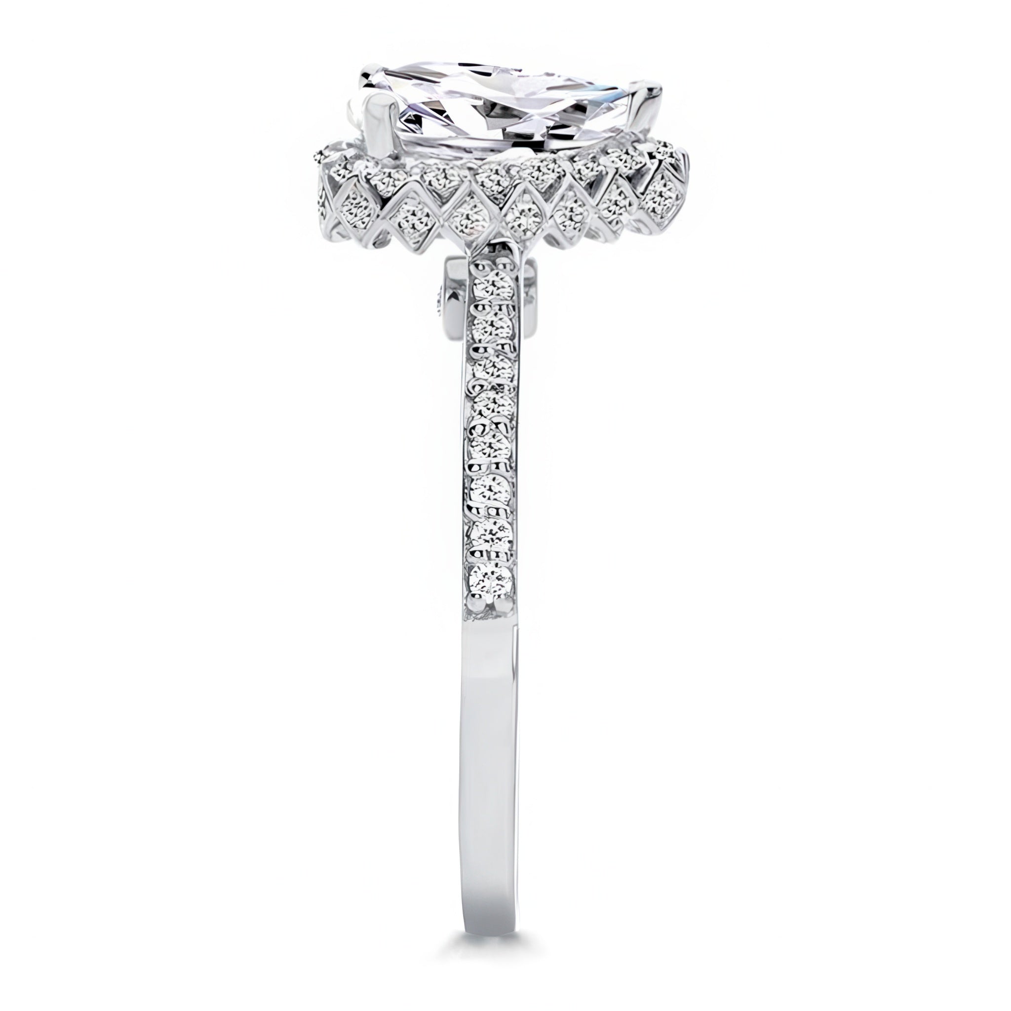 A beautiful 2 carat pear shaped halo ring featuring a teardrop center surrounded by diamonds with melees flowing down the shank. The profile view reveals a second set of diamonds surrounding the center from underneath with two bezel set diamonds that give this ring a distinct look.