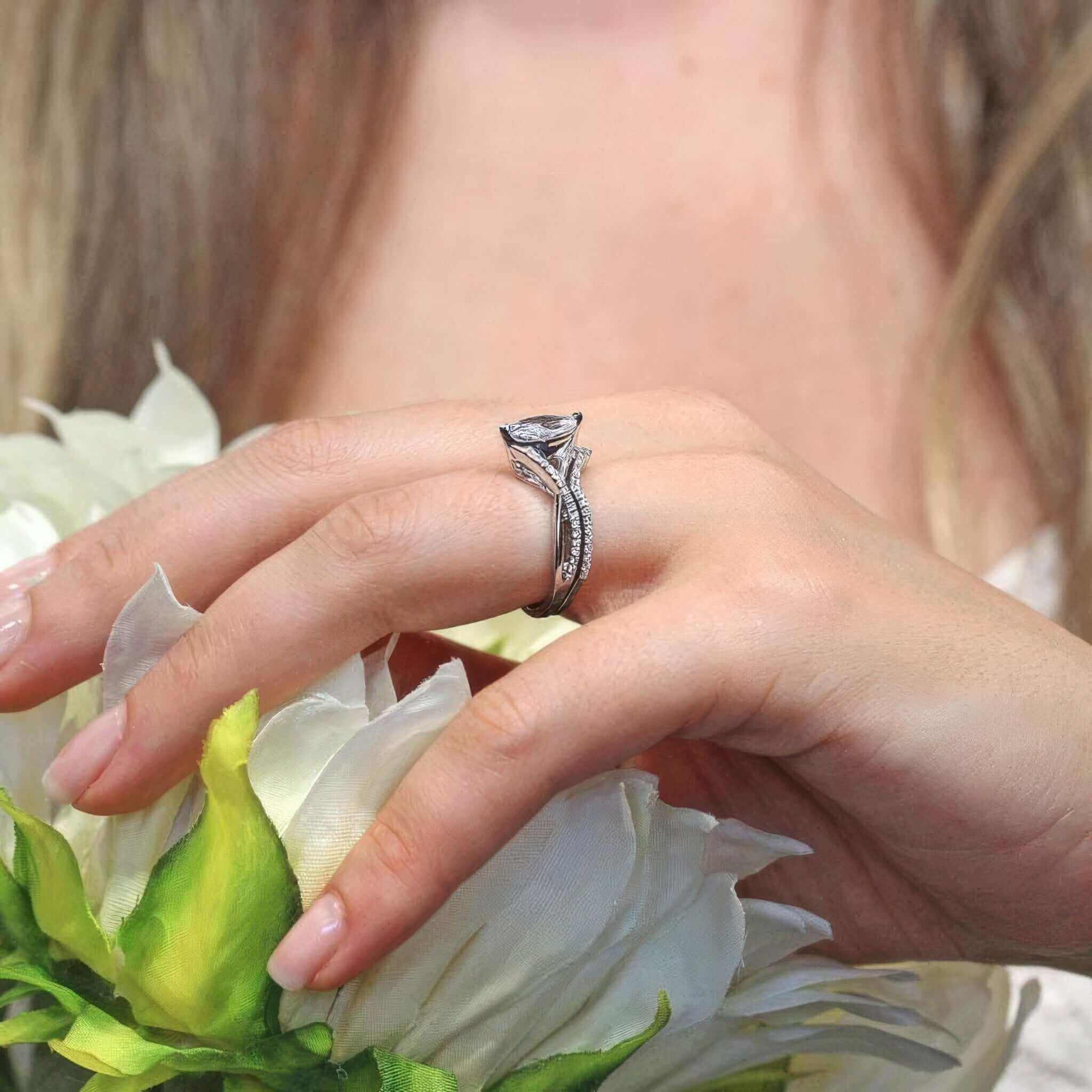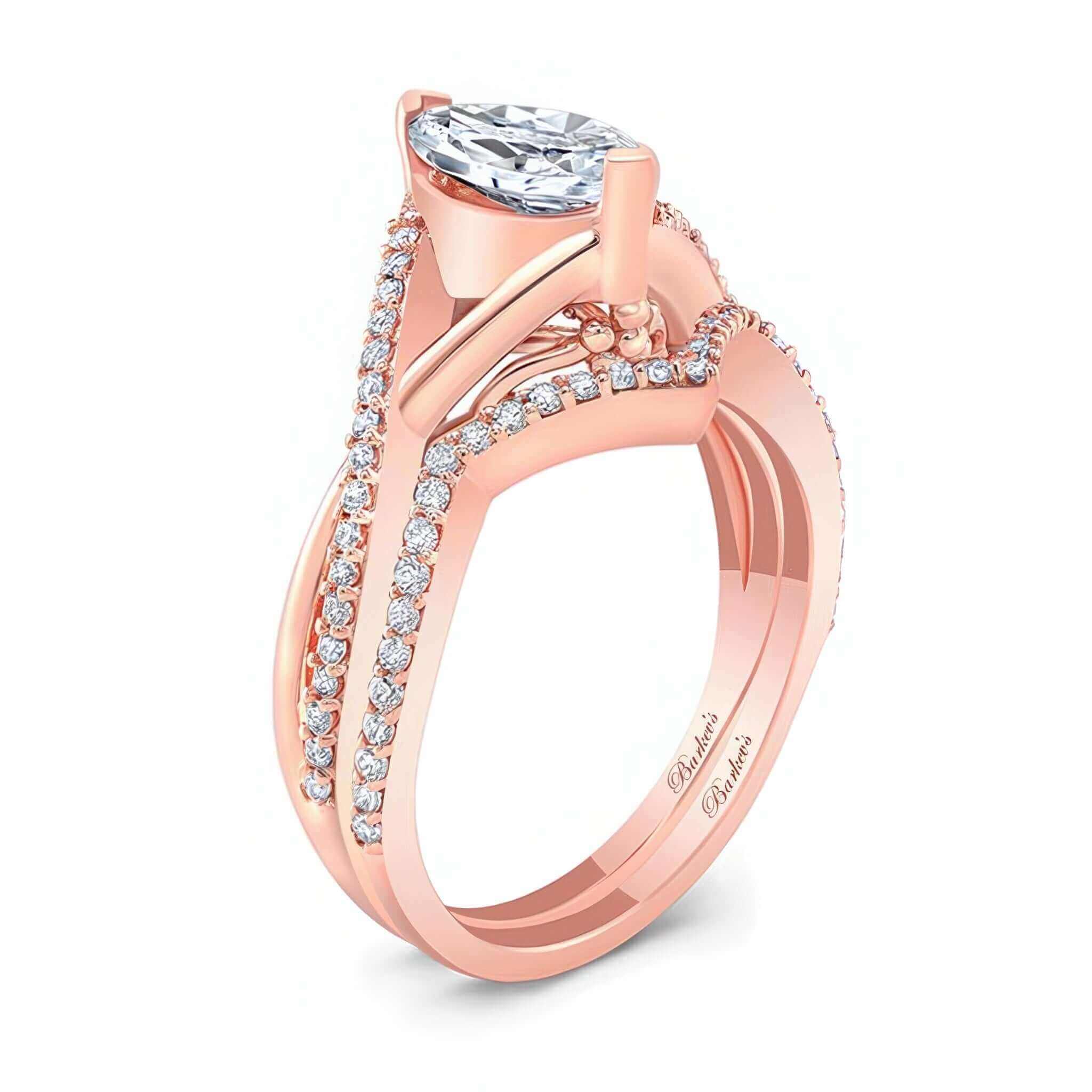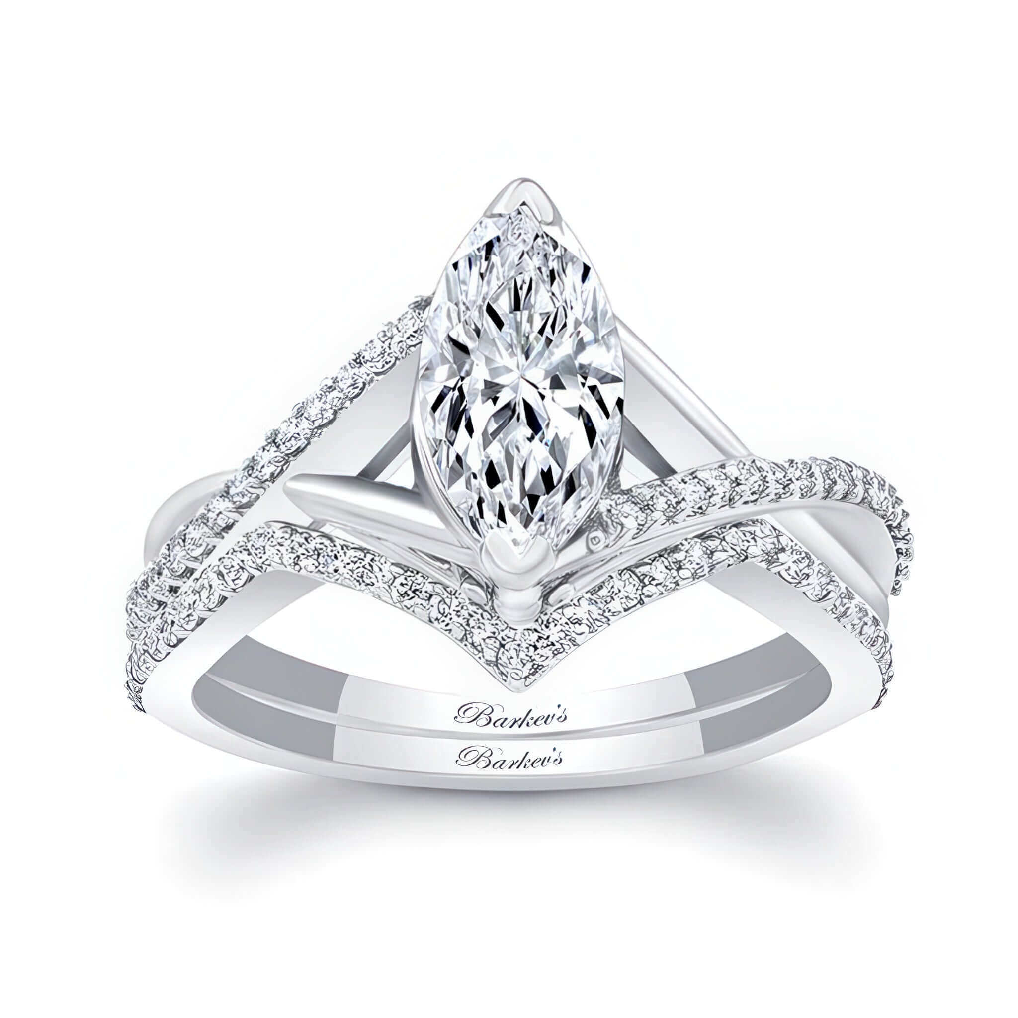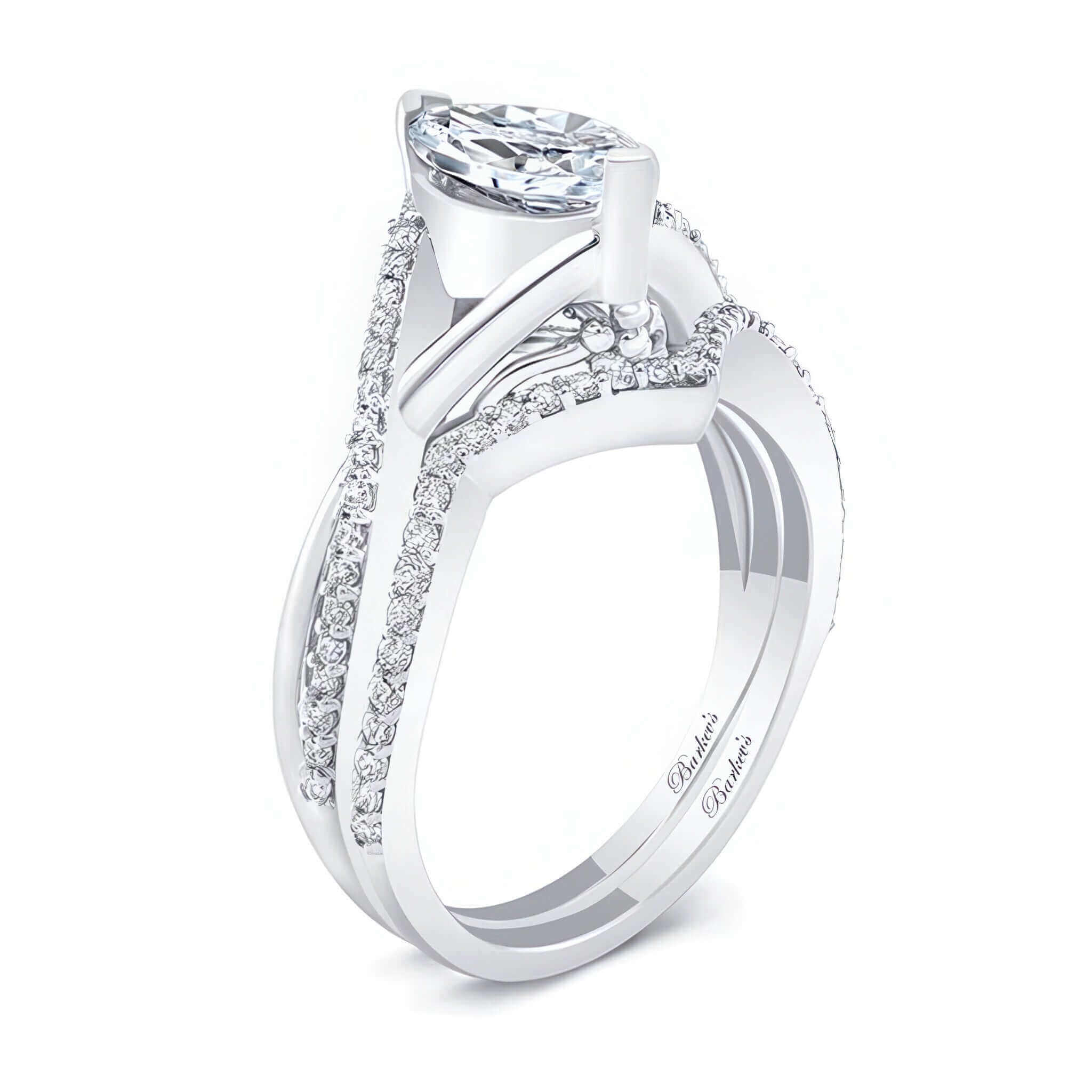 This 1 carat marquise diamond ring set features an overlapping diamond shank, a prong set marquise center and flower motif. Comes with a matching diamond wedding band.