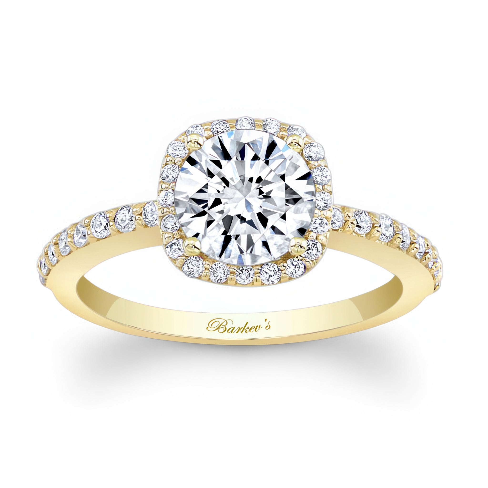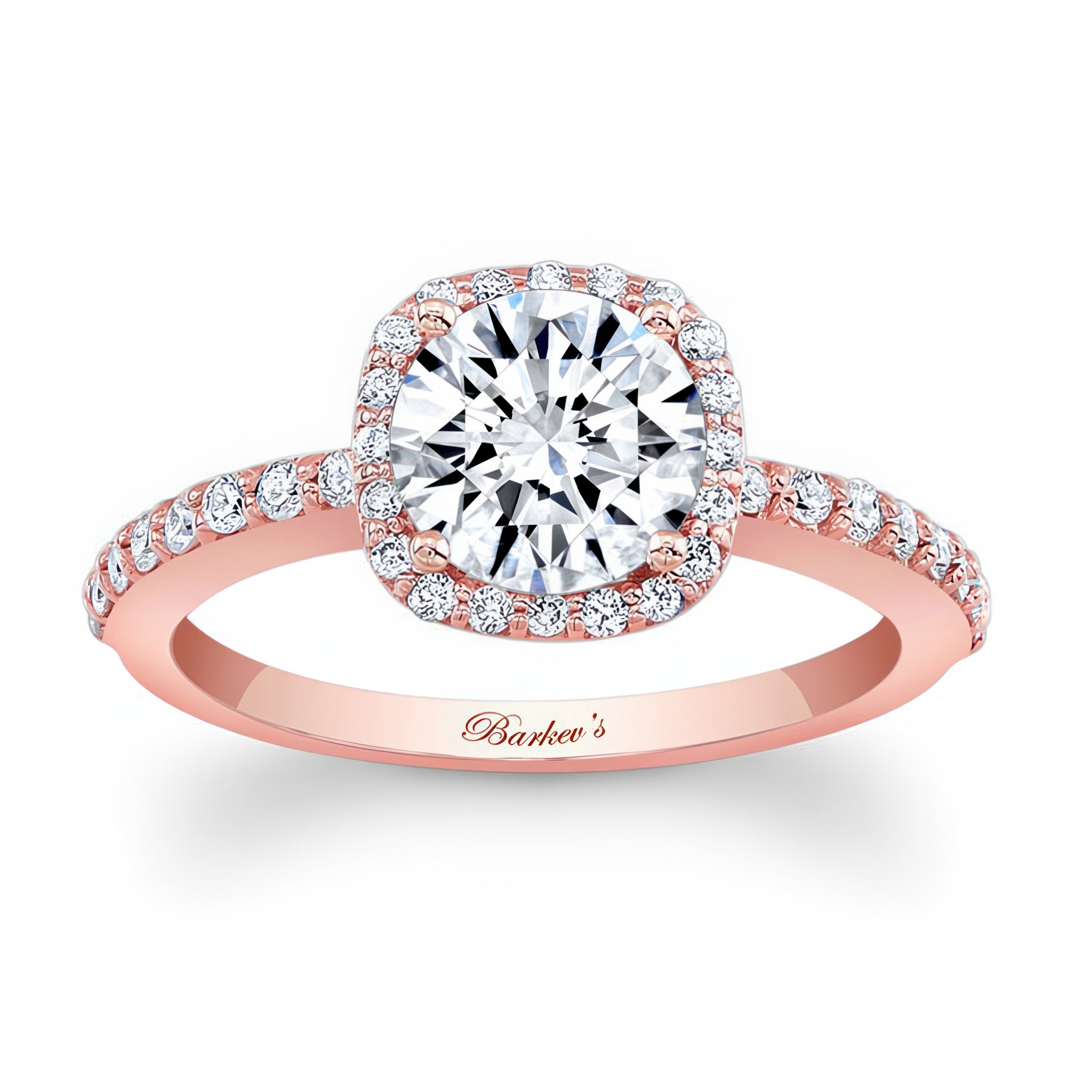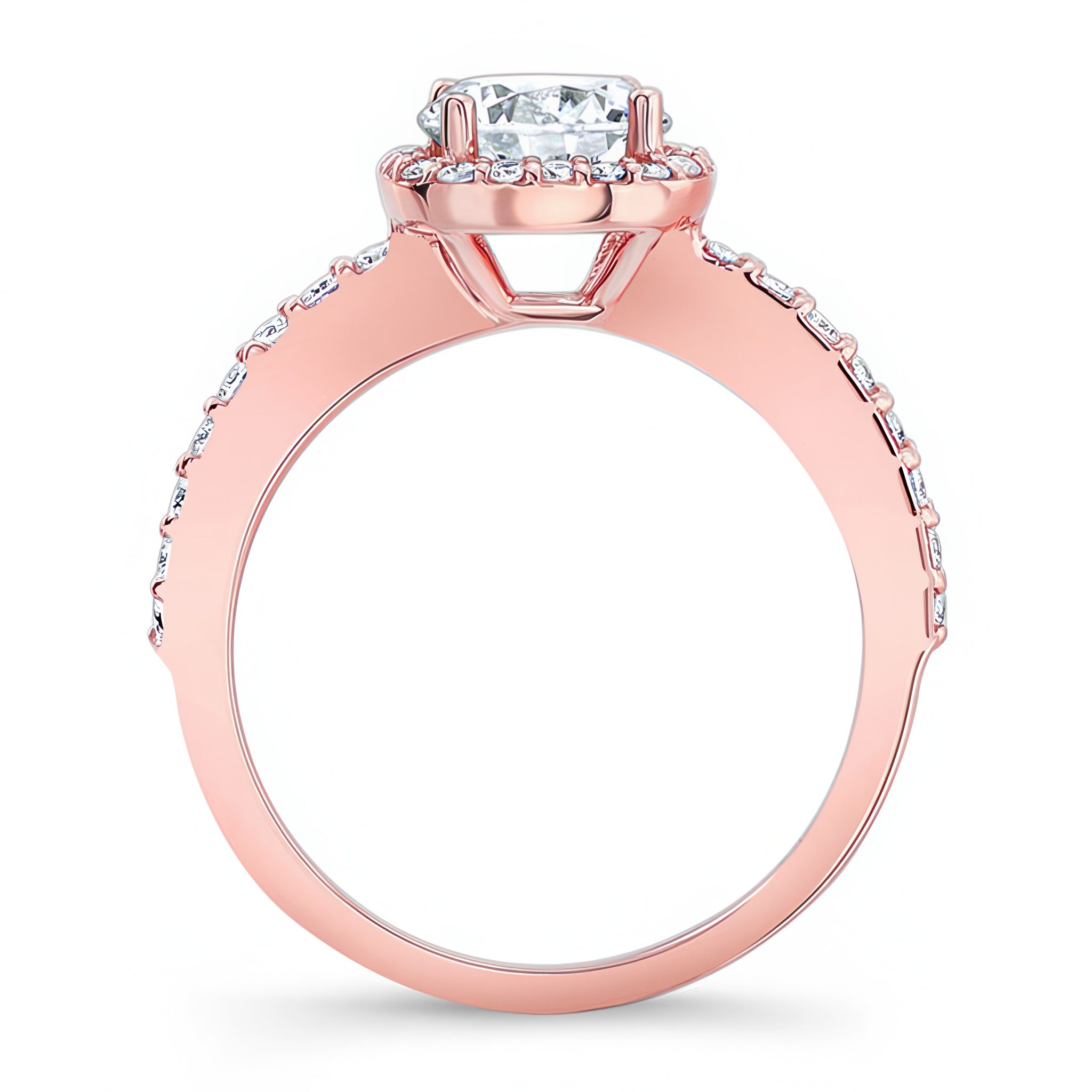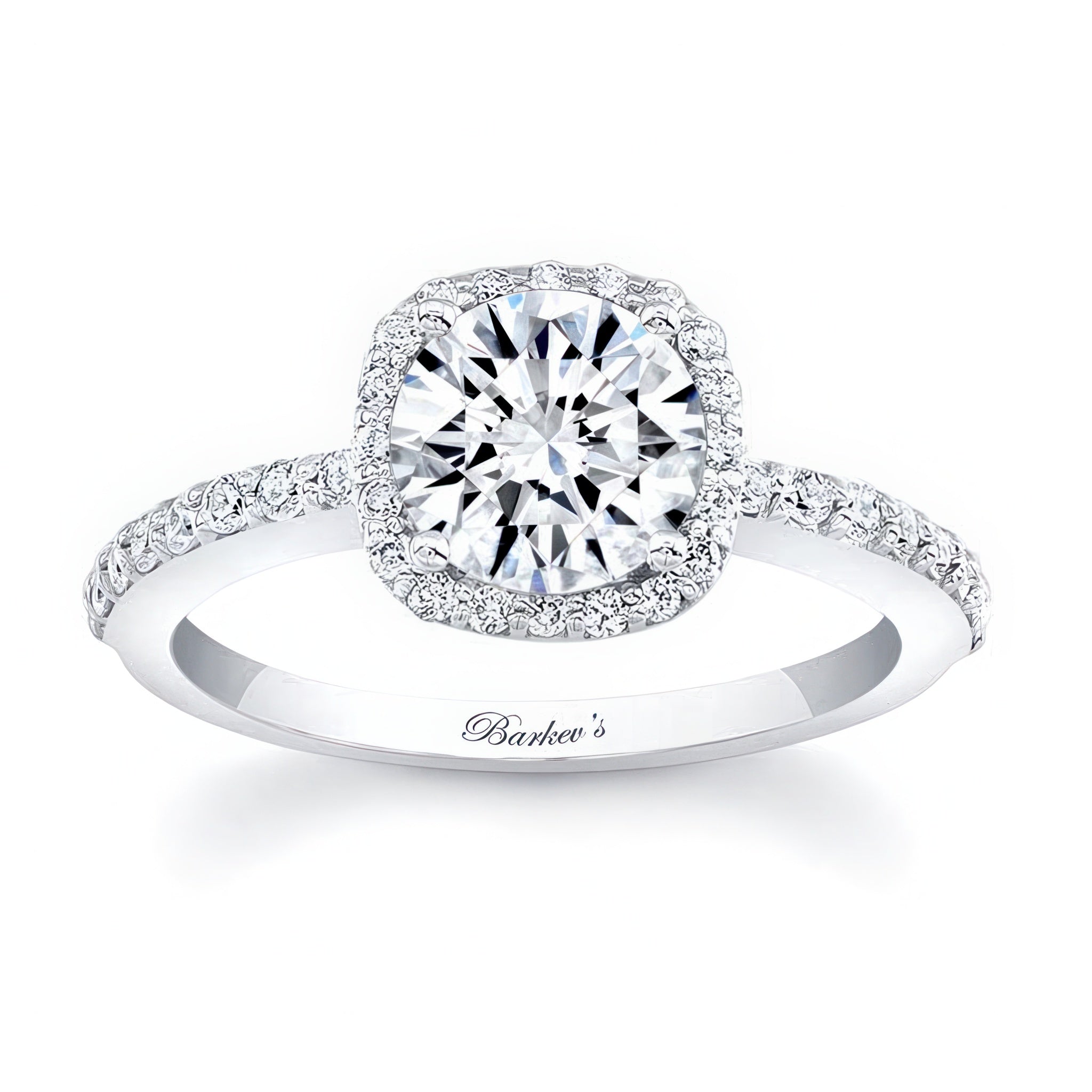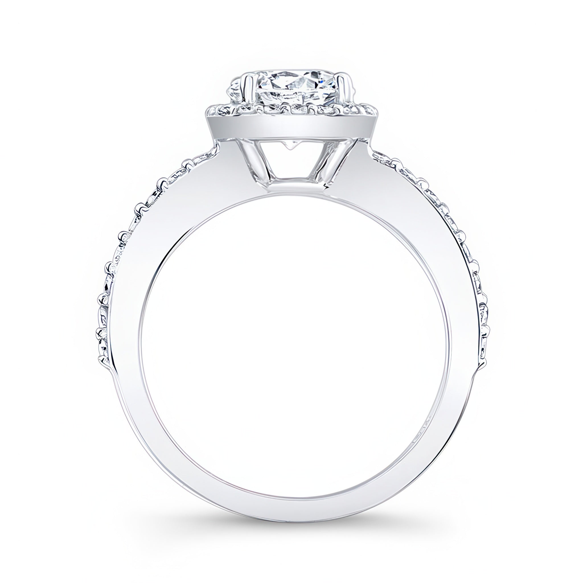 This 1 carat round diamond halo engagement ring features a shared prong set diamond halo around the low profile center and diamonds cascading down the dainty shank for a look of sheer elegance.