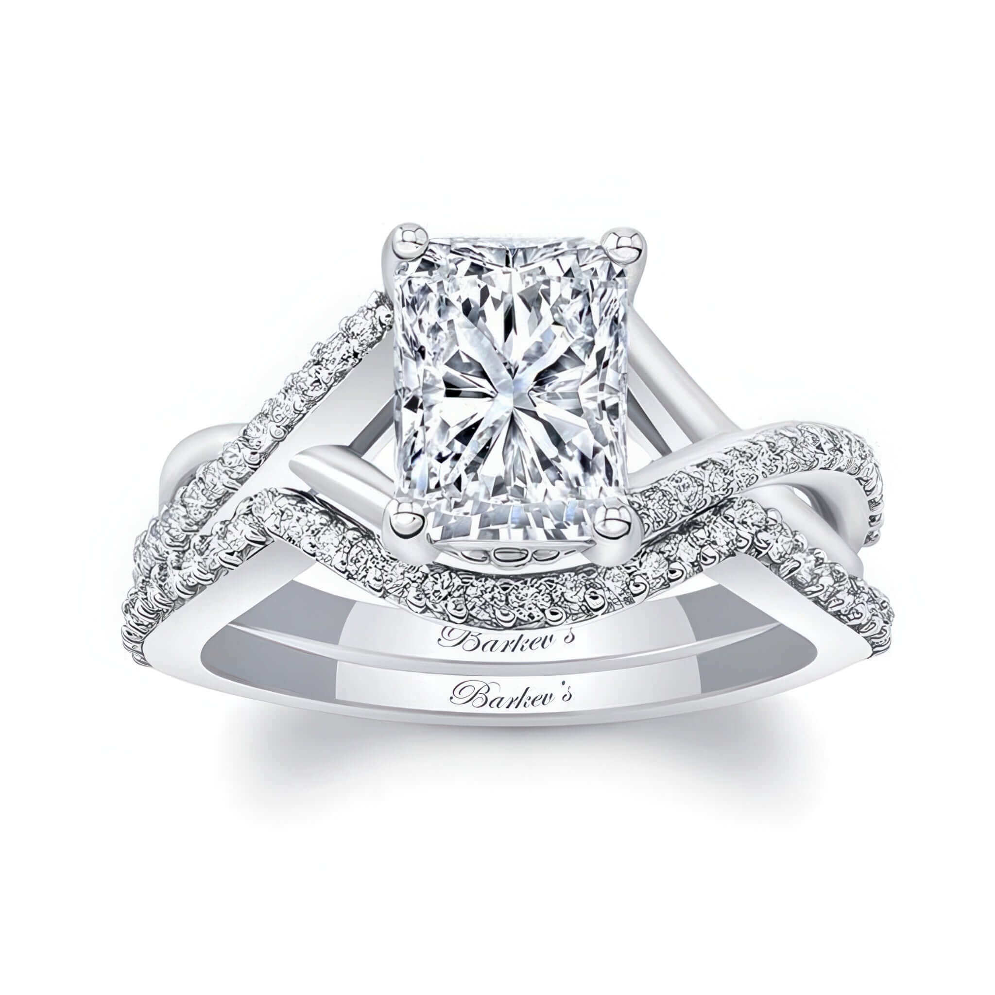 This 2 carat radiant cut diamond ring set will turn heads with it's overlapping diamond shank, large center stone and flower motif. Comes with a diamond wedding band.