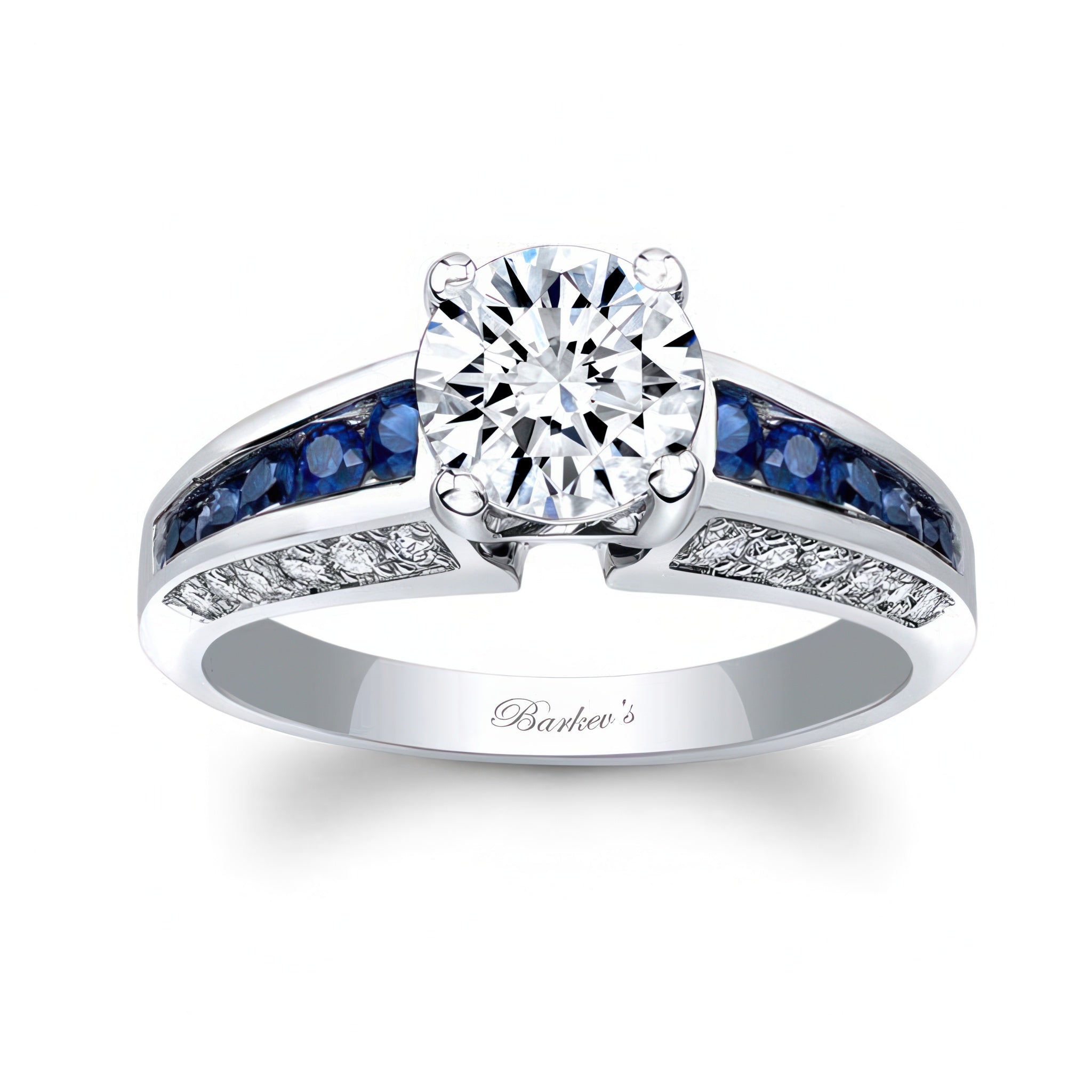 This magnificent blue sapphire accent channel set ring boasts with sparkle from every angle featuring beveled edges and a round center that is met by a row of channel set blue sapphires and pave white diamonds adorning each side of the shank for an unparalleled brilliance.
