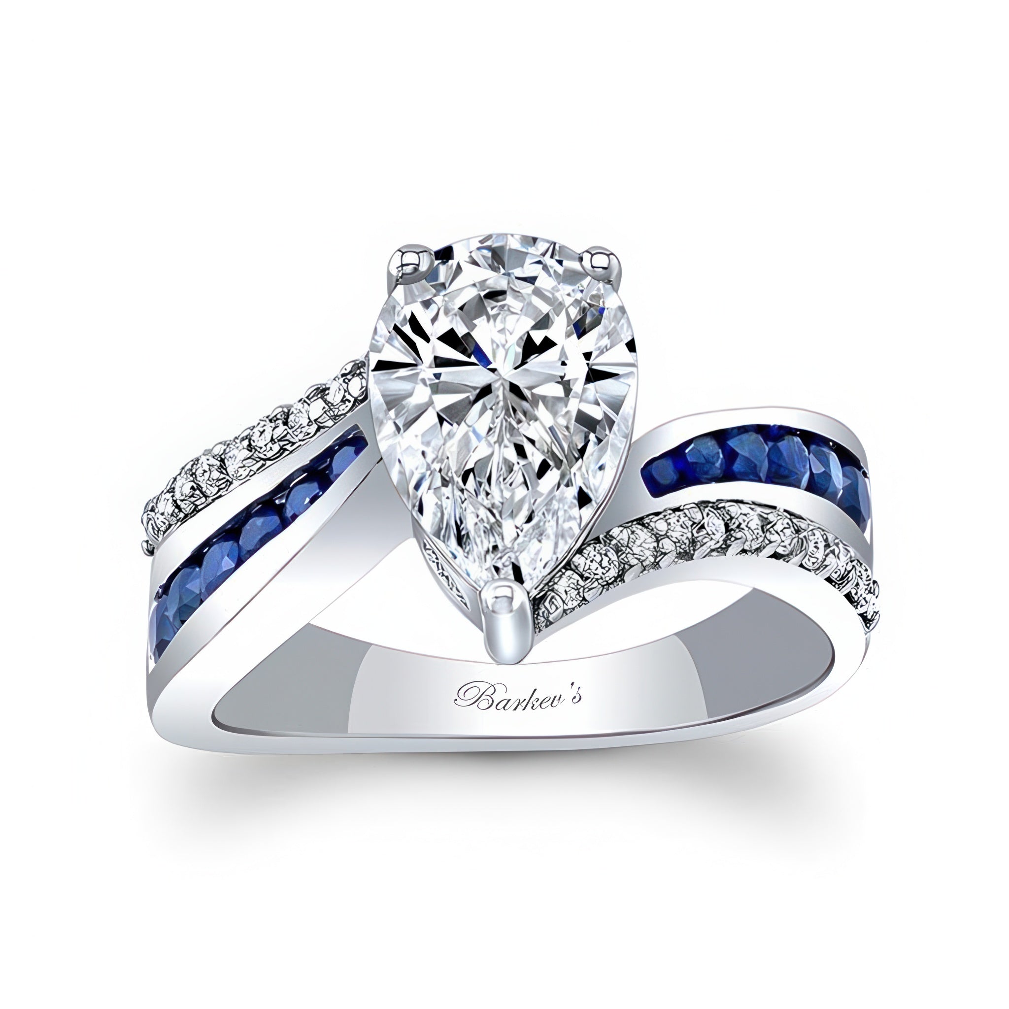 A stunning blue sapphire accent pear shaped ring featuring an almond shaped center stone with channel set sapphires and shared prong set diamonds adorning the band.