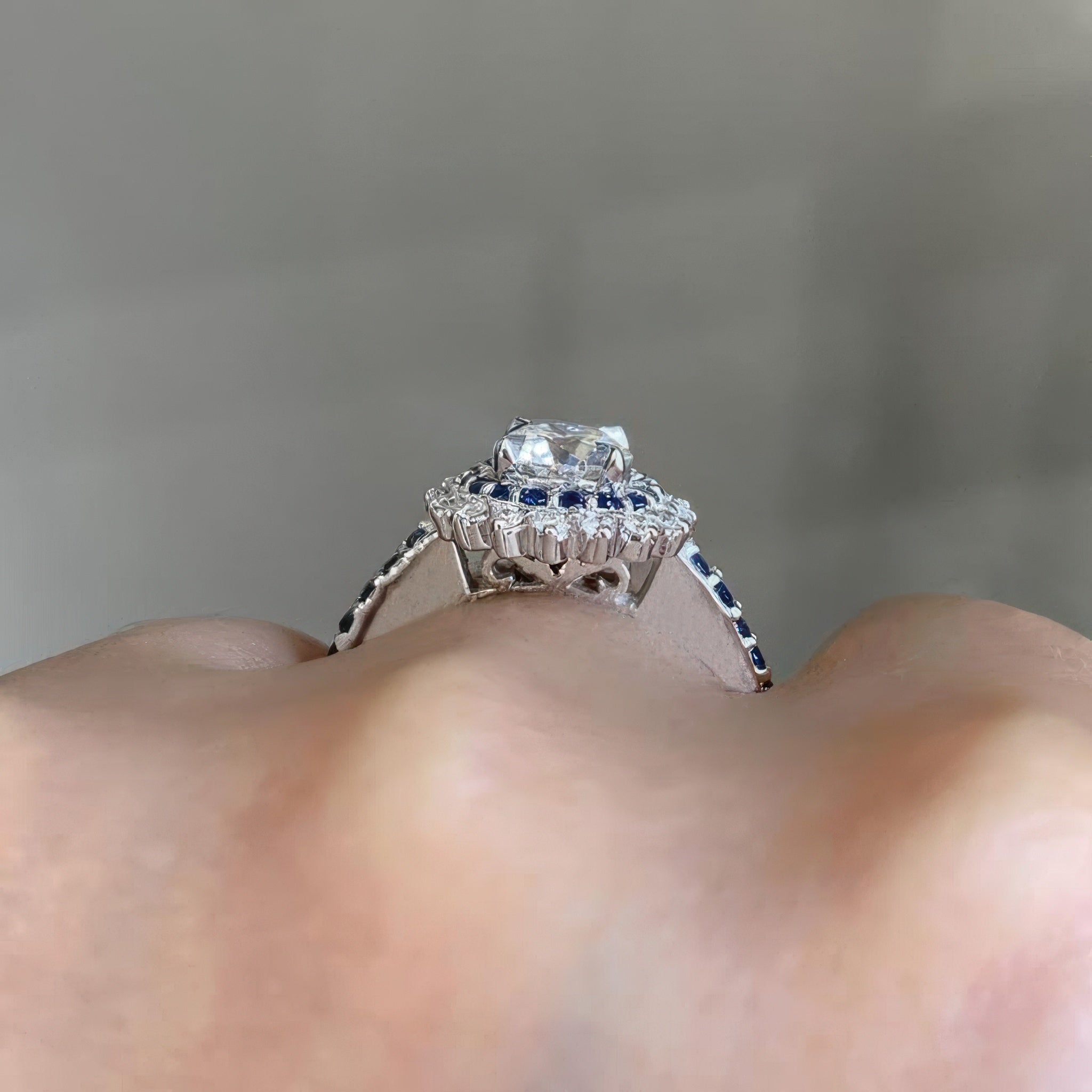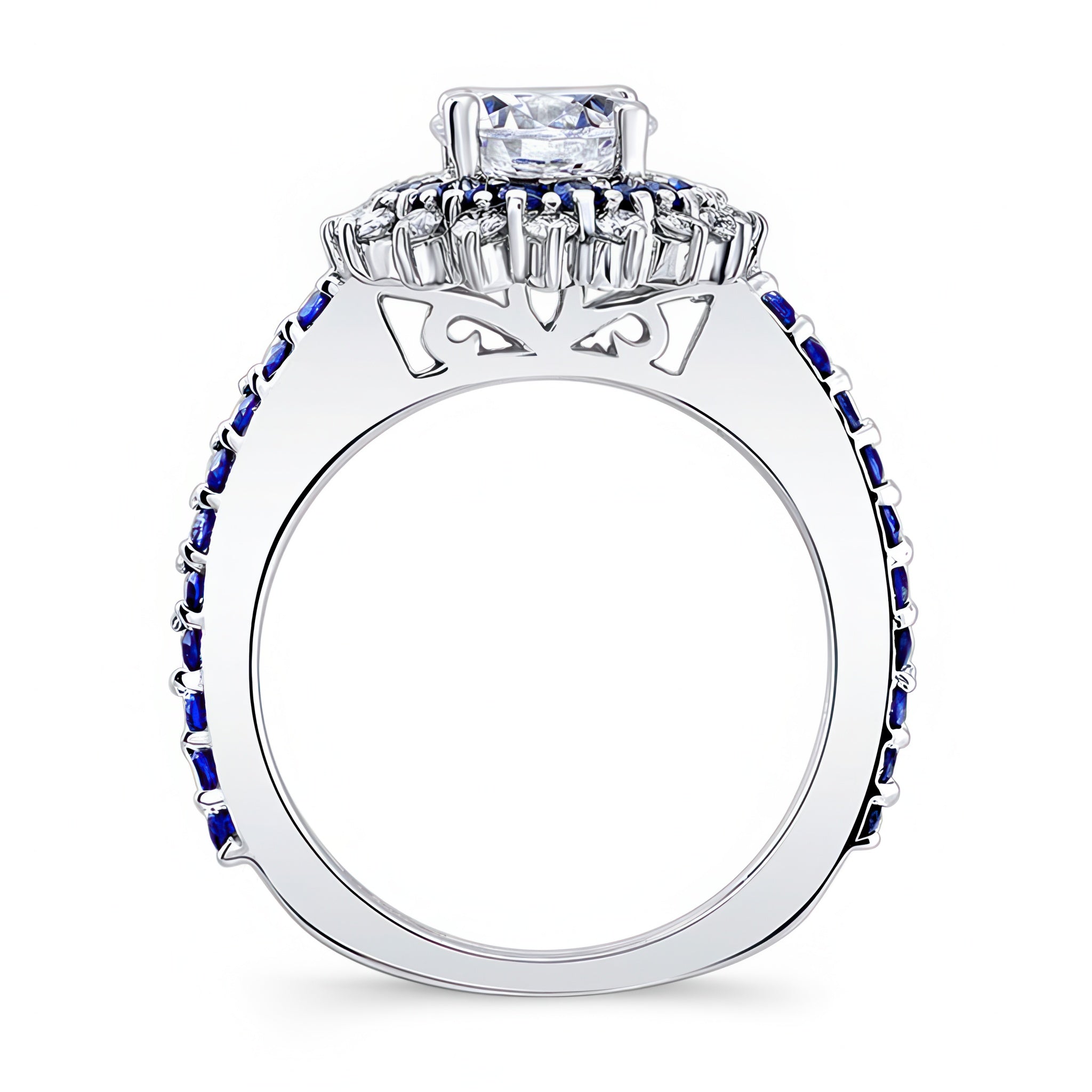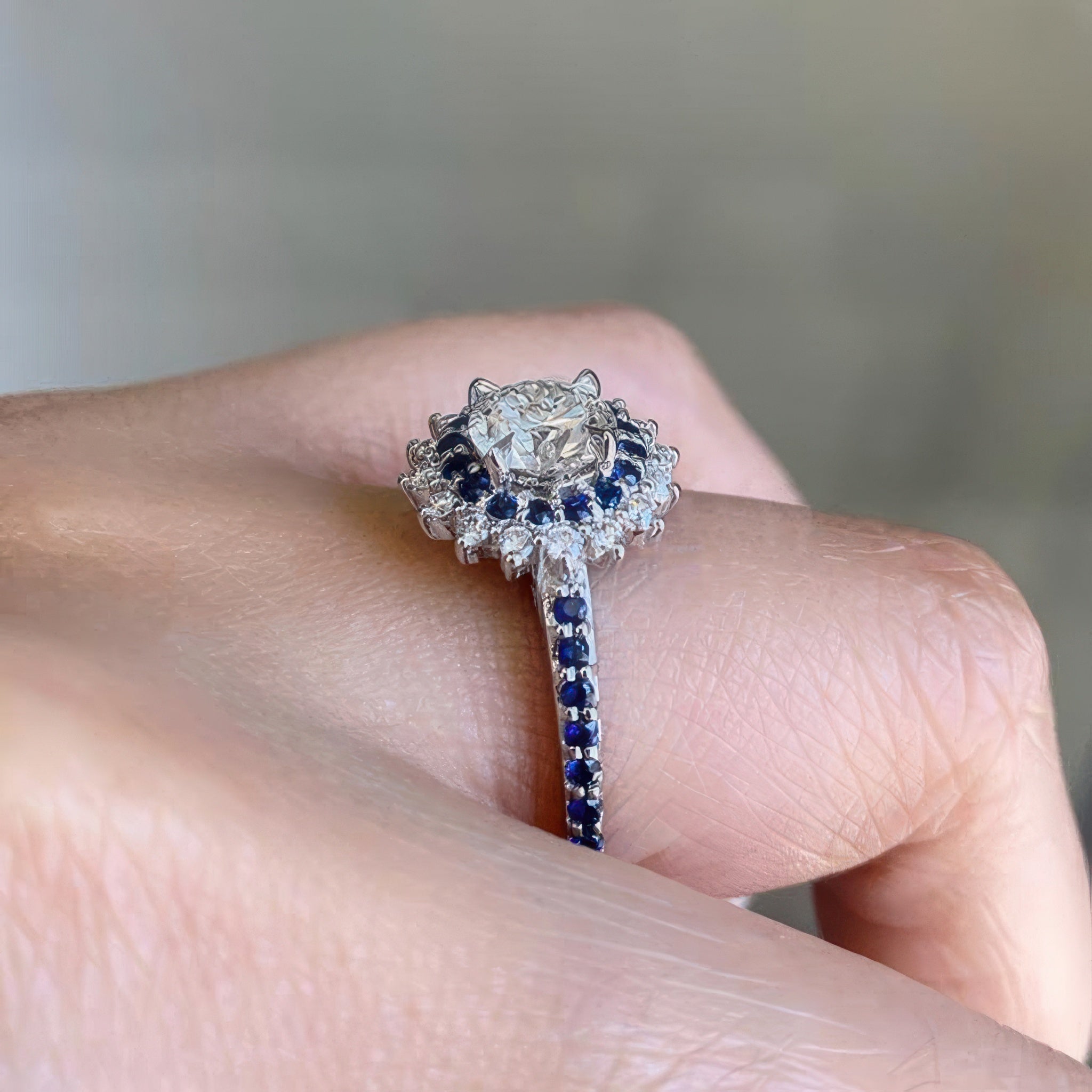 This unique blue sapphire accent sunflower ring features a prong set round center encircled with two rows of halo blue sapphire and diamond melees. The dainty shank is adorned with shared prong set blue sapphires running down the shoulders for an elegant finish.