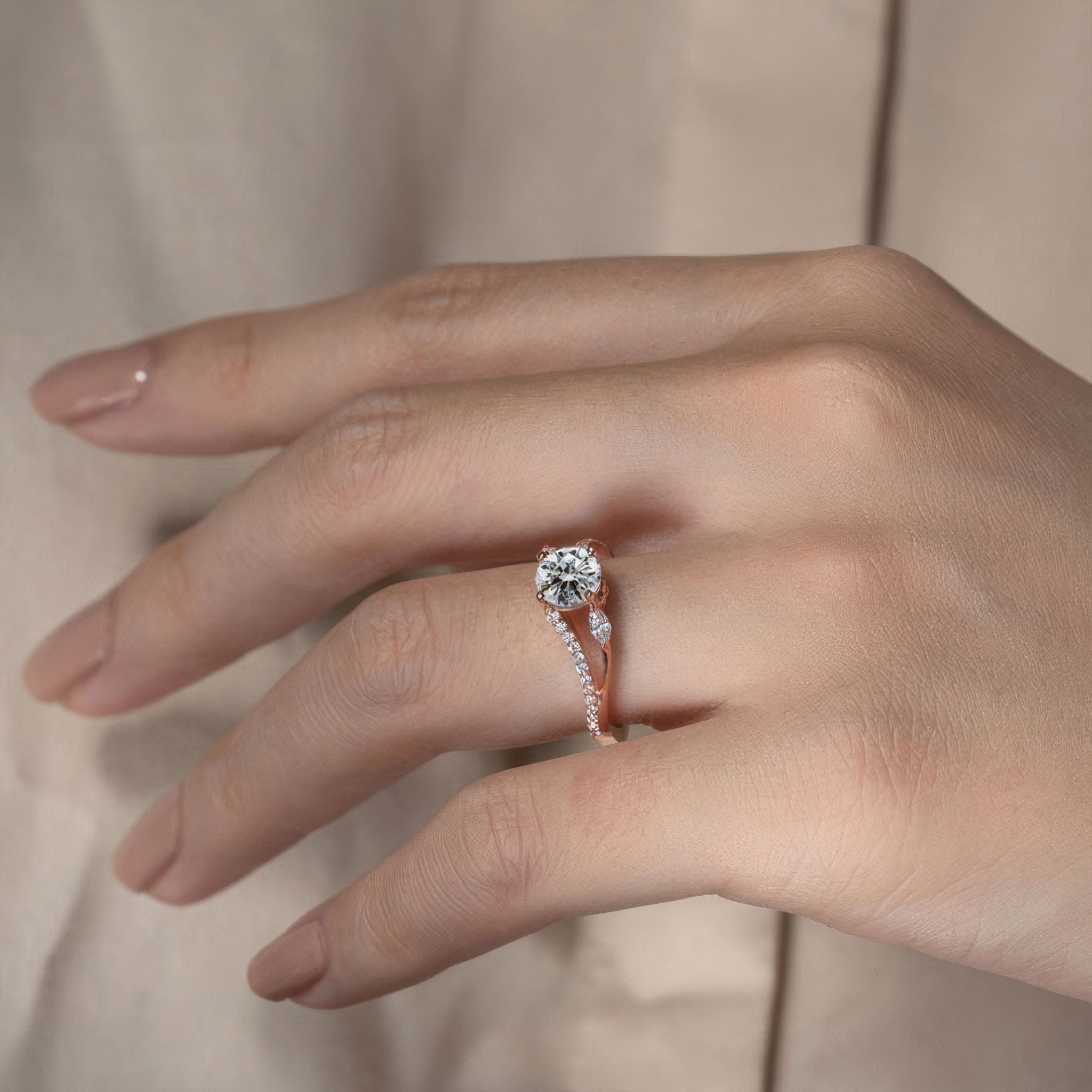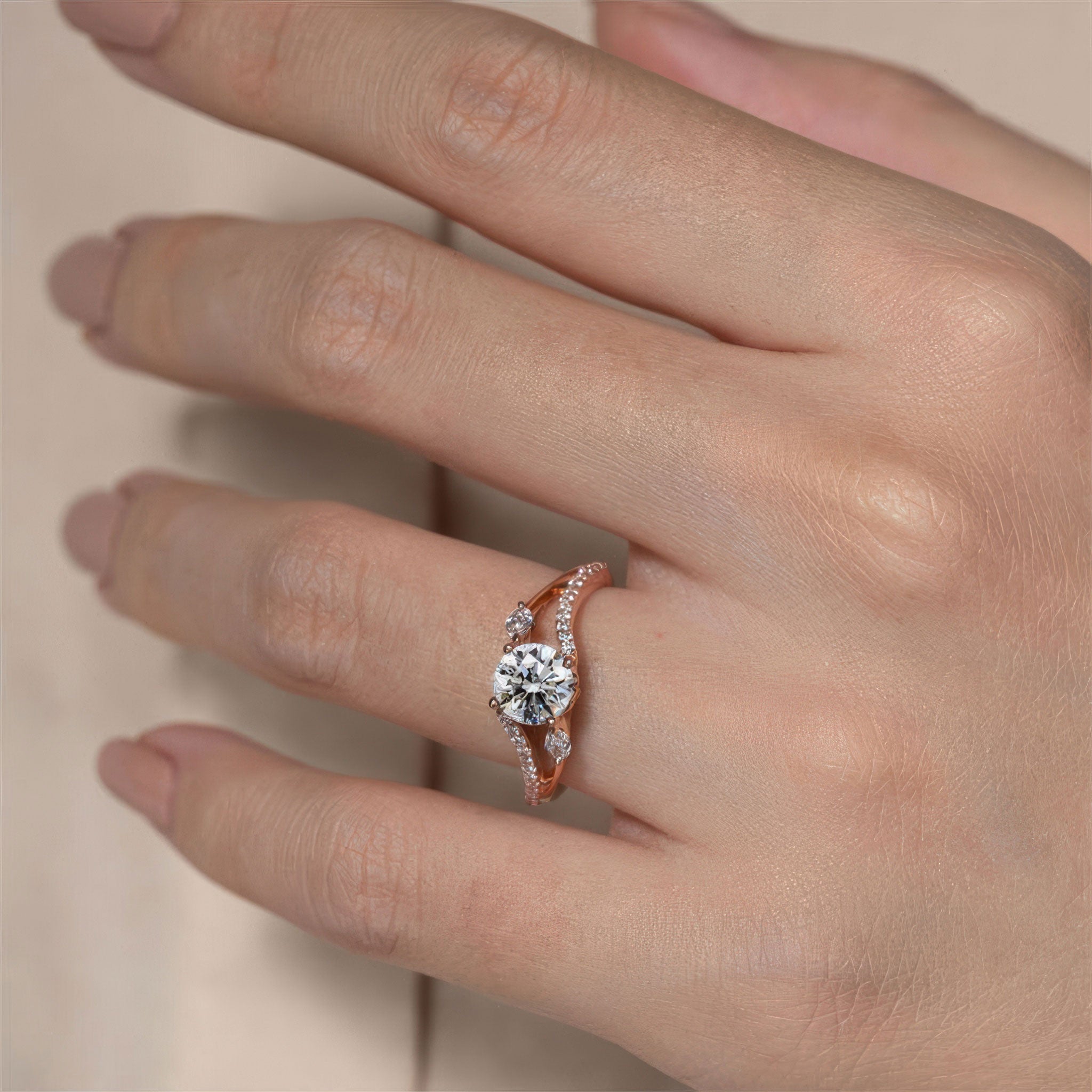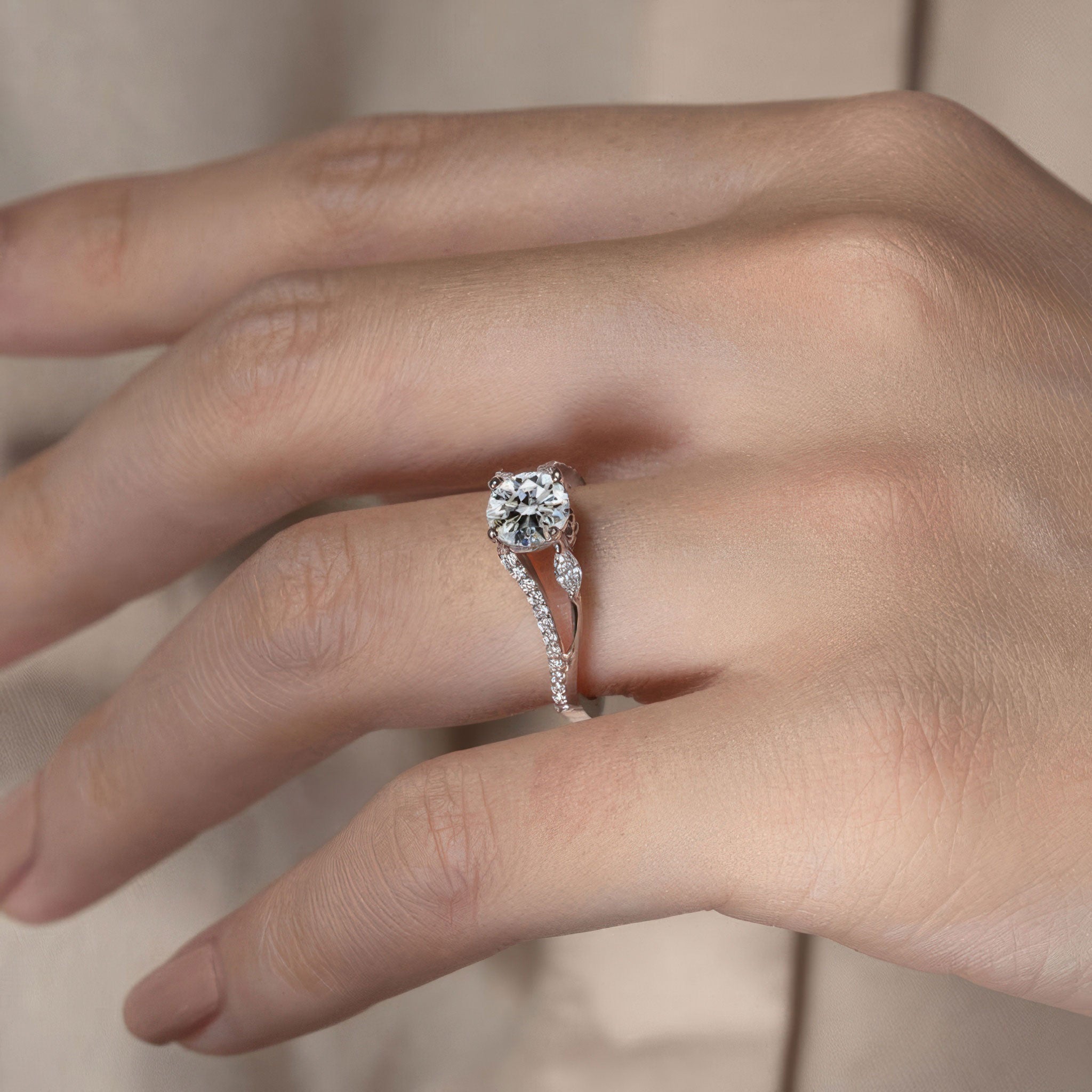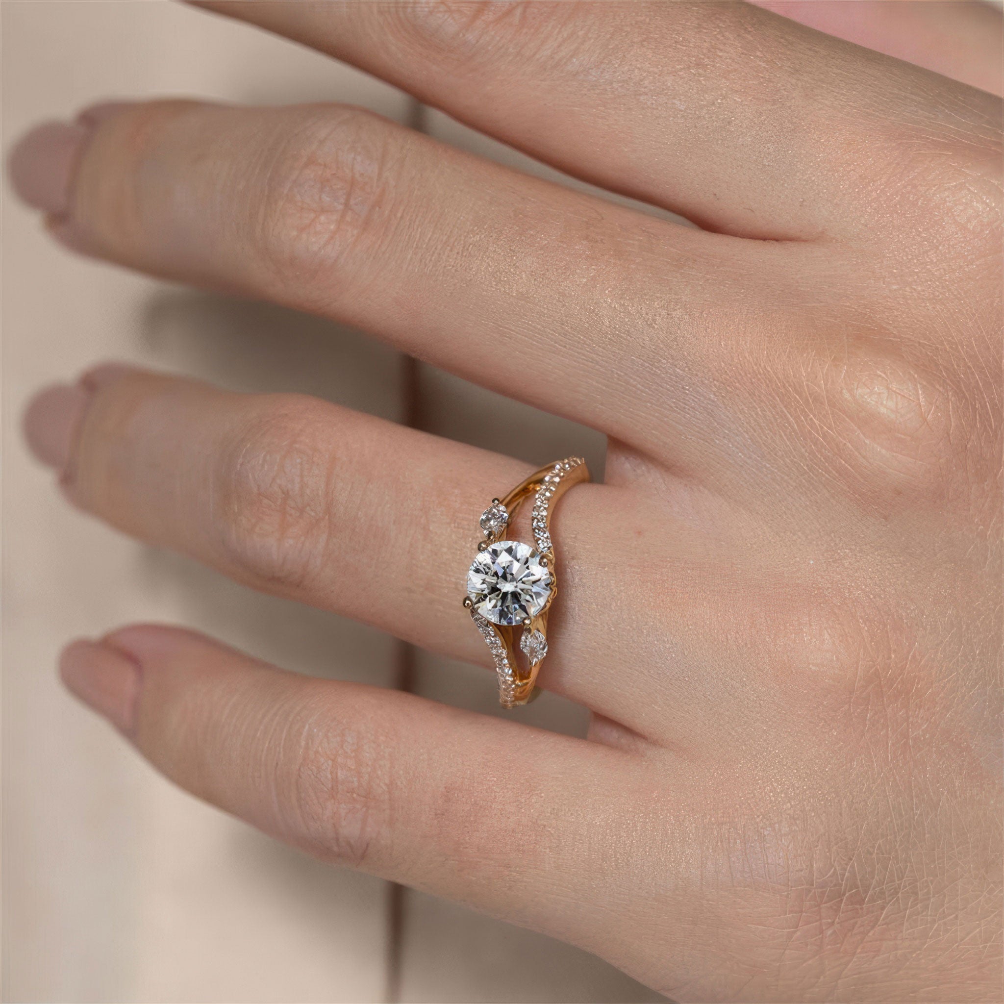 An impressive curved split shank diamond ring featuring a prong set round center accented with round and marquise cut diamonds flanking the shoulders for a unique flare.