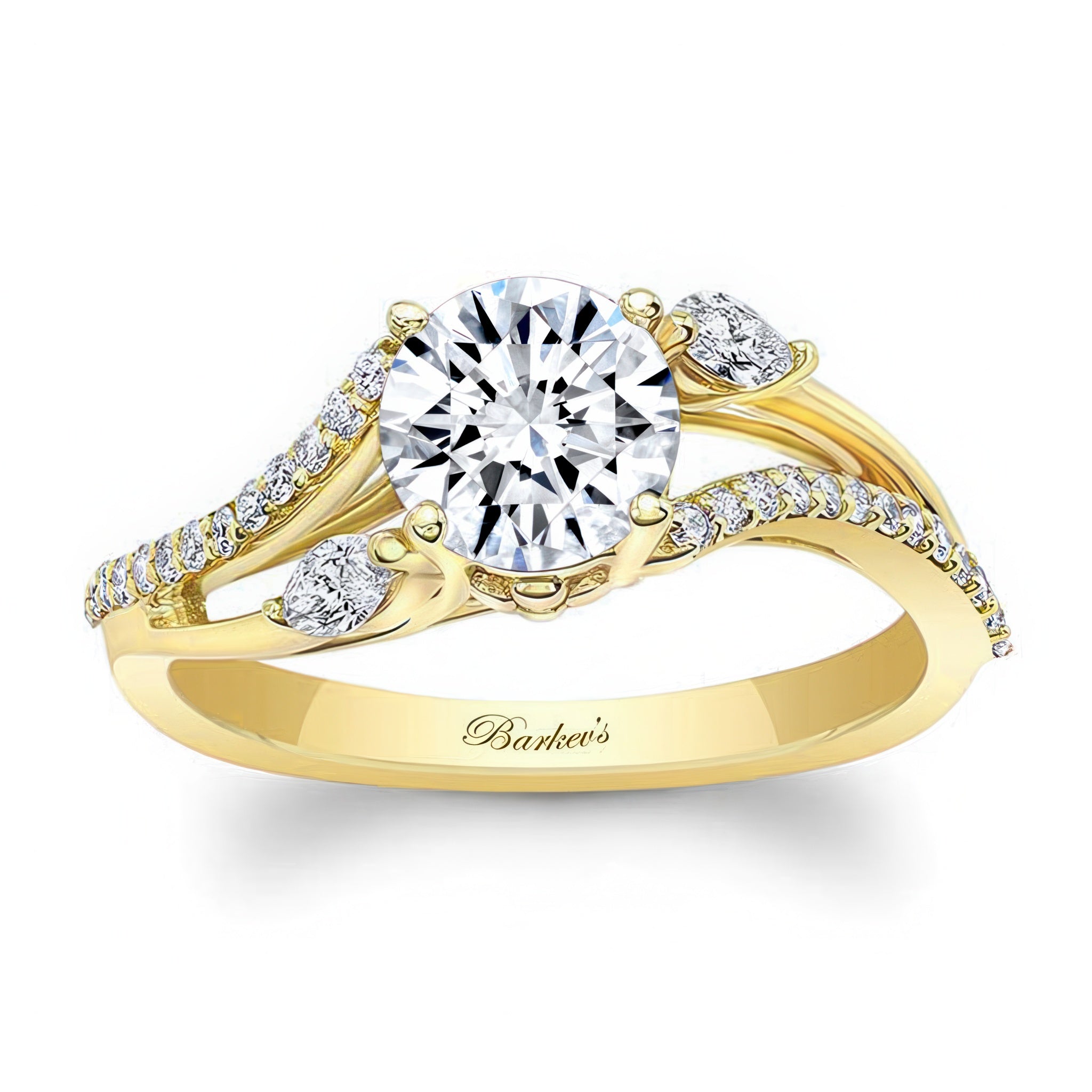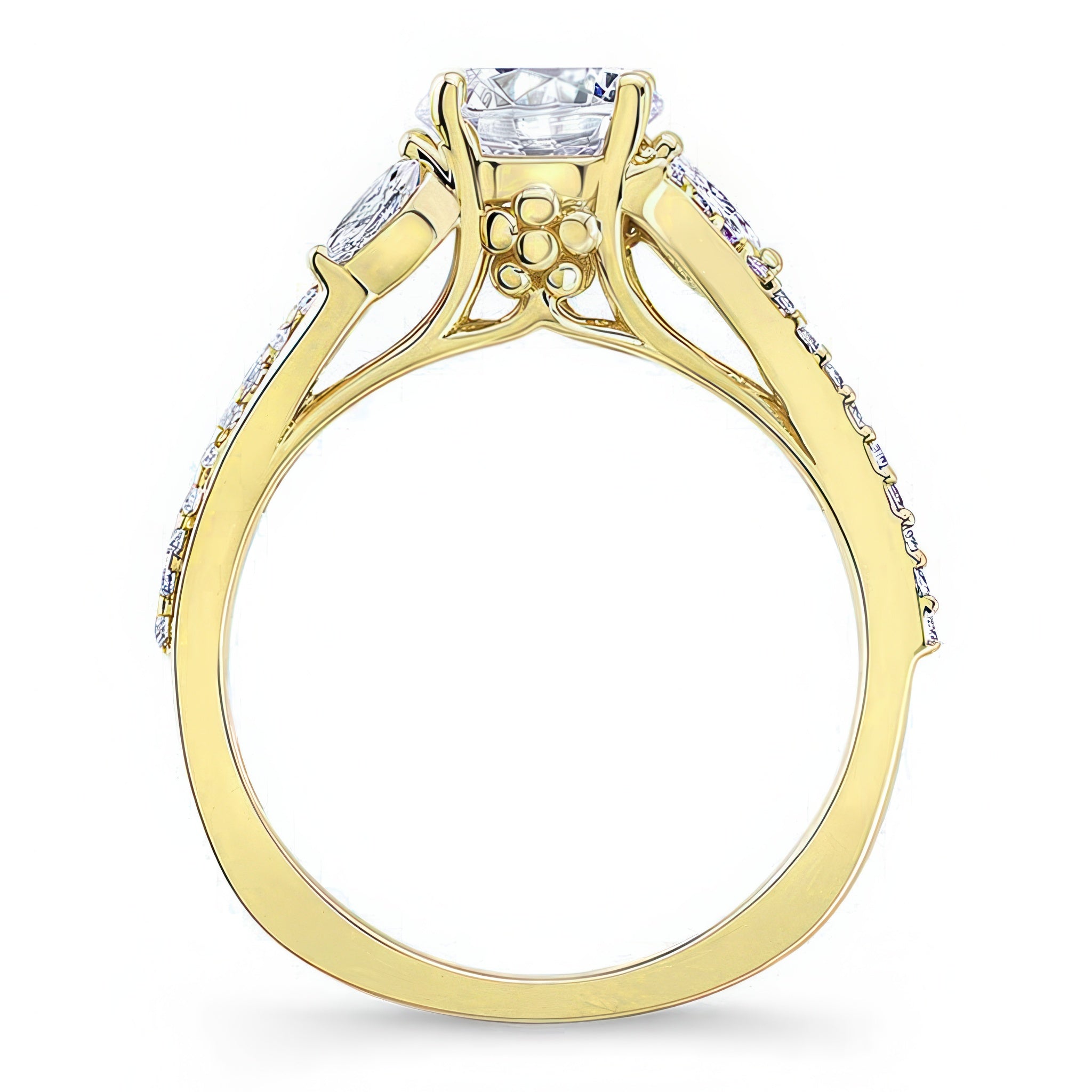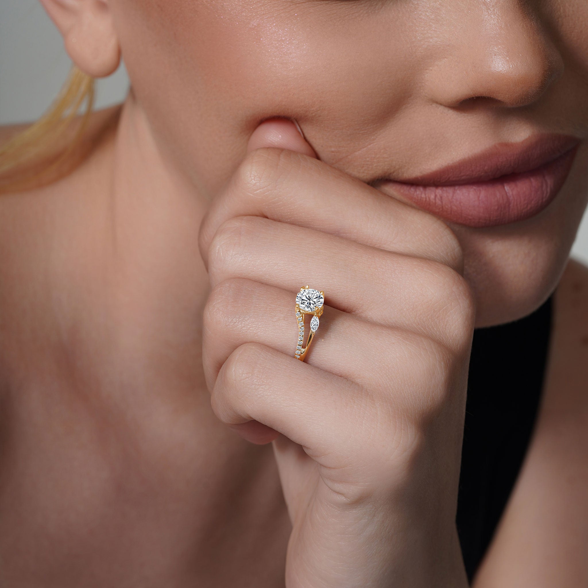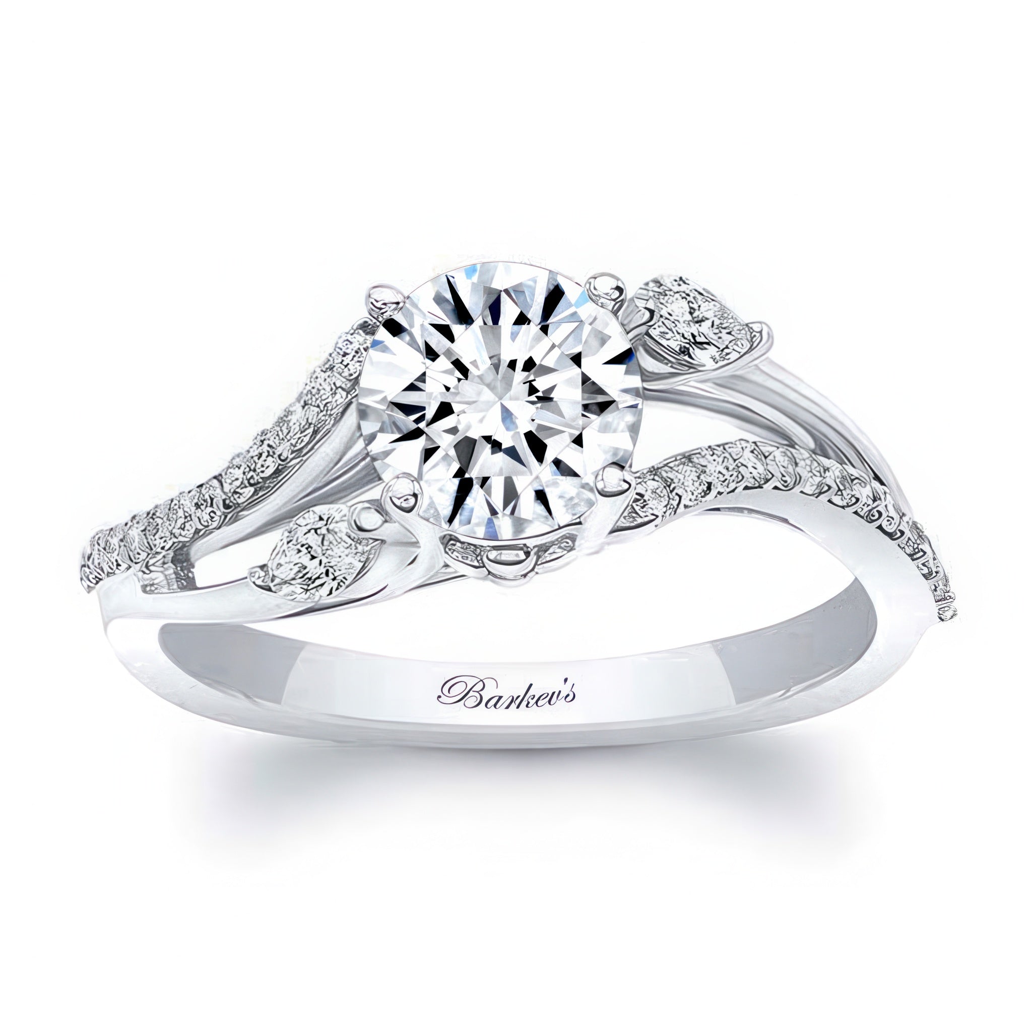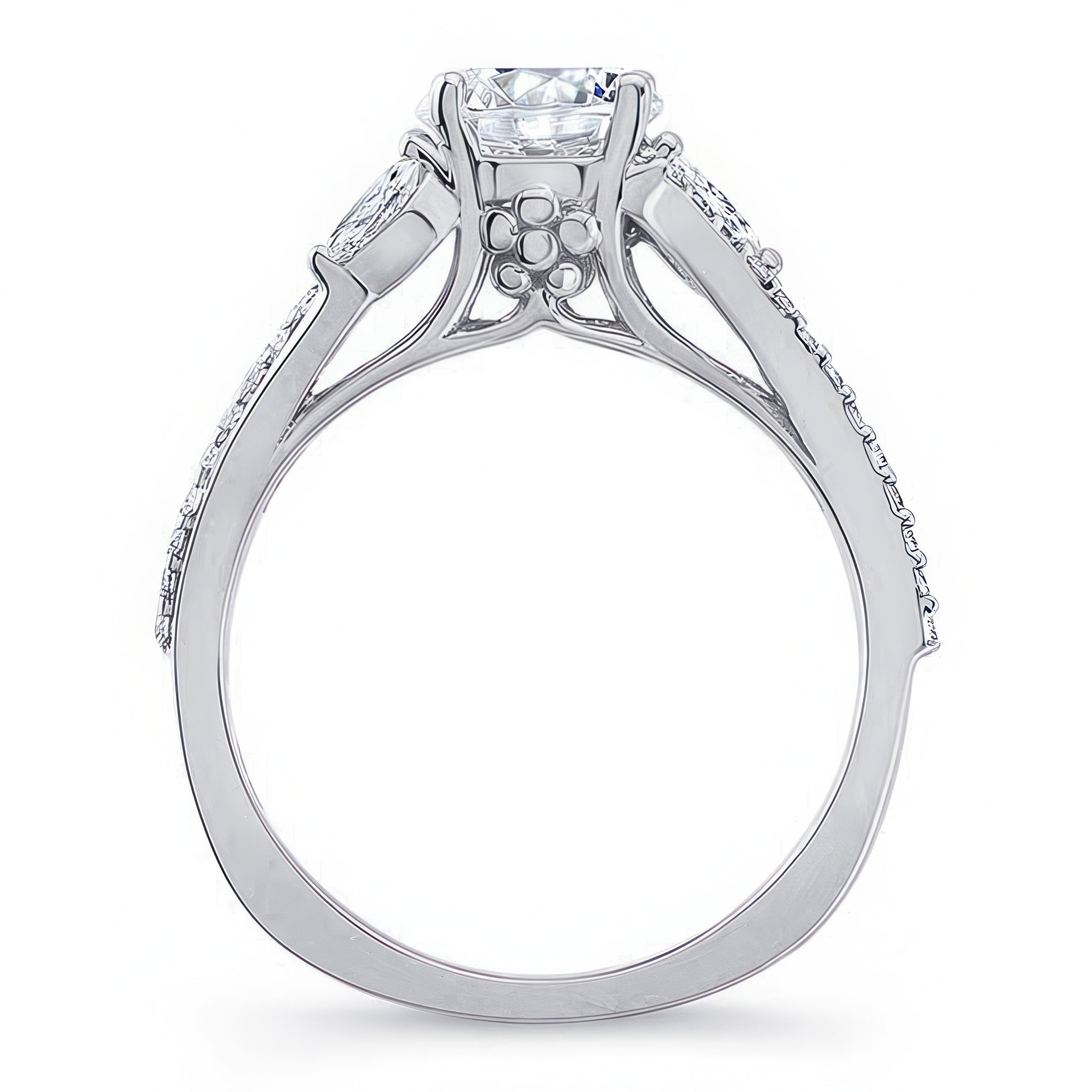 An impressive curved split shank diamond ring featuring a prong set round center accented with round and marquise cut diamonds flanking the shoulders for a unique flare.