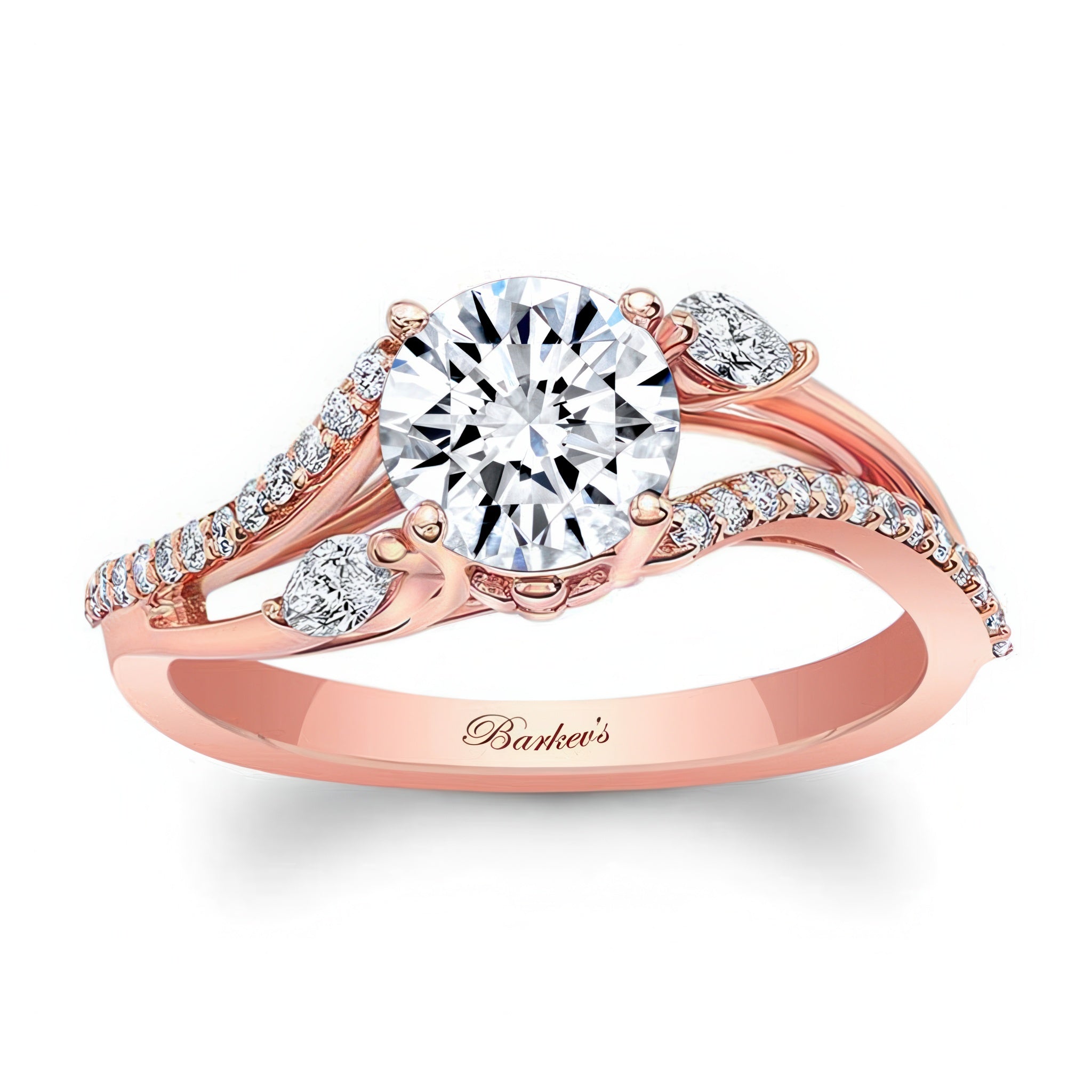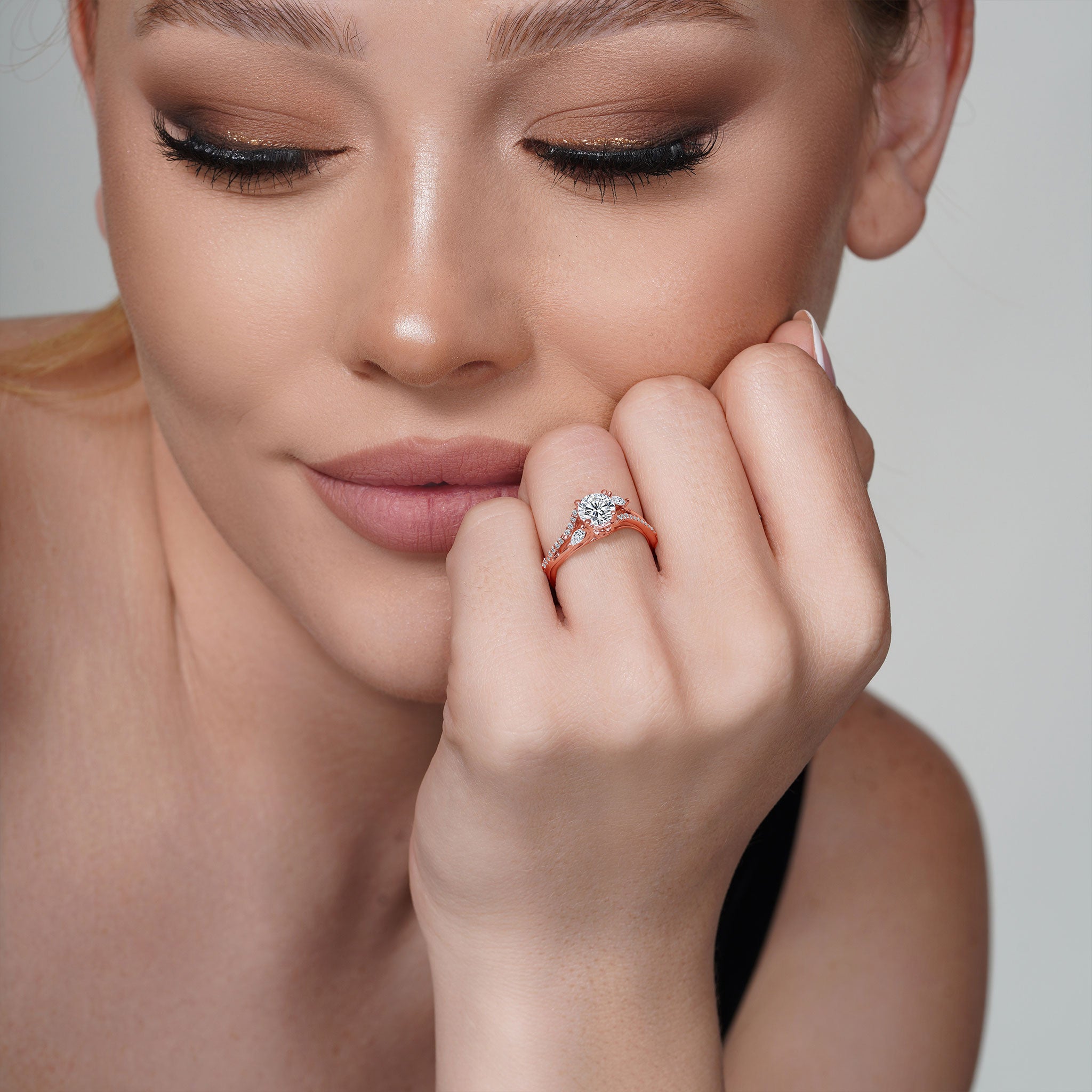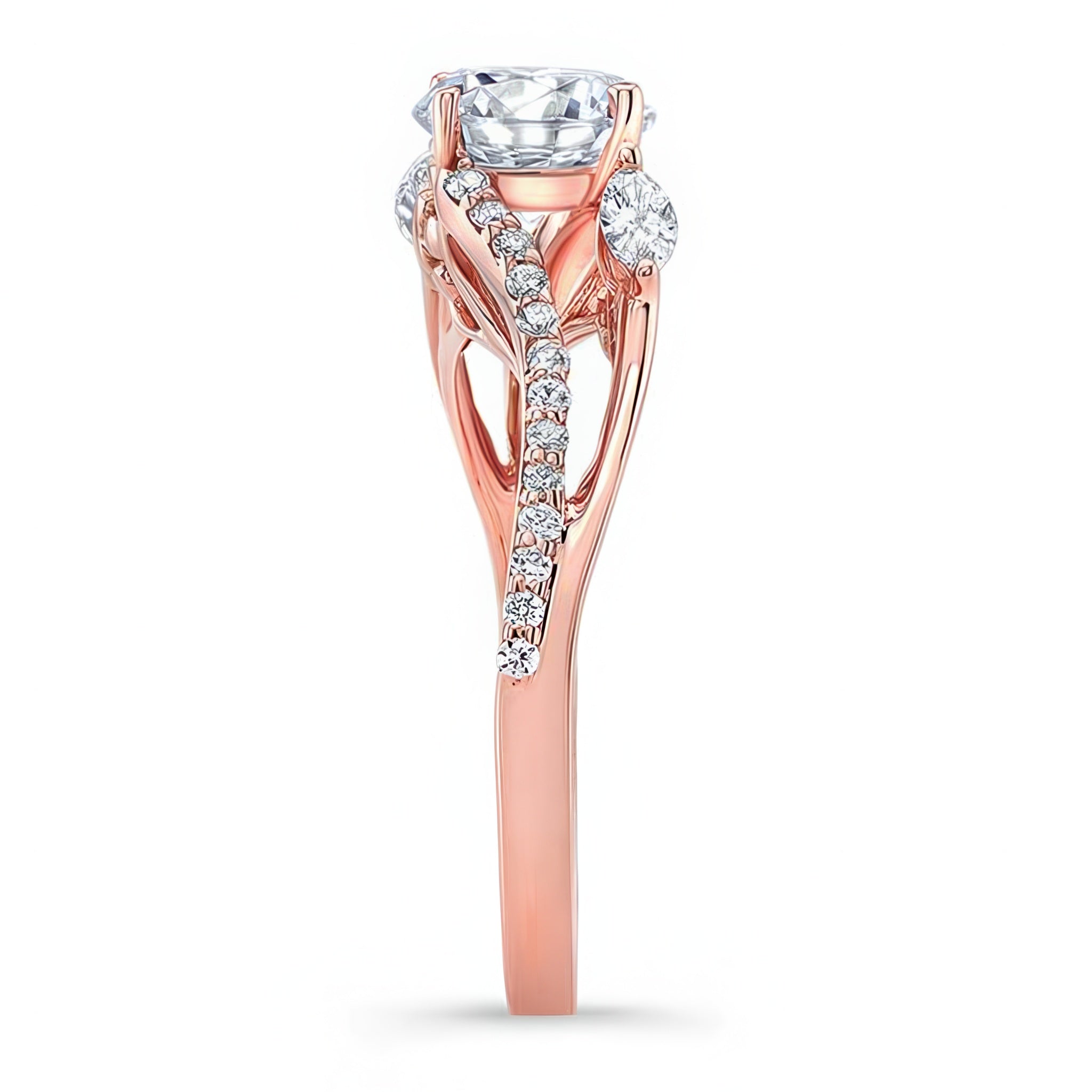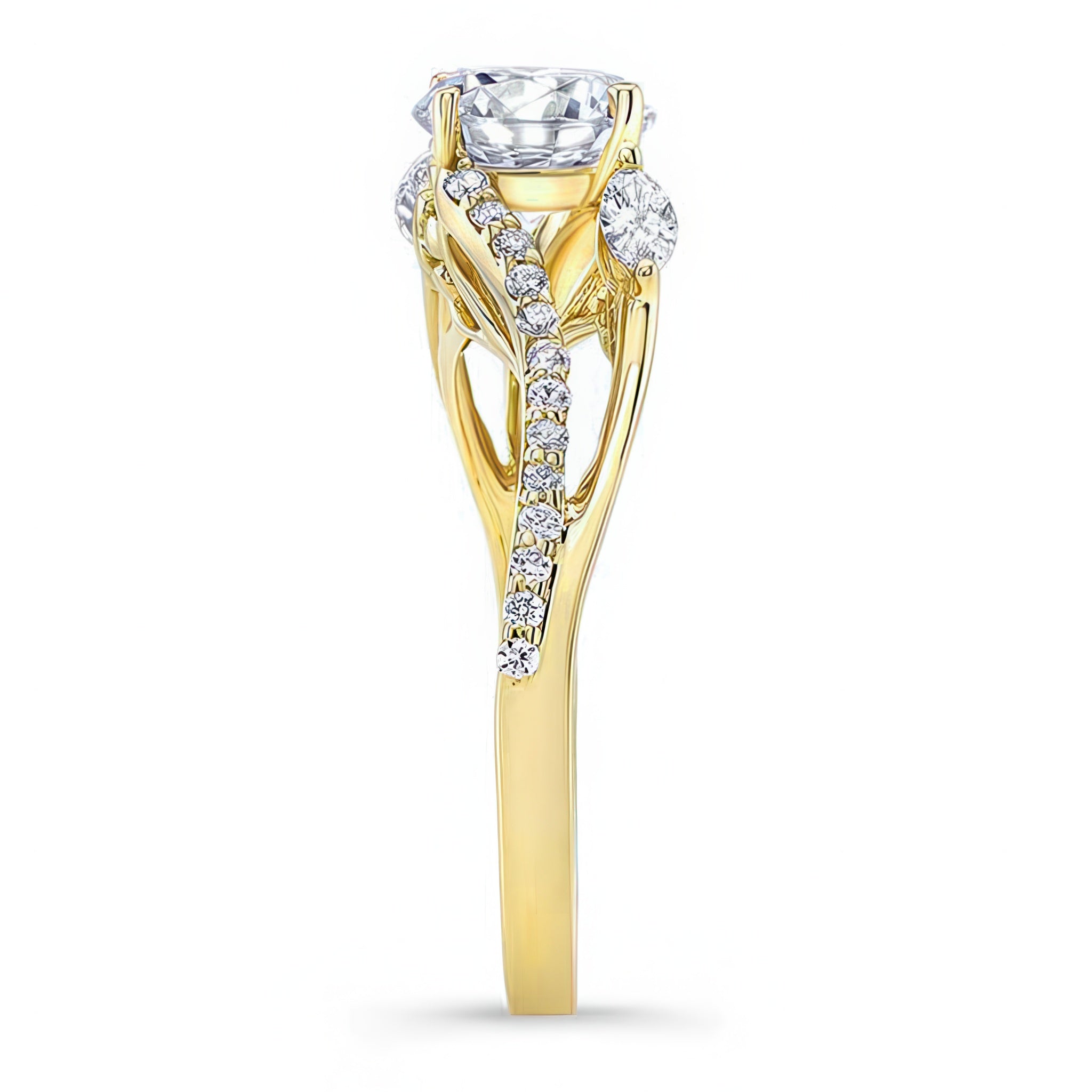 An impressive curved split shank diamond ring featuring a prong set round center accented with round and marquise cut diamonds flanking the shoulders for a unique flare.