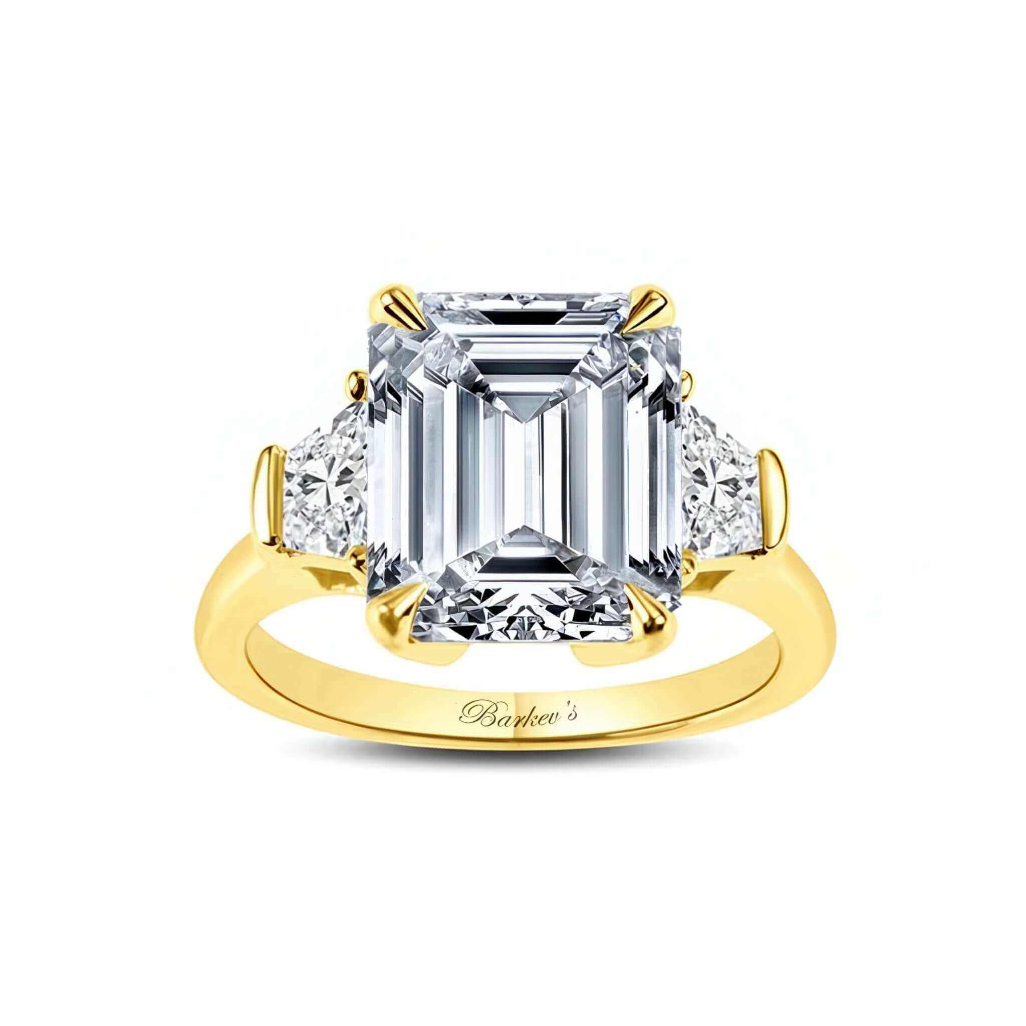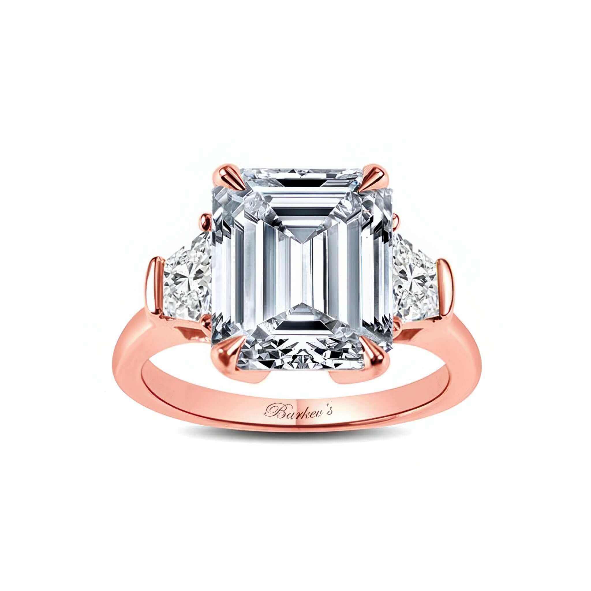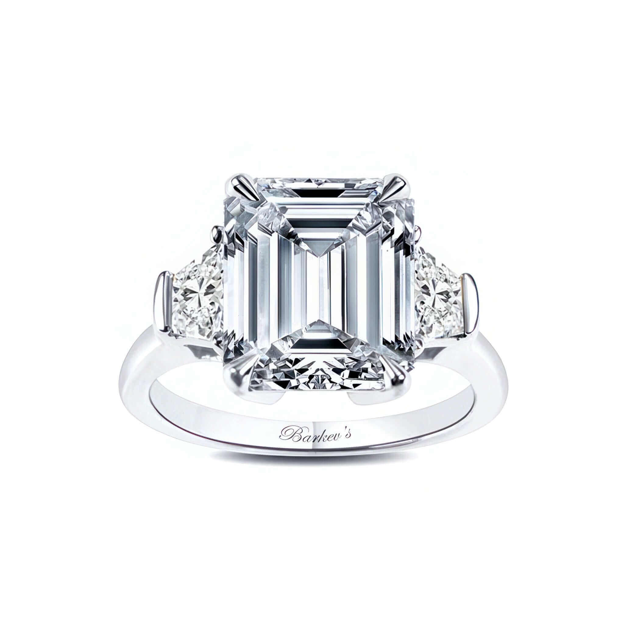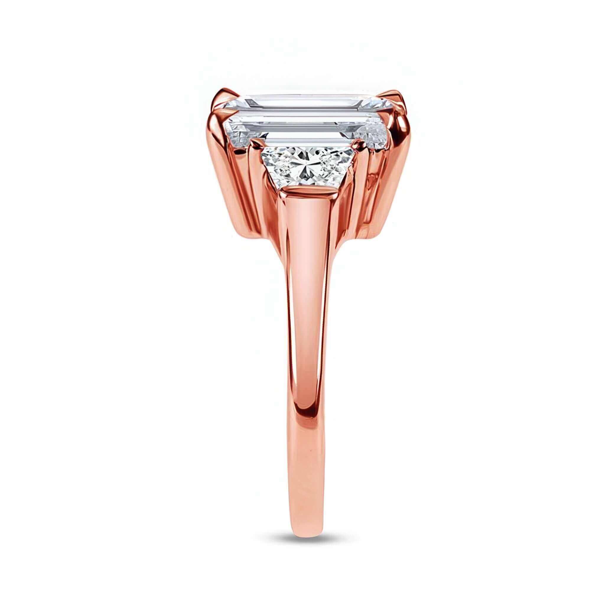 An incredible emerald cut 5 carat ring featuring a three stone design with an emerald cut center and trapezoid diamonds on each side for a unique look.
