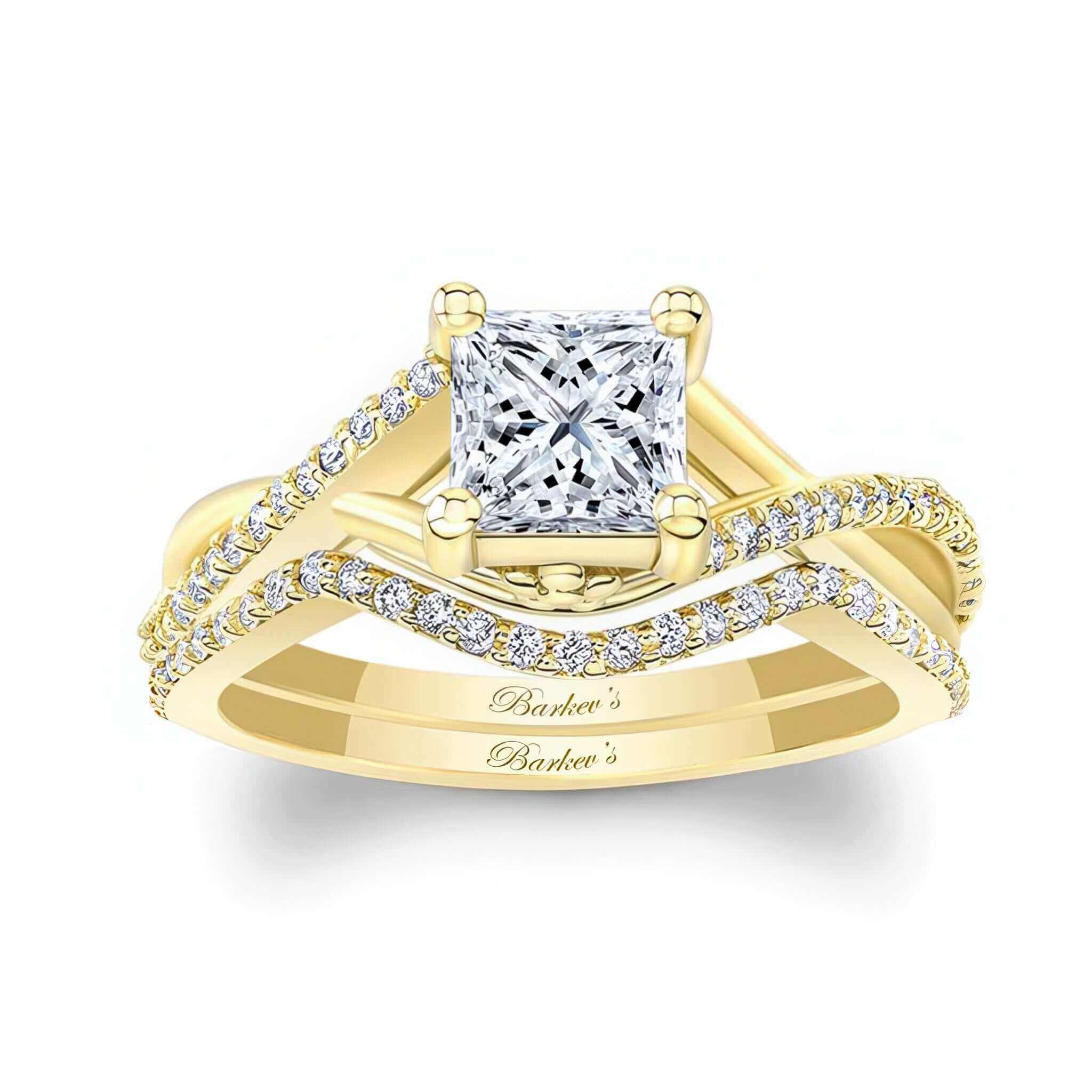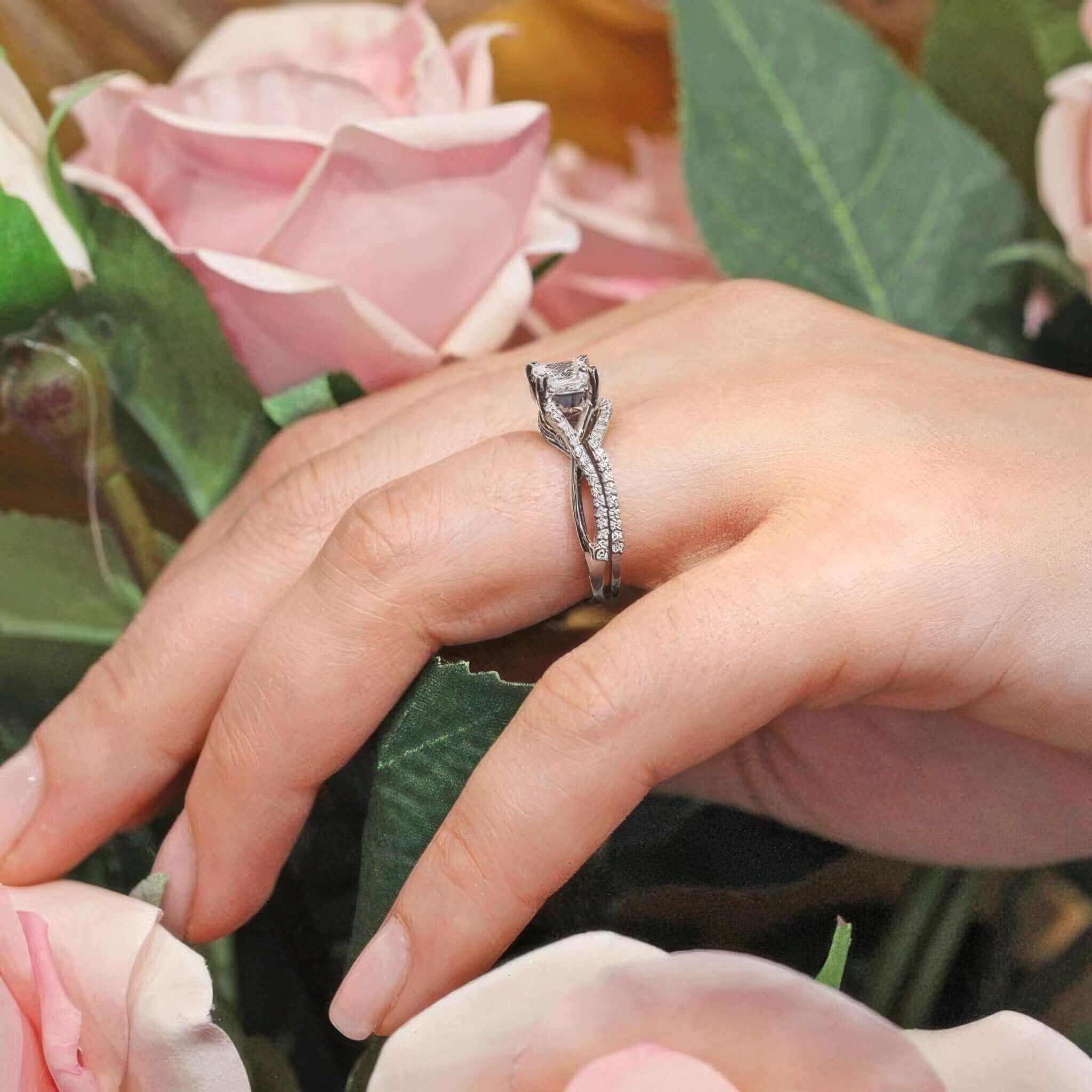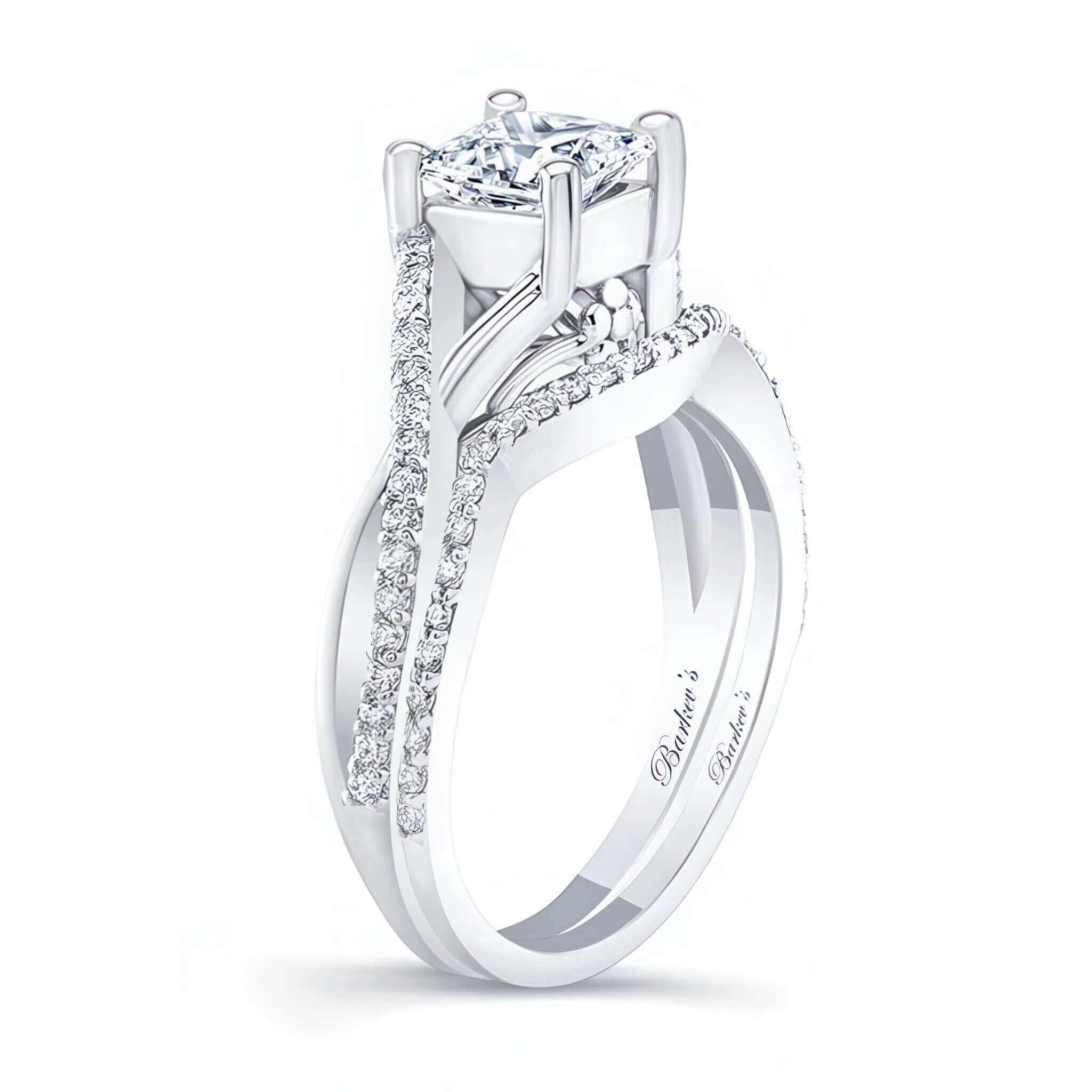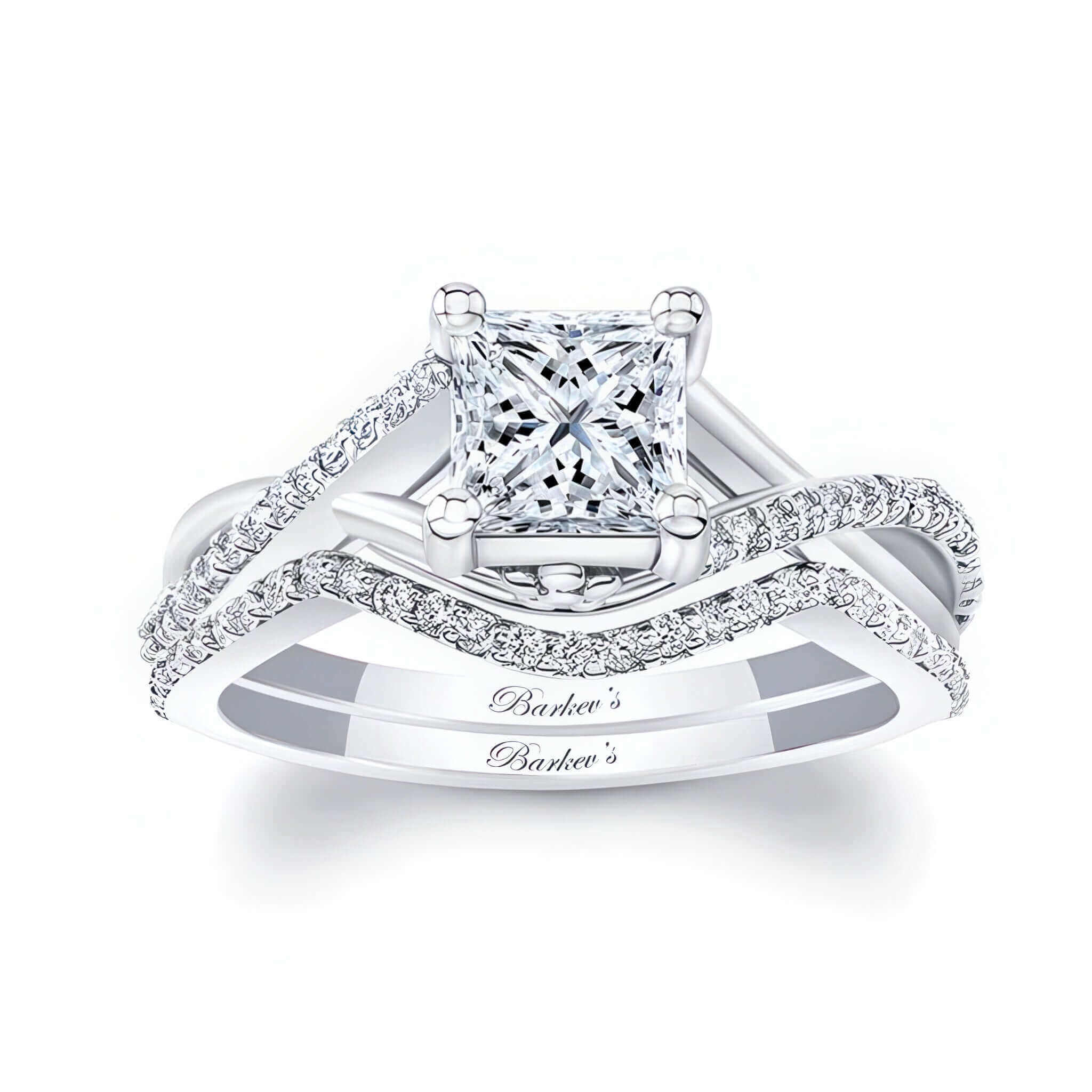 A simple one carat princess cut diamond bridal set featuring a princess cut center, a criss crossing split shank and shared prong diamonds on the sides. Comes with a matching wedding band.