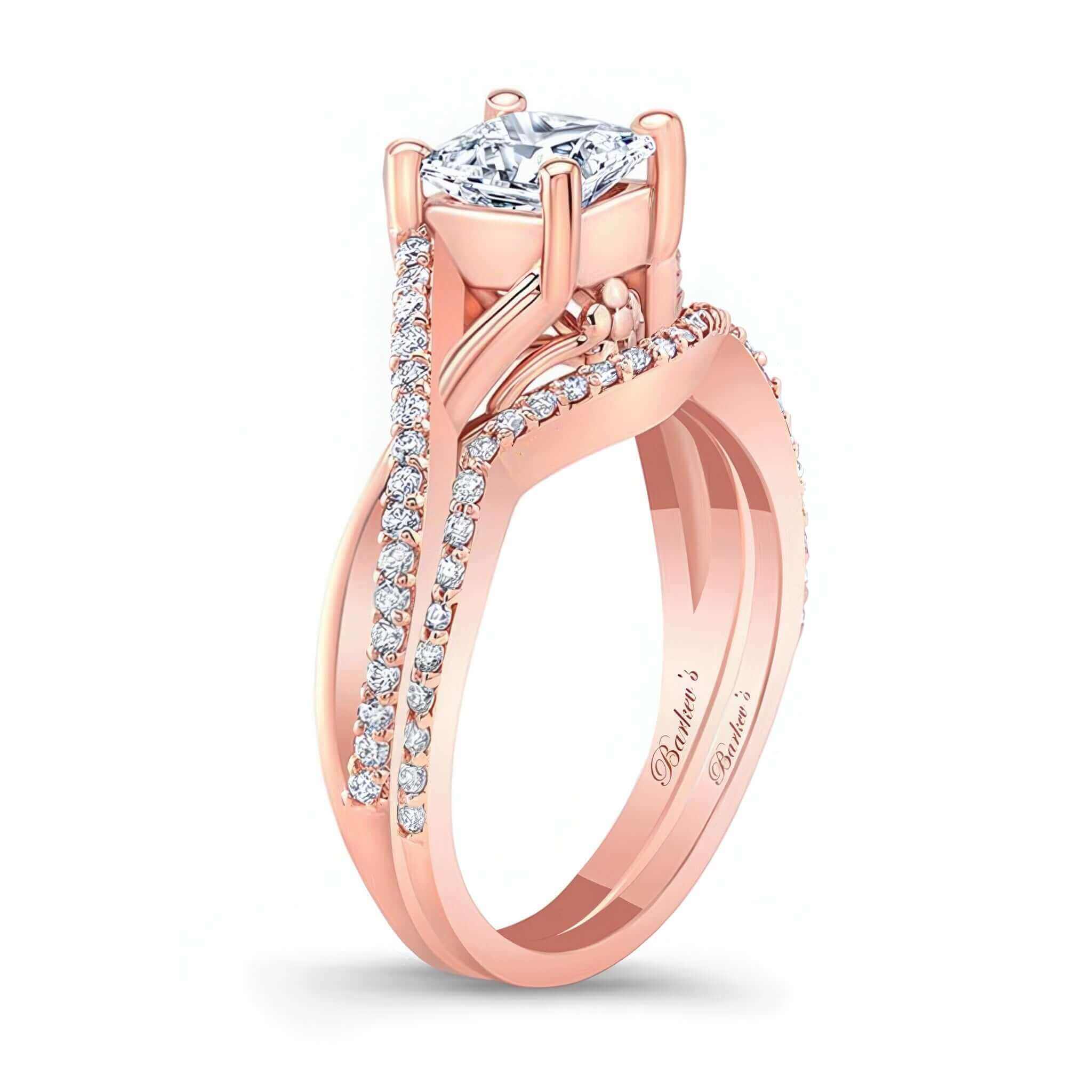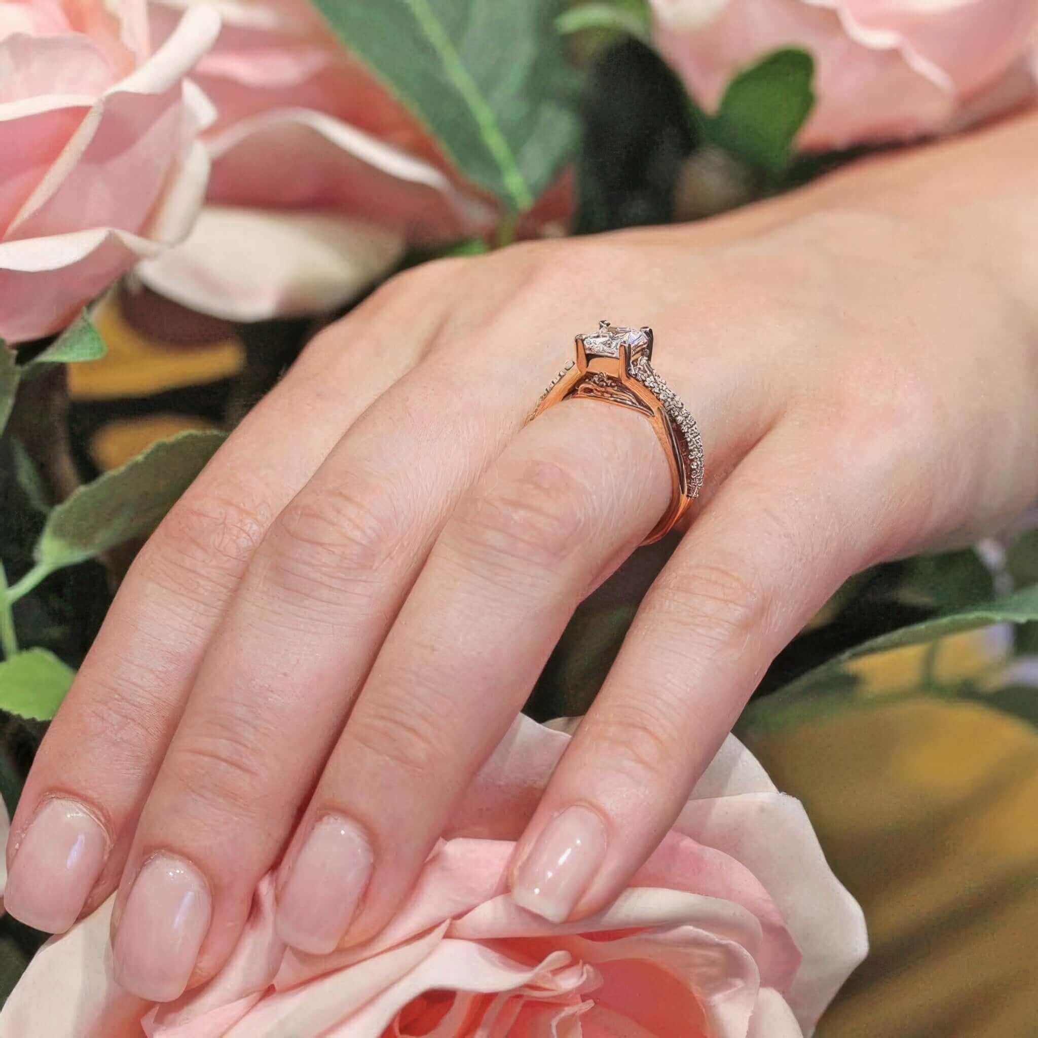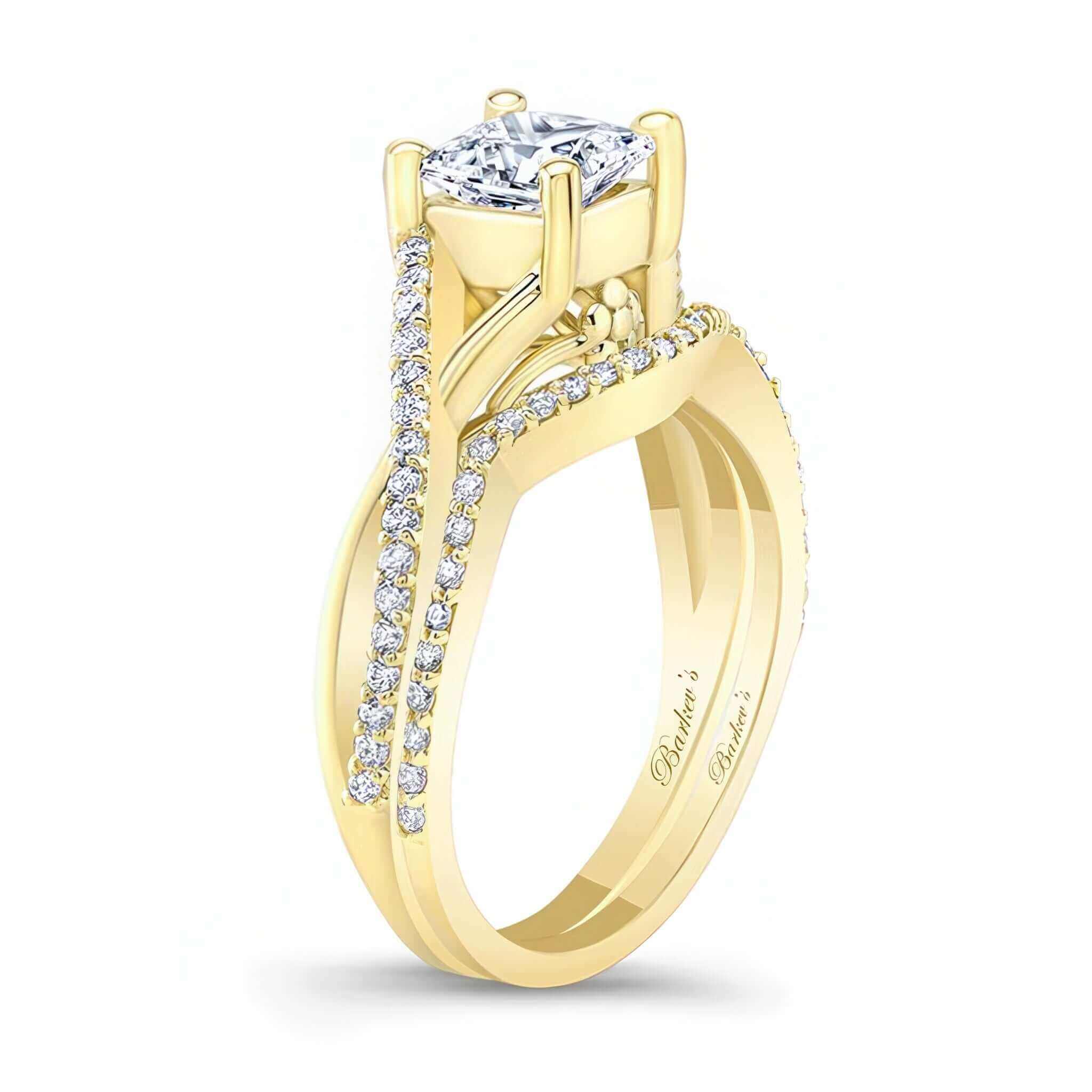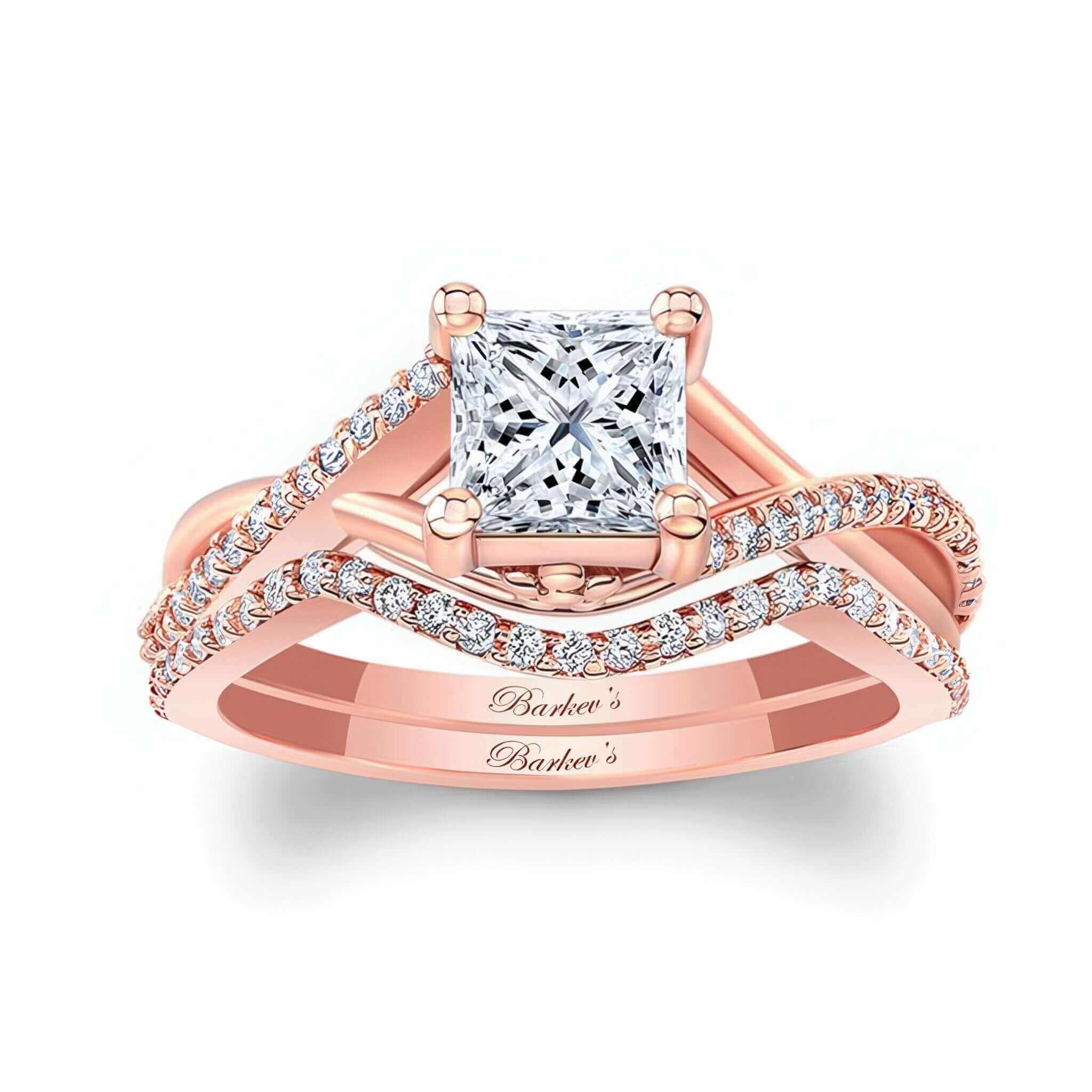 A simple one carat princess cut diamond bridal set featuring a princess cut center, a criss crossing split shank and shared prong diamonds on the sides. Comes with a matching wedding band.