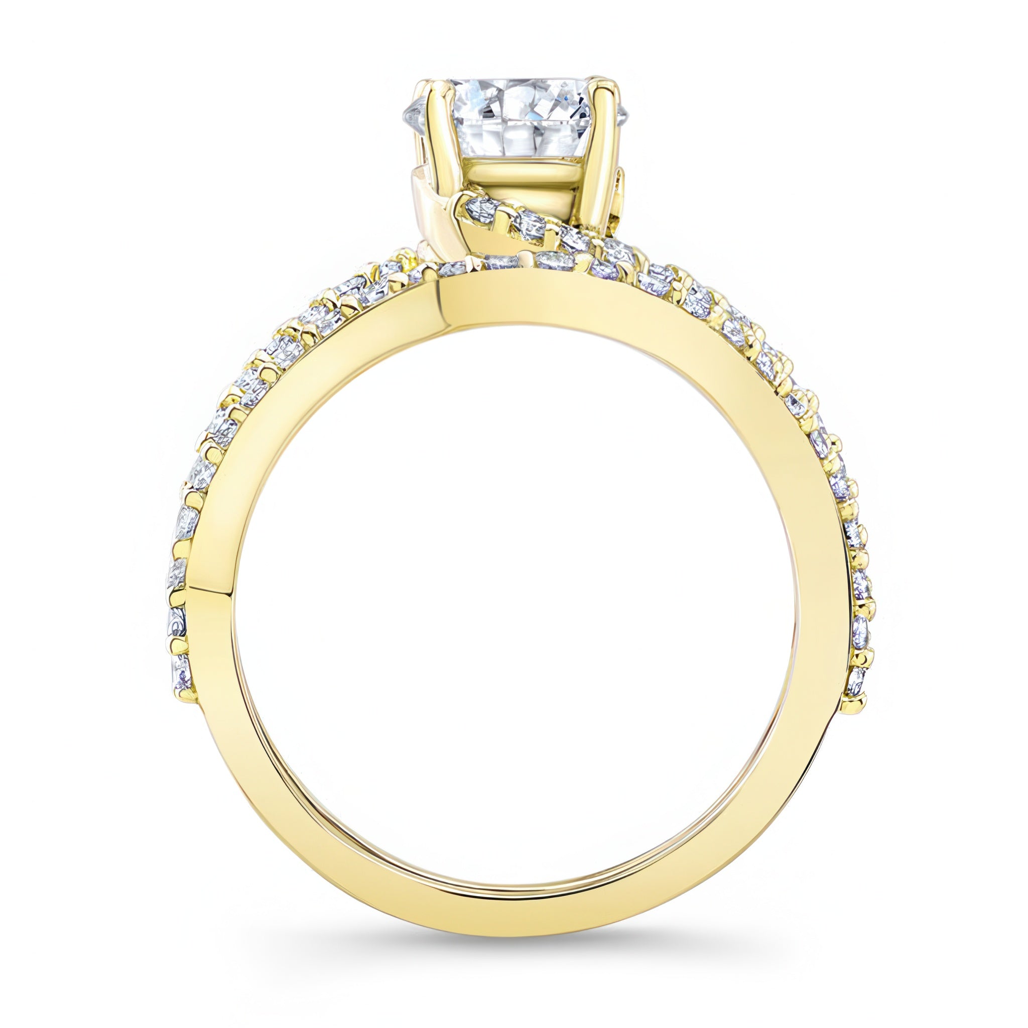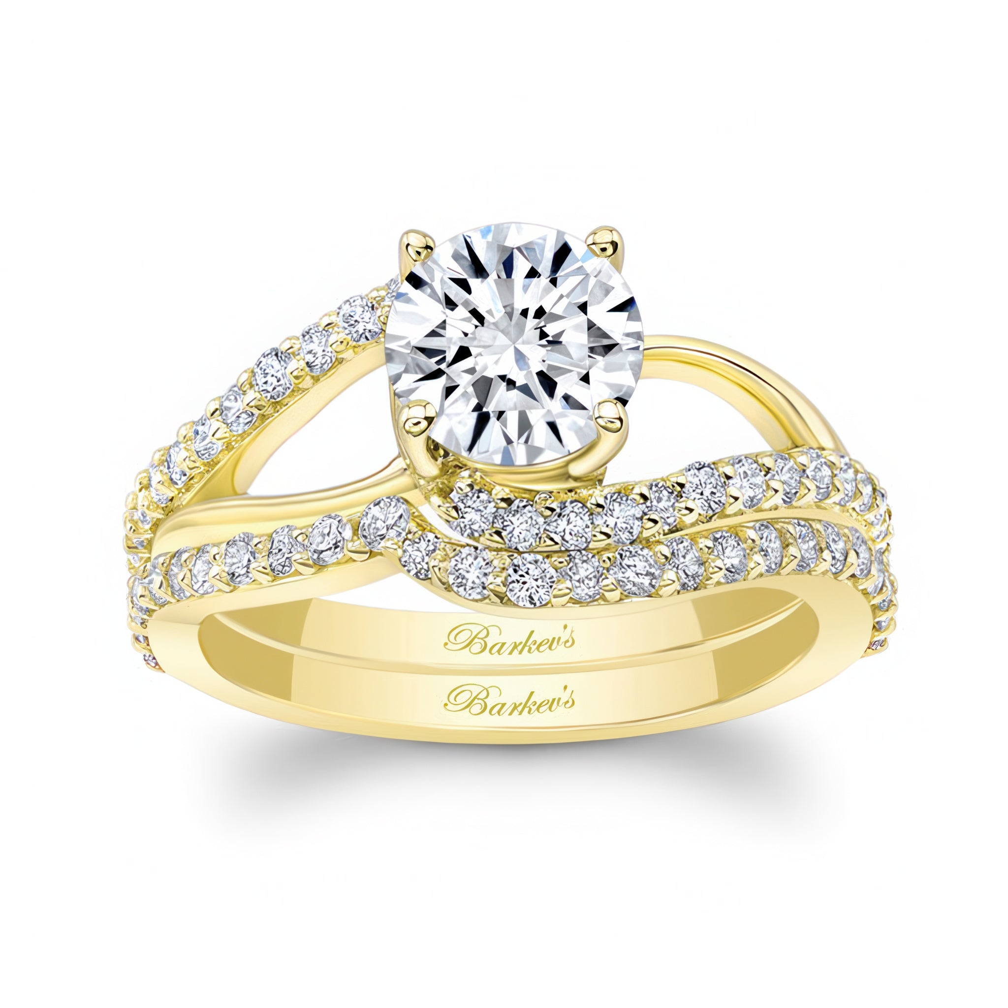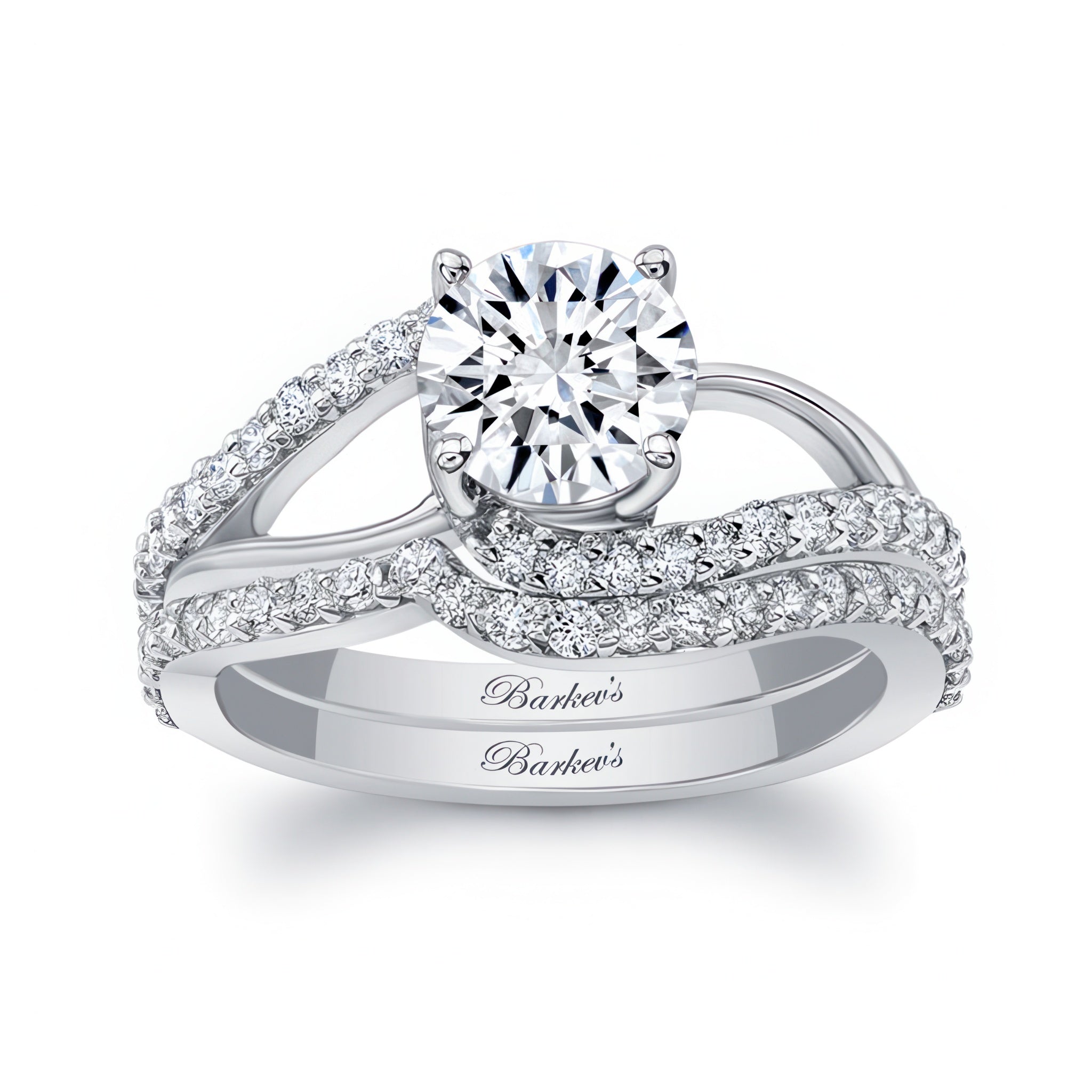 This split shank bridal set features a round center, while it's split shoulders are adorned with diamonds. The matching diamond wedding band follows the curves of the ring for a flawless final look.
