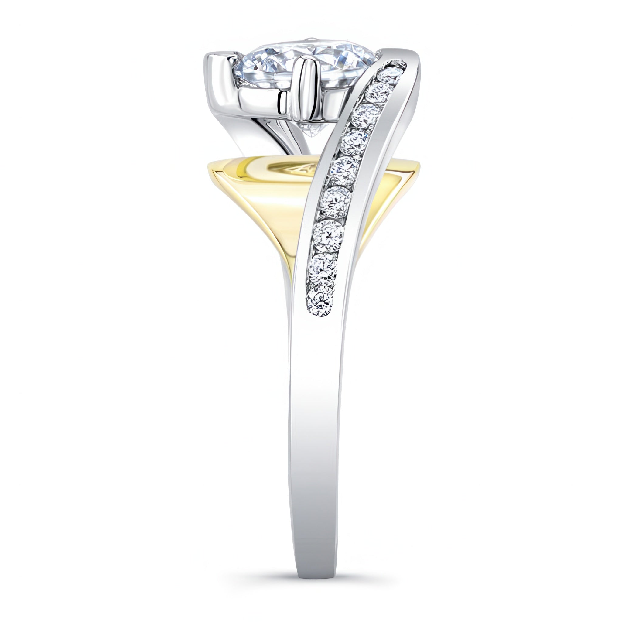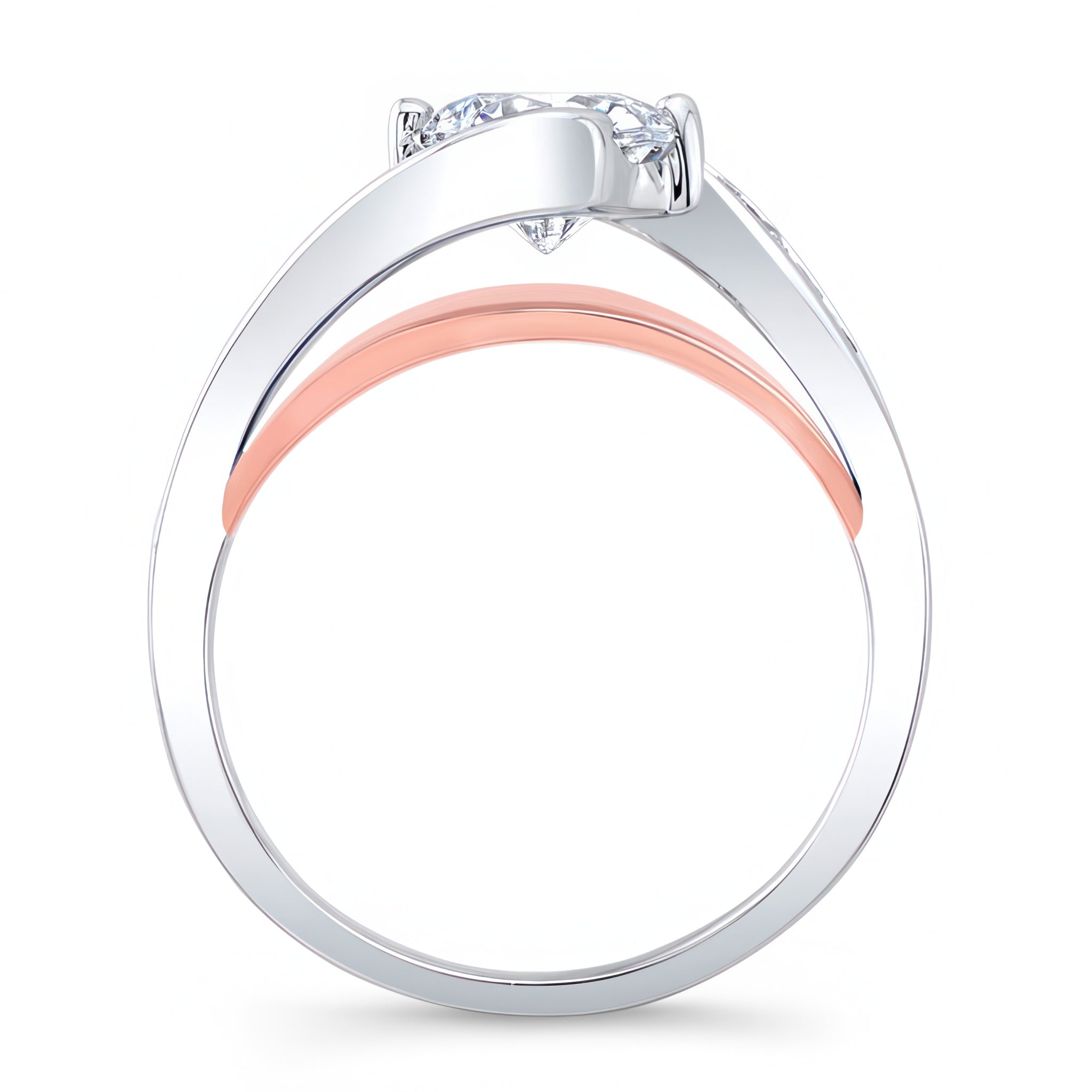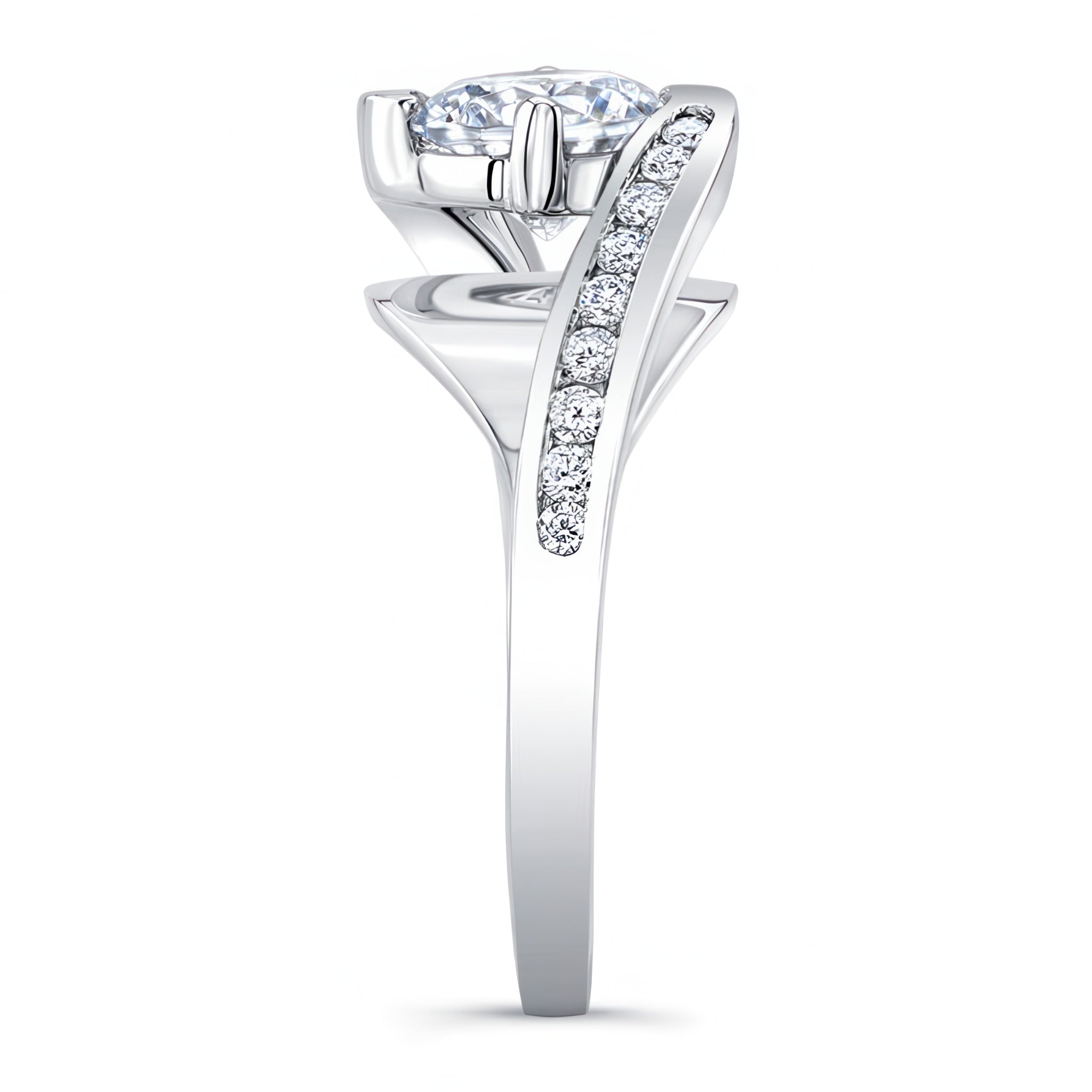 This split shank cathedral engagement ring features shoulders that rise up and taper towards the round center, with diamonds adorning the shank and a bright polished gallery adding to its modern contemporary feel.
