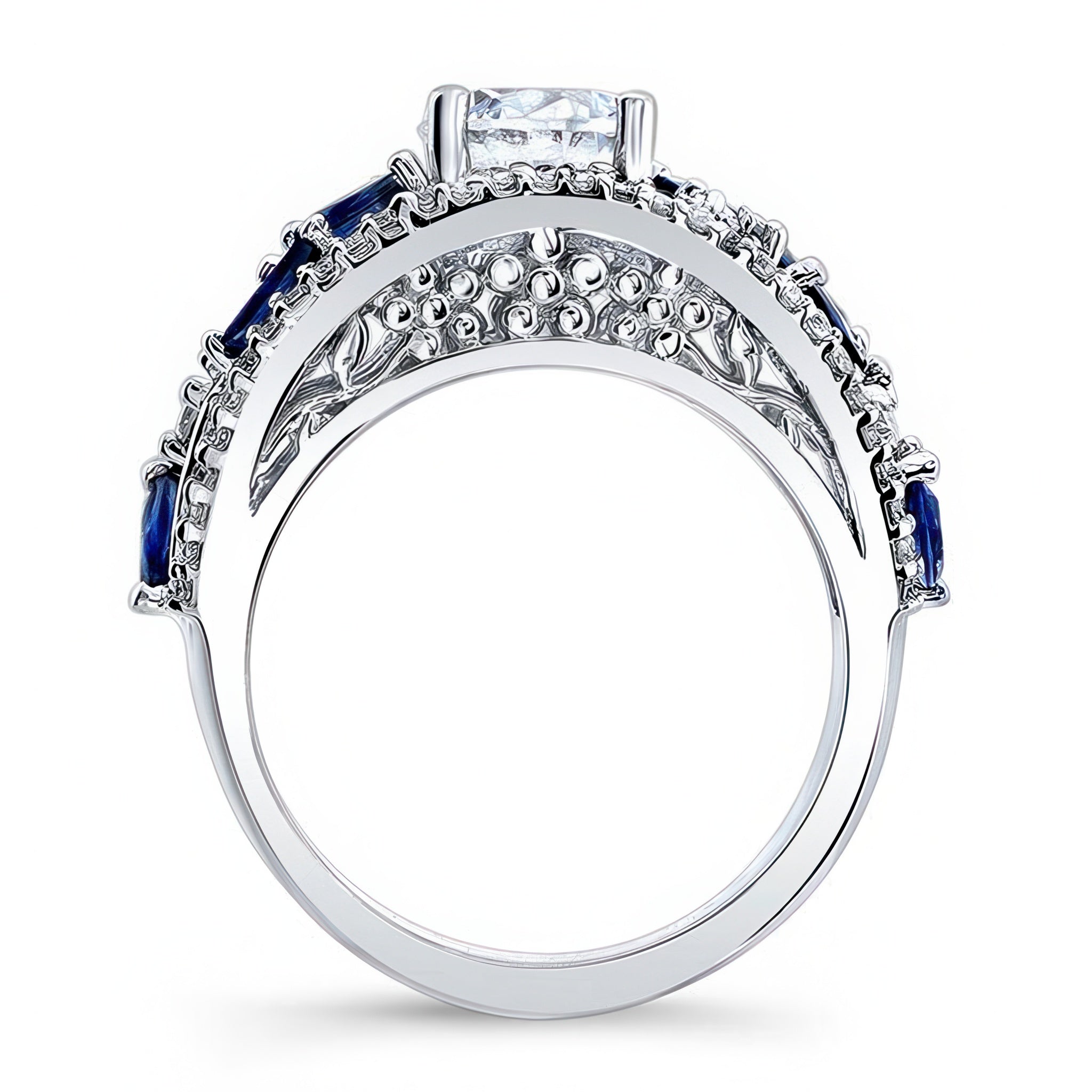This vine blue sapphire accent ring features a prong set round center embellished on the shoulders with a leaf and vine design with marquise cut blue sapphires and a ridge of shared prong set diamonds frame the artful shoulders for an elegant touch of glamour.