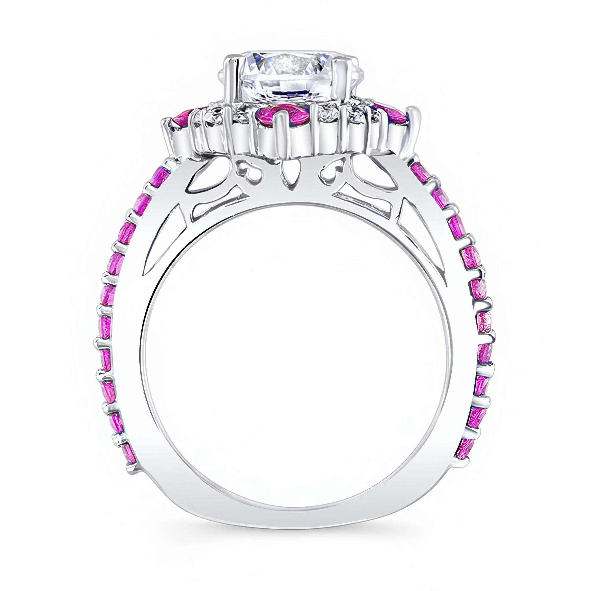 2 Carat Halo Pink Sapphire And Diamond Set With 2 Bands
