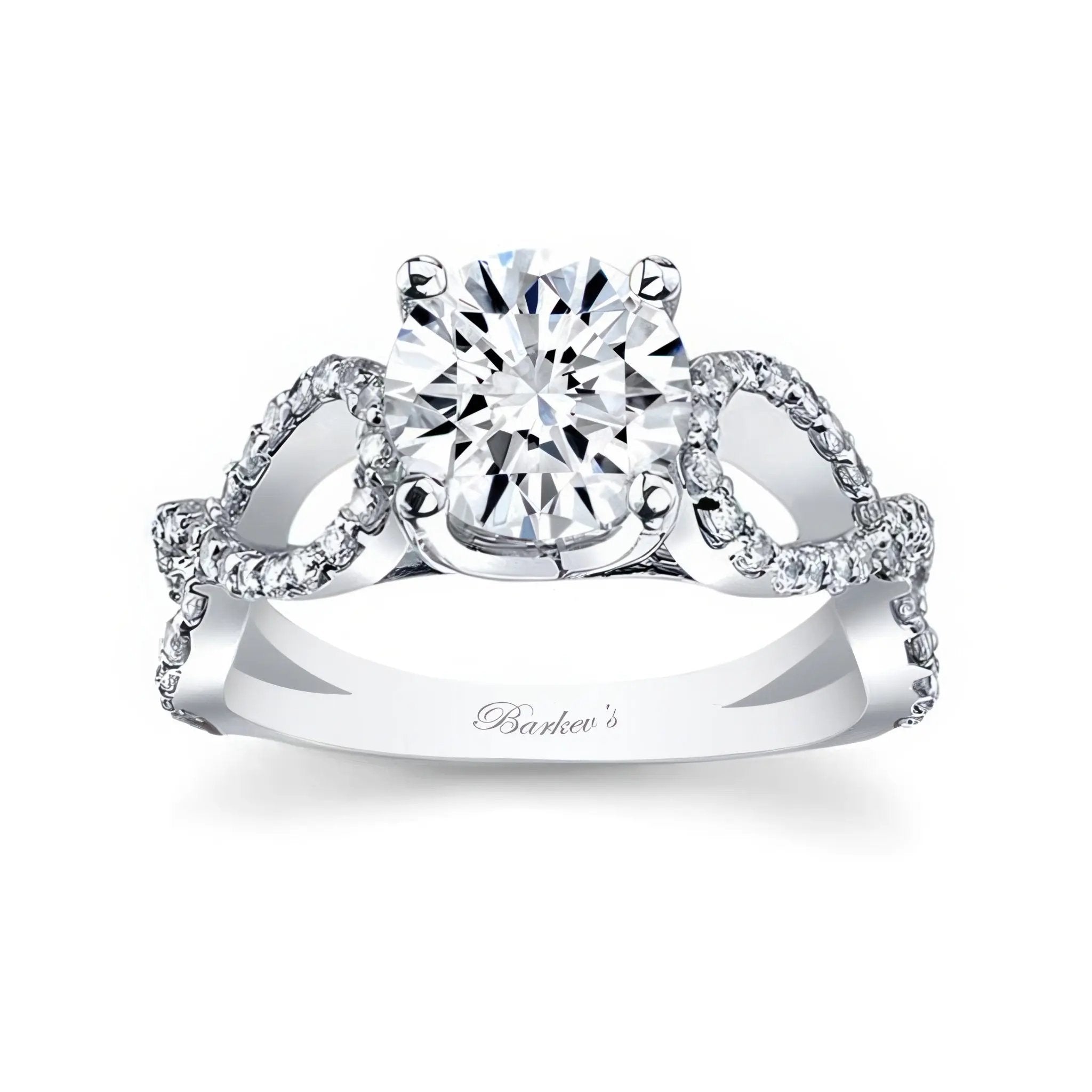 This stunning 2 carat moissanite engagement ring features a large prong set round center with a curving shank criss crossing down the shoulders adorned with shared prong set diamonds for a glamorous look sure to catch the eye of many admirers.
