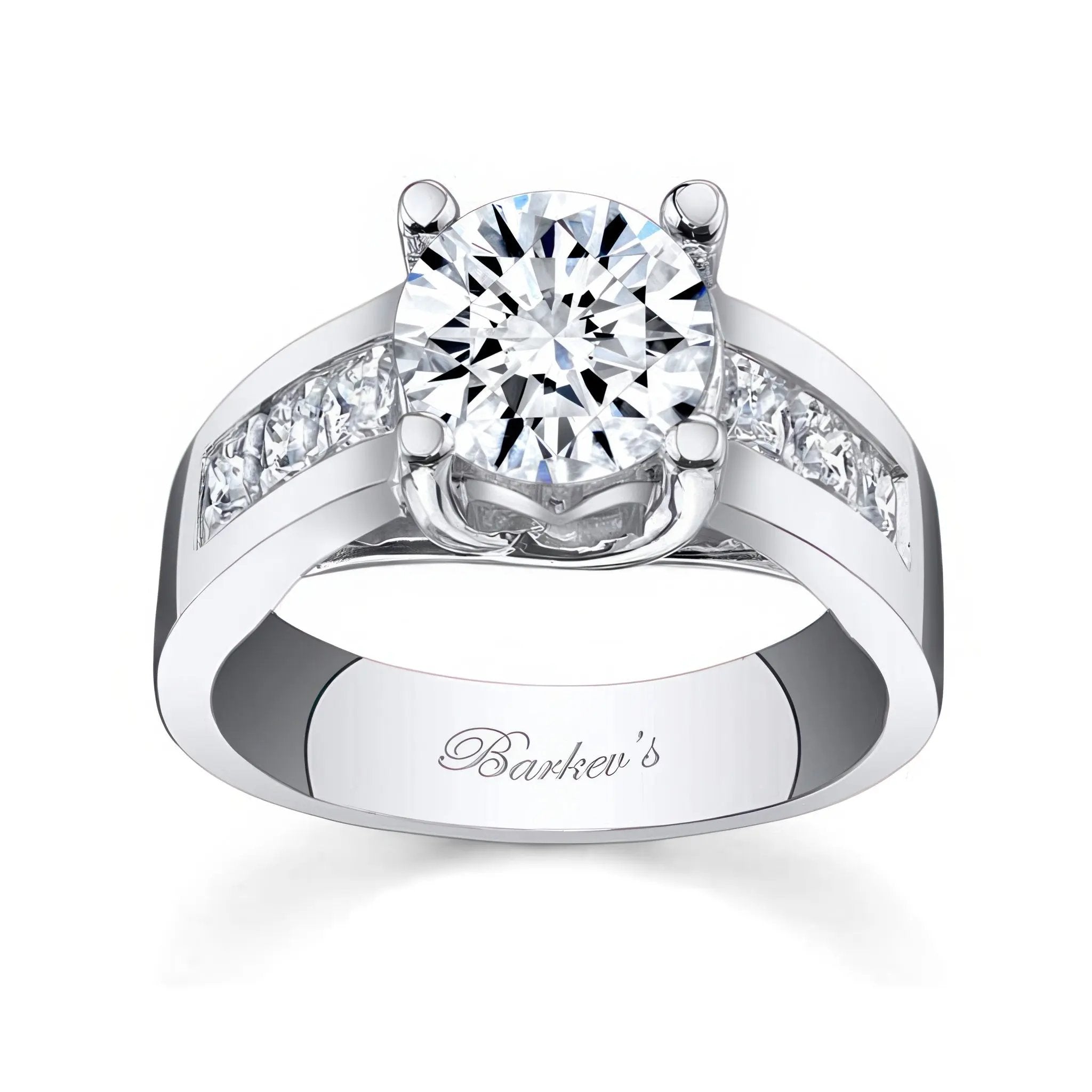 This 2 ct round moissanite ring features a prong set center with channel set princess cut diamonds for a touch of elegance.