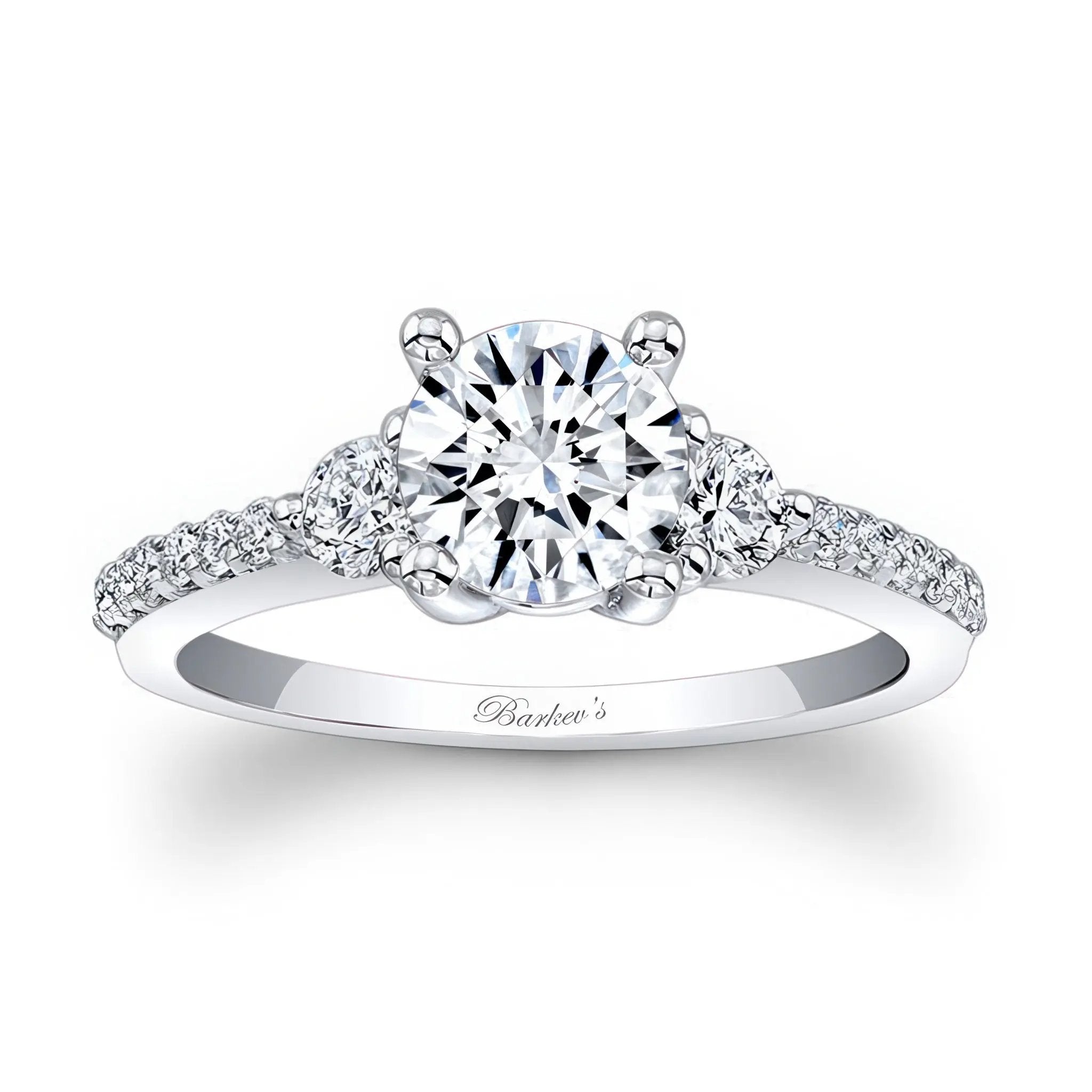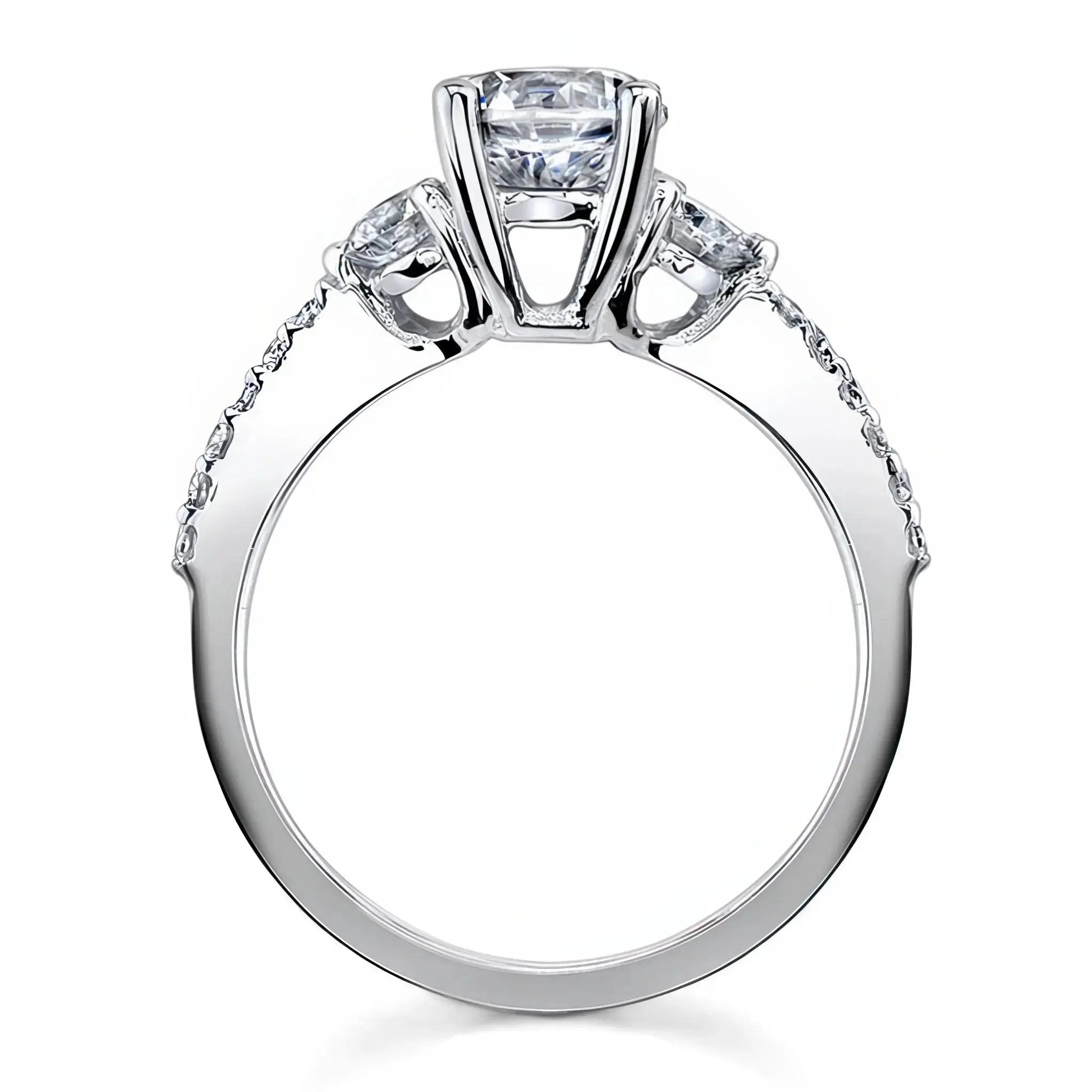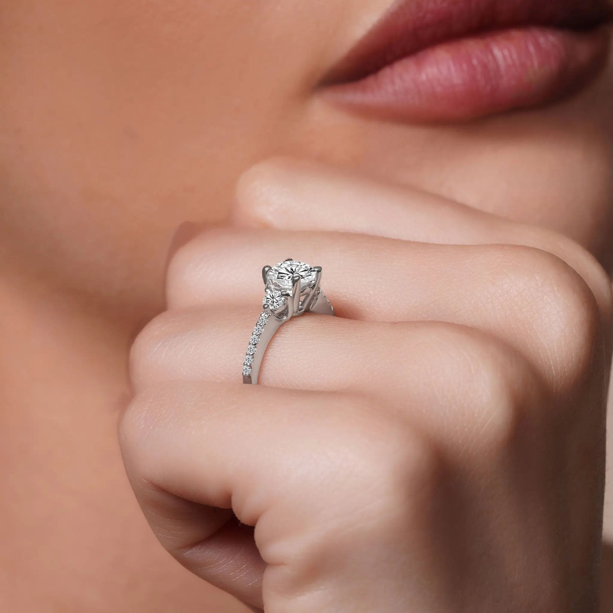 This 3 stone moissanite ring features diamonds flanking the prong-set round center. The dainty shoulders are adorned with shared prong set melees adding the finishing touch of elegance to this ring.