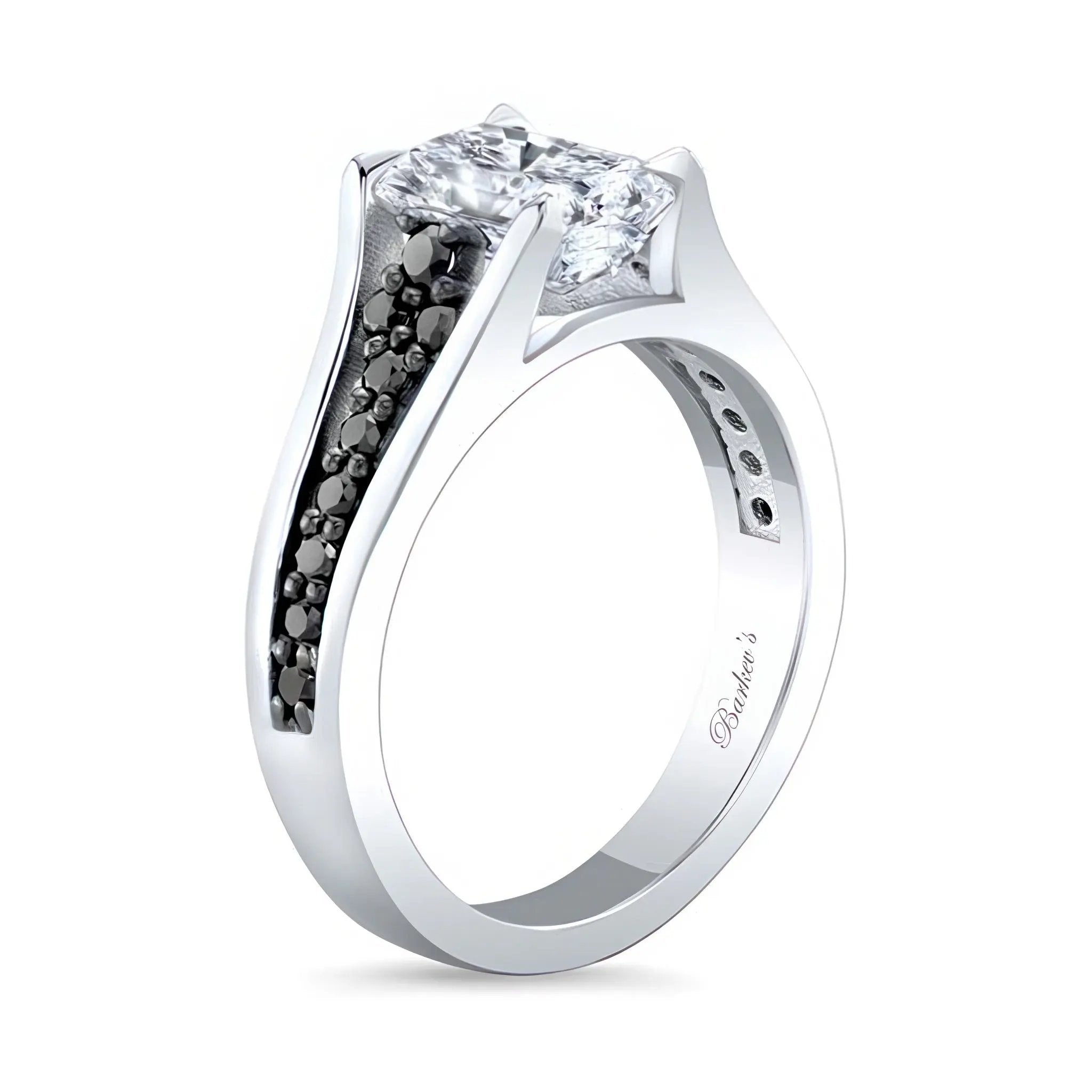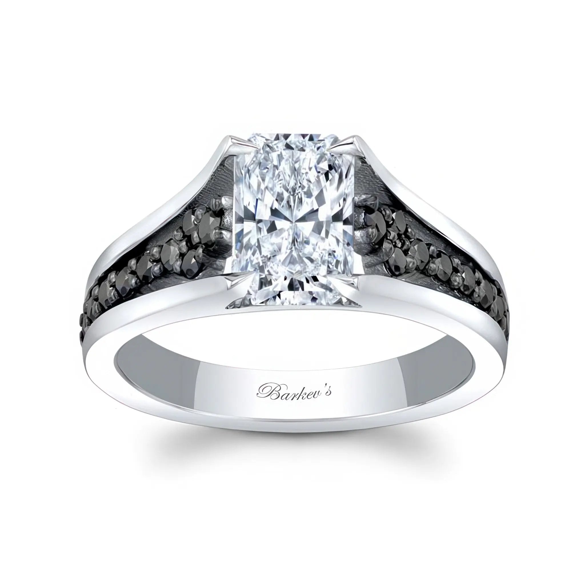 This cathedral radiant cut black diamond accent moissanite ring sports a prong set radiant cut center with shared prong set black diamonds cascading down the shoulders for a classic clean look of sophistication.