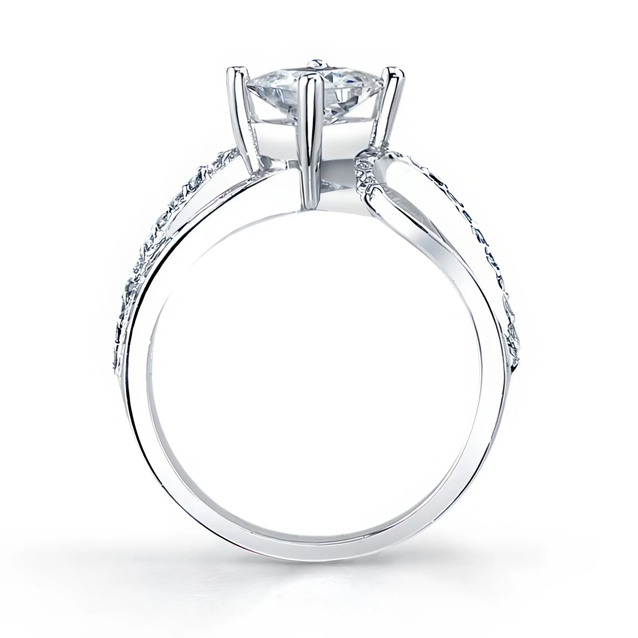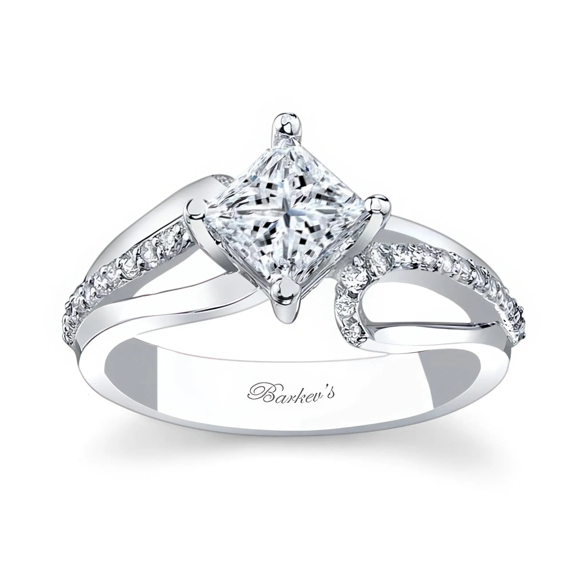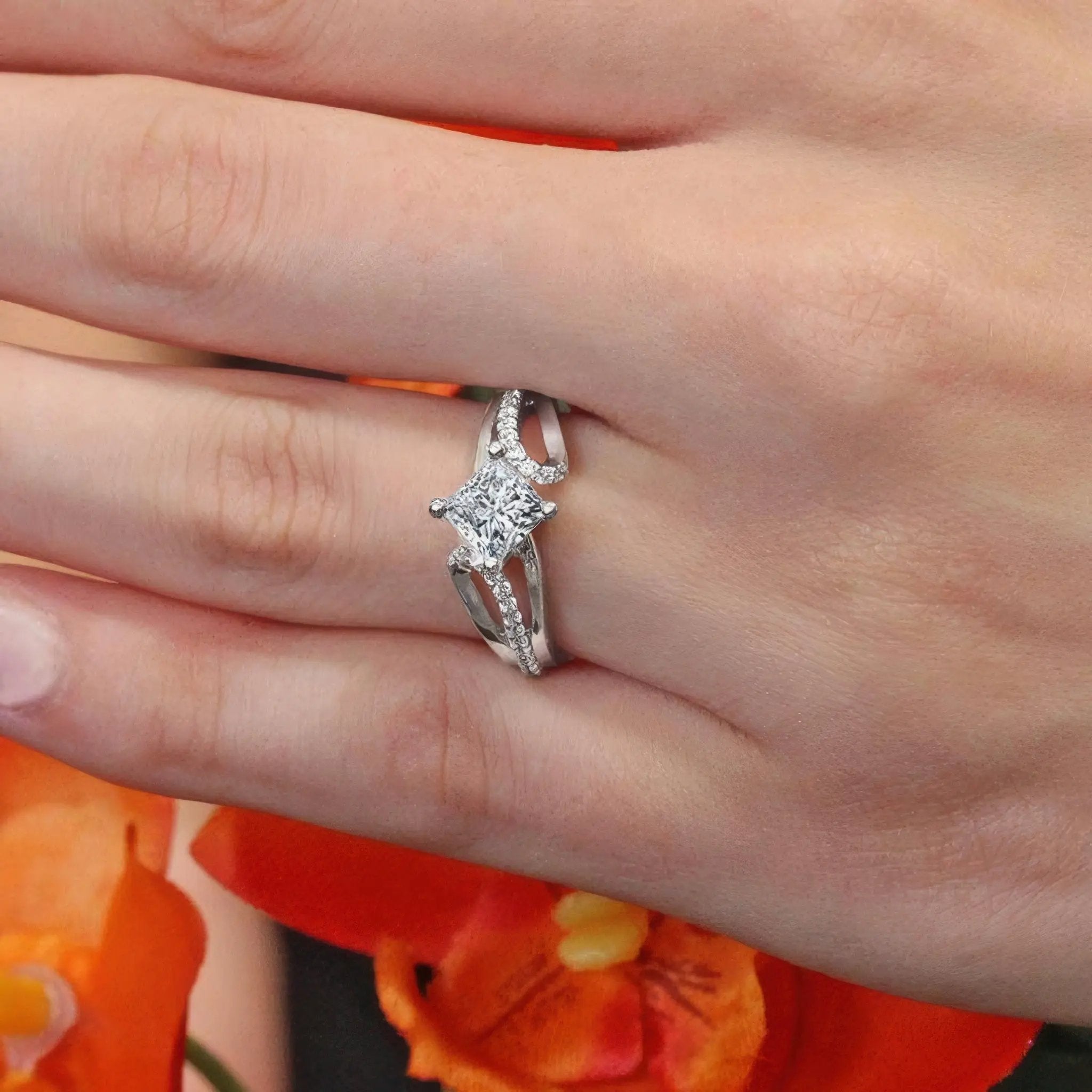 This looping split shank princess cut moissanite ring features a prong set princess cut center with artfully looping shoulders adorned with shared prong set diamonds for an elegant statement.