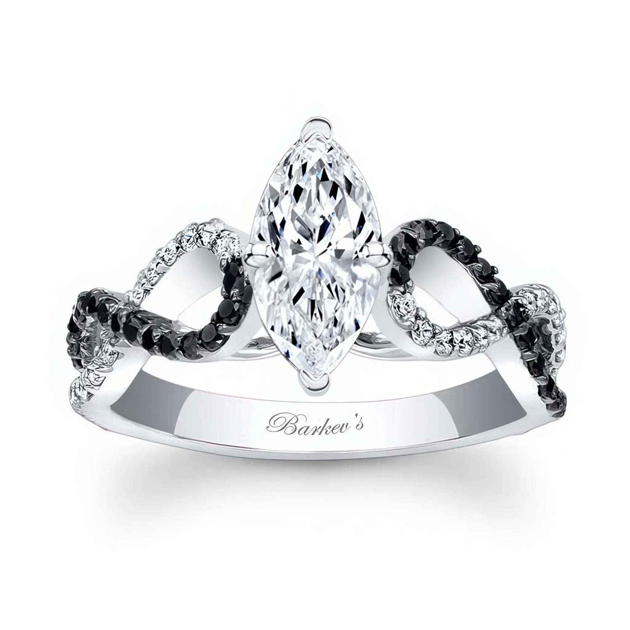 This marquise infinity black and white diamond moissanite ring features a prong set marquise center with an artfully curving cathedral shank that crisscrosses down the shoulders adorned with shared prong set black and white diamonds for a glamorous look sure to be treasured.