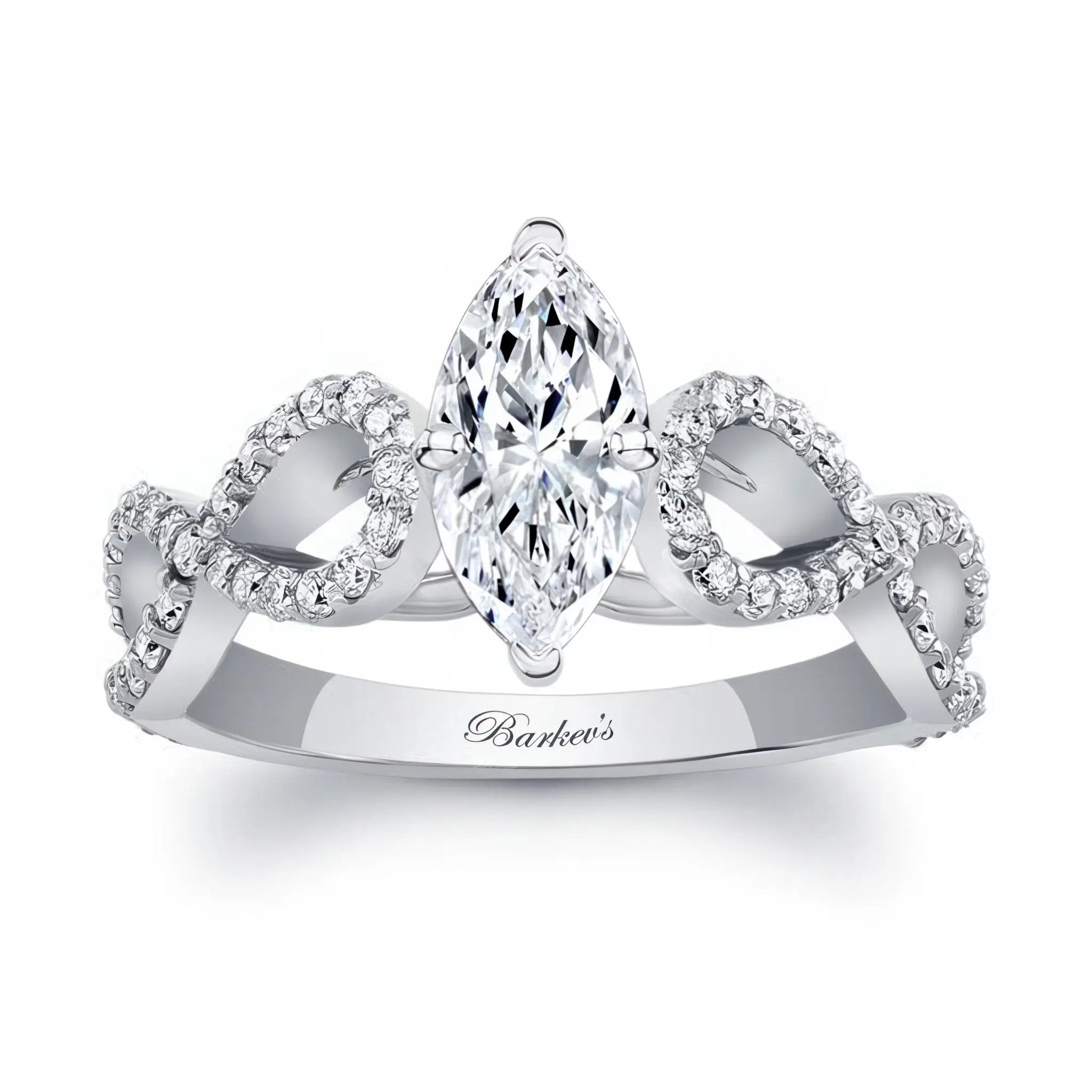 This marquise moissanite infinity engagement ring features a prong set marquise center with an artfully curving cathedral shank that crisscrosses down the shoulders adorned with shared prong set diamonds for a glamorous look sure to be treasured.