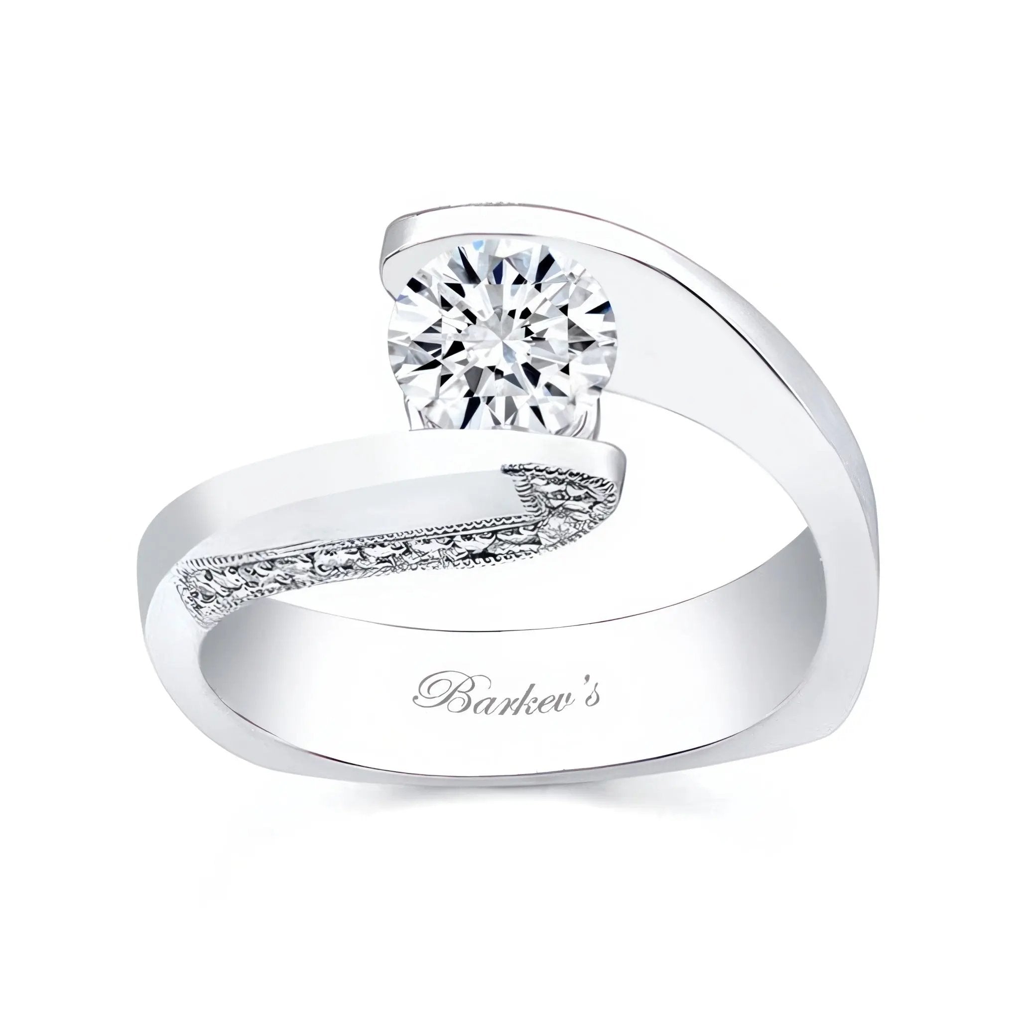 This stunning moissanite pave engagement ring features a channel set round center with an open shank adorned with pave set diamonds and a milgrain finish.