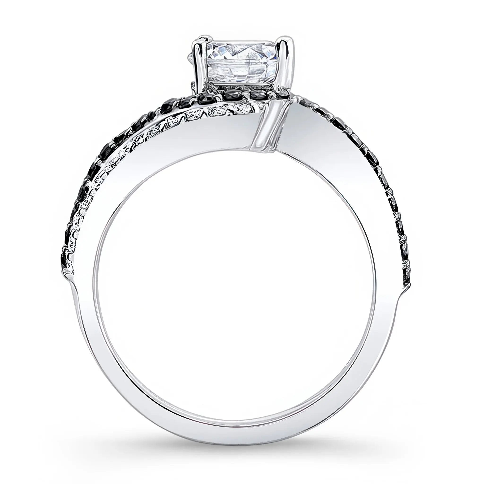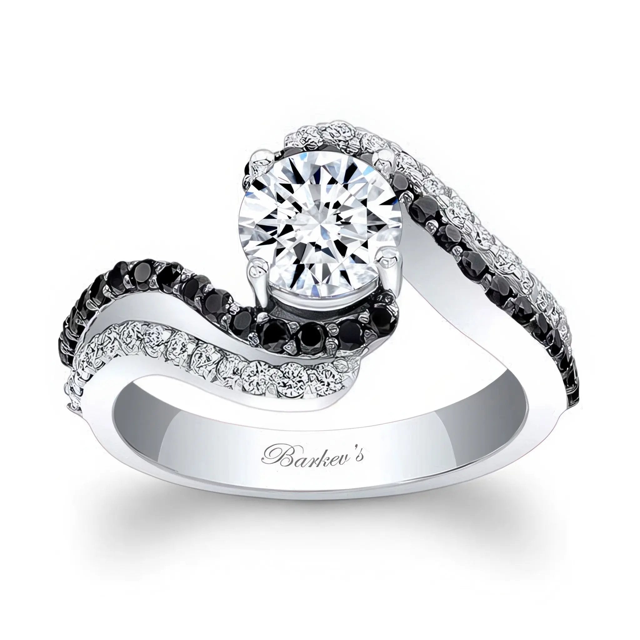This swirl black diamond accent moissanite engagement ring features a double row of shared prong set black and white diamonds swirling around the prong set round center for a classic sophisticated look.