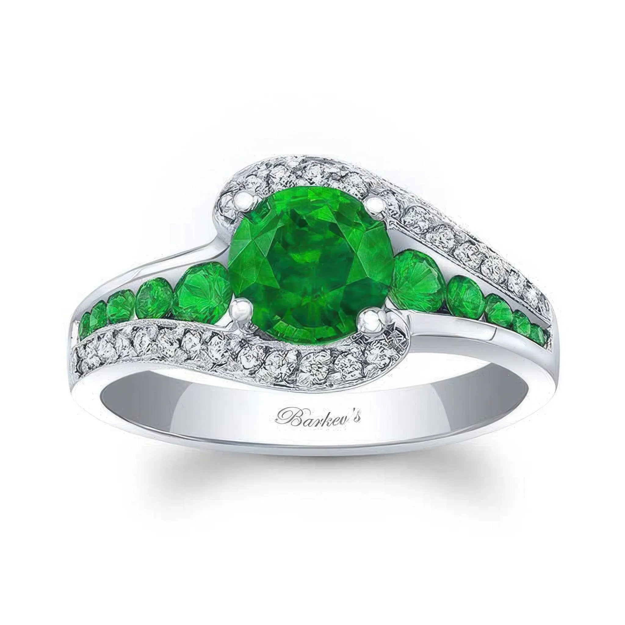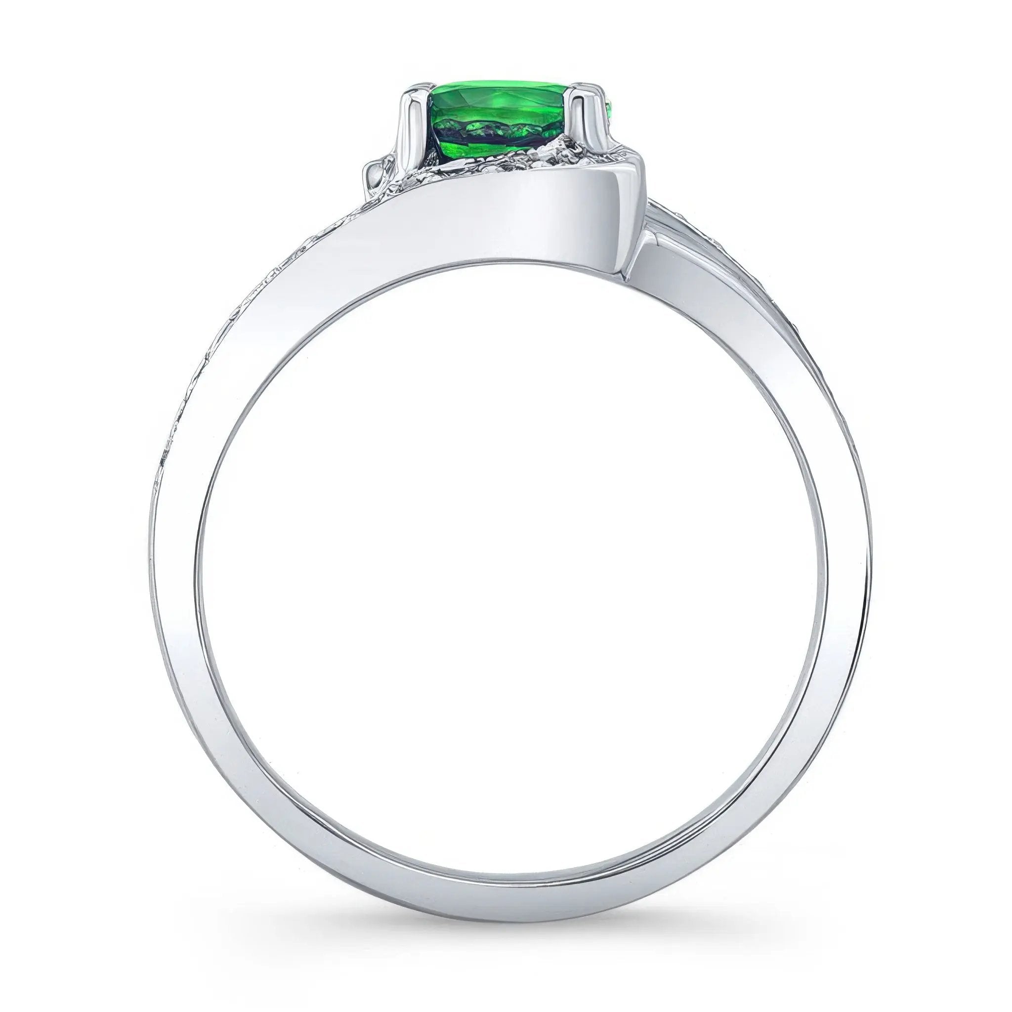 This unique tsavorite engagement ring features a prong set round tsavorite center. The shoulders split and curve up to the center with pave set diamonds, while channel set tsavorites grace the sides.