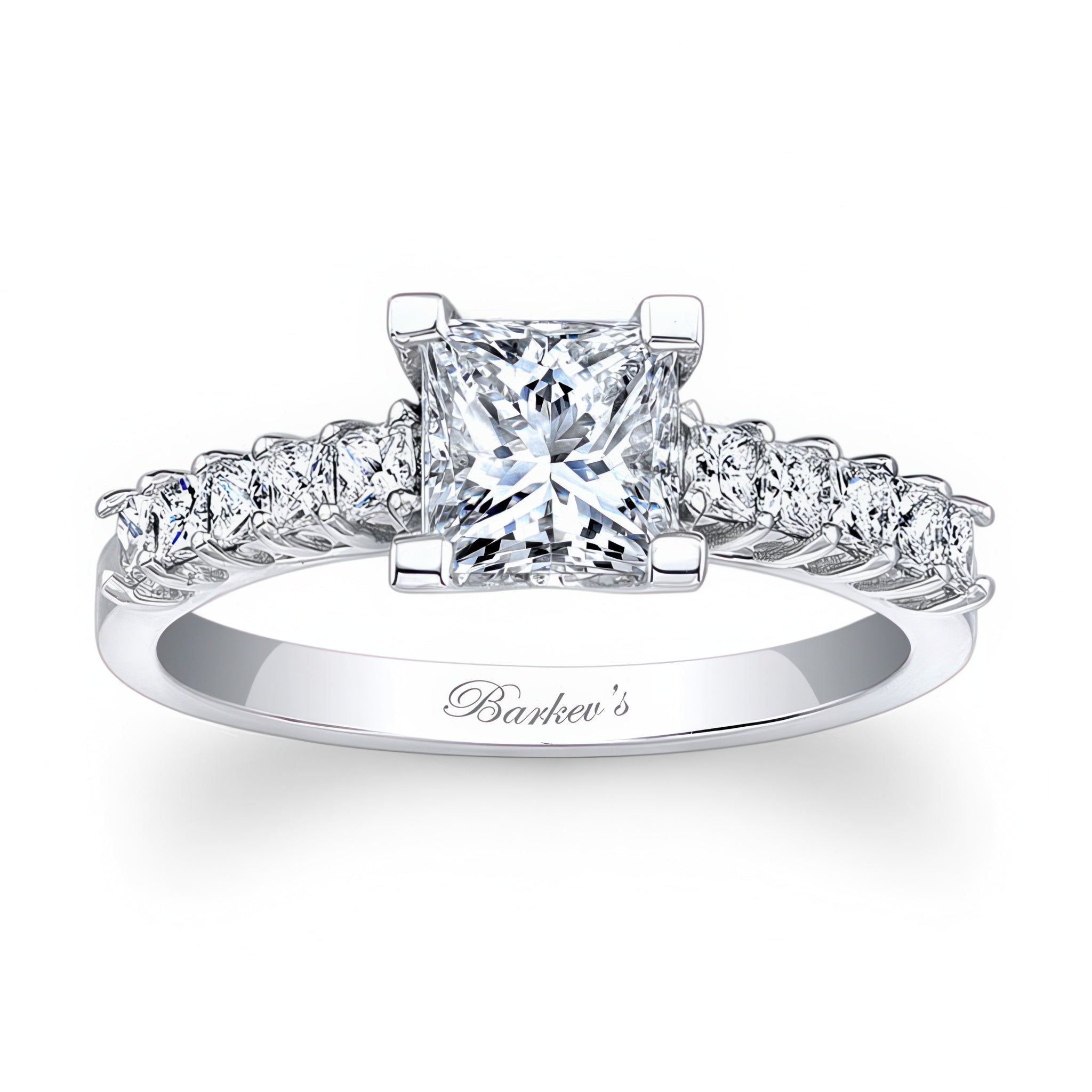 A classic 1 ct princess cut diamond ring featuring a prong set center and a row of princess cut diamonds set with shared prongs cascading down the shoulders for an added touch of bling.