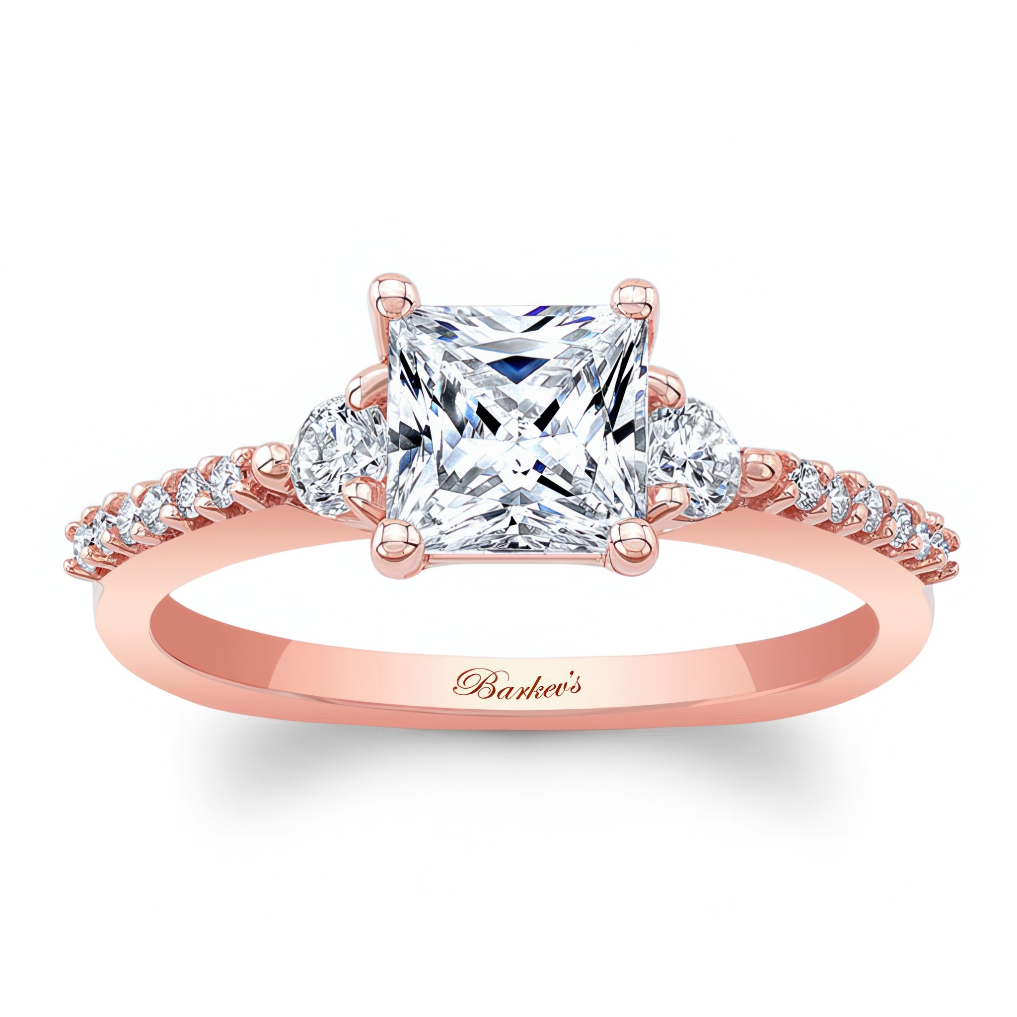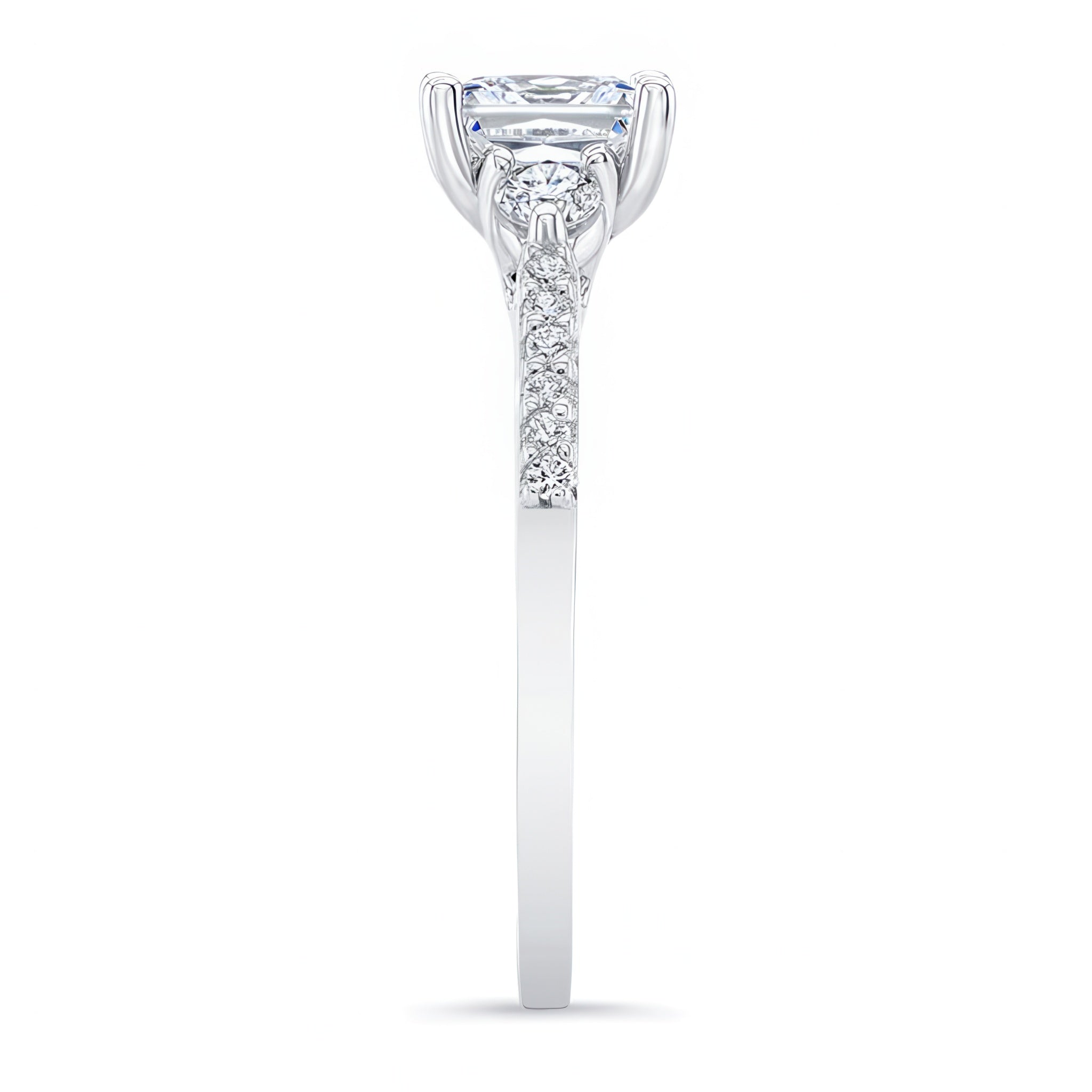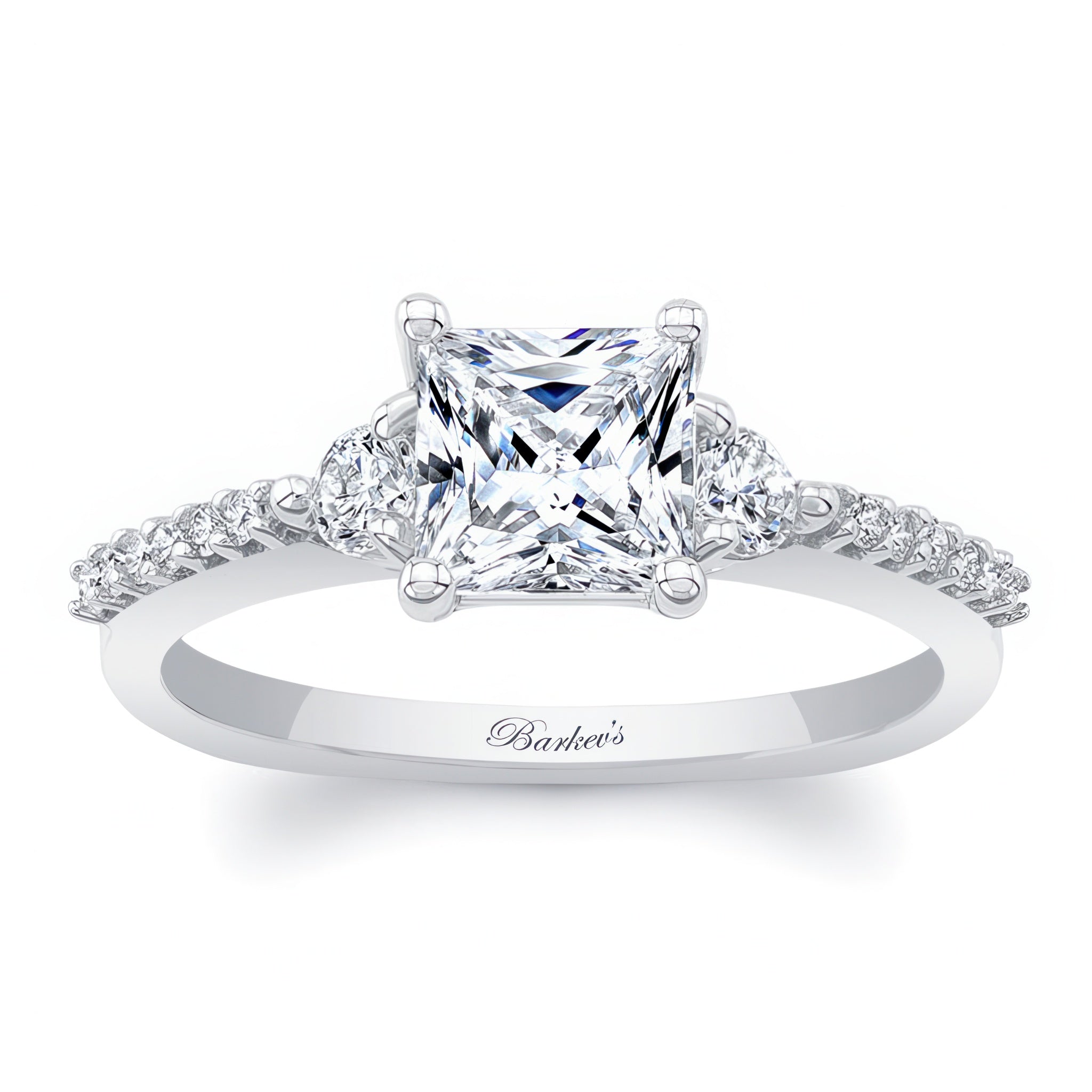 This 3 stone princess cut engagement ring features a prong-set diamond center flanked by diamond accents on each side. The dainty shoulders are embellished with shared prong set diamonds for a finishing touch of sophistication.