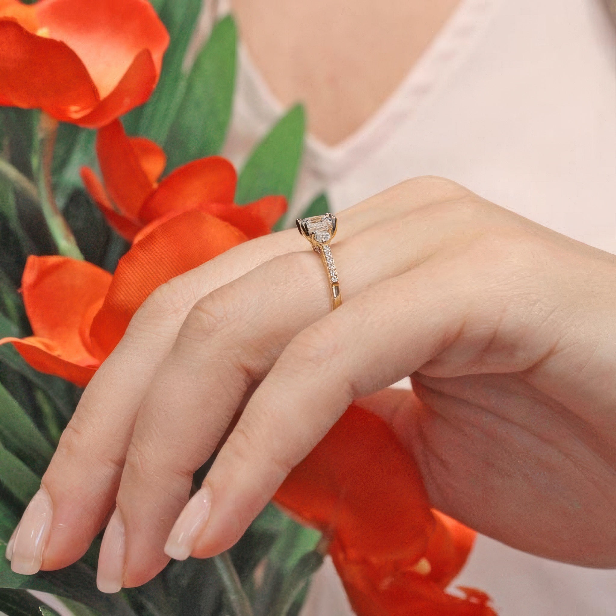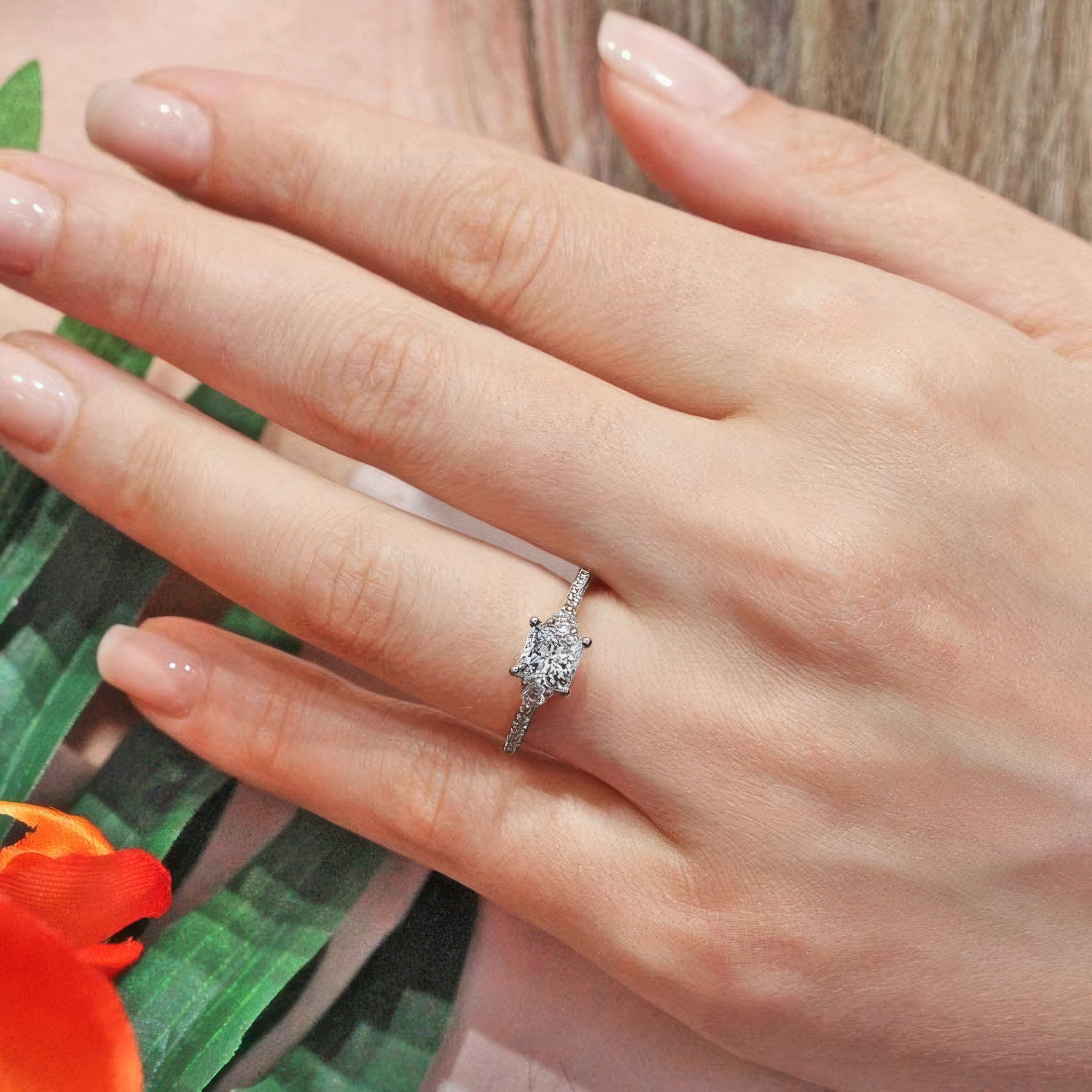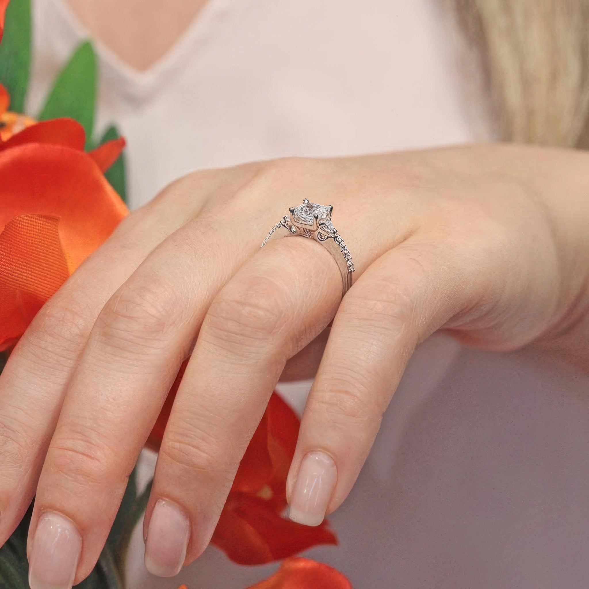 This 3 stone princess cut engagement ring features a prong-set diamond center flanked by diamond accents on each side. The dainty shoulders are embellished with shared prong set diamonds for a finishing touch of sophistication.