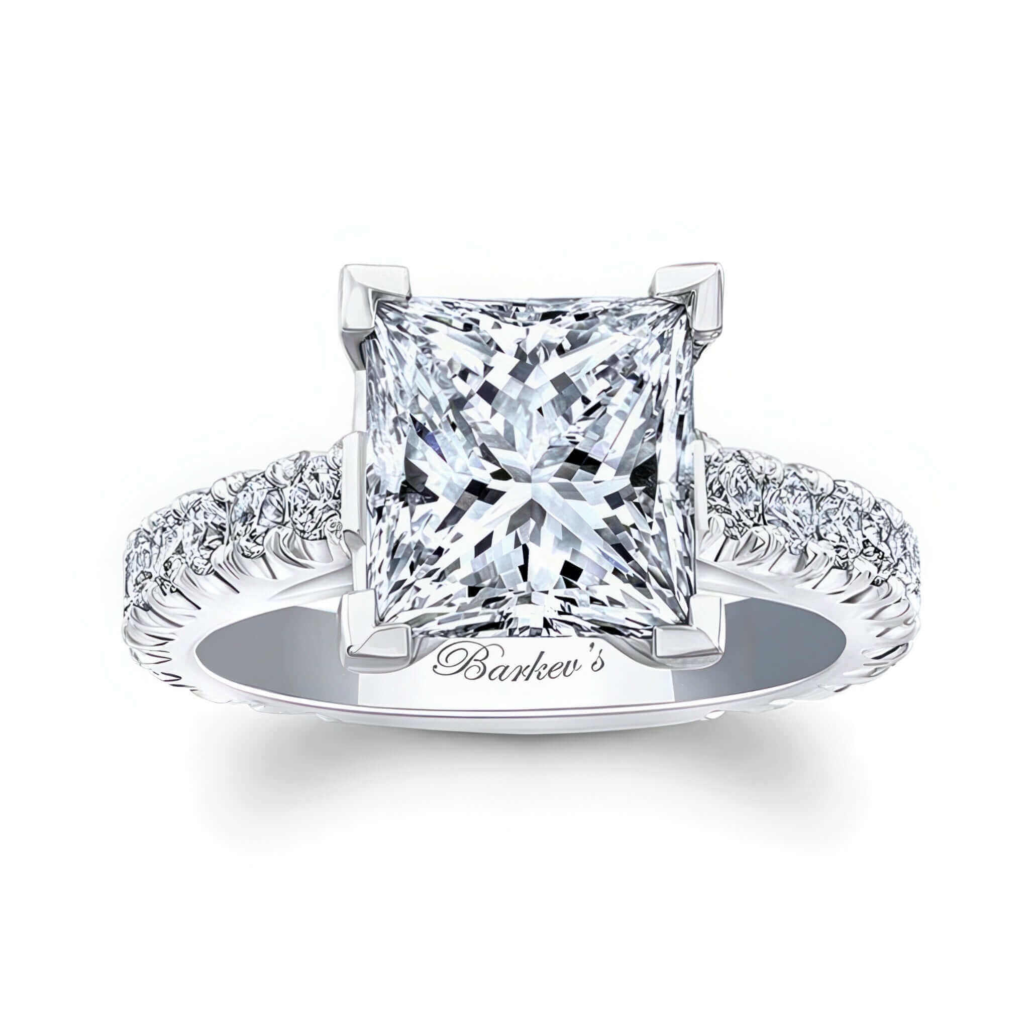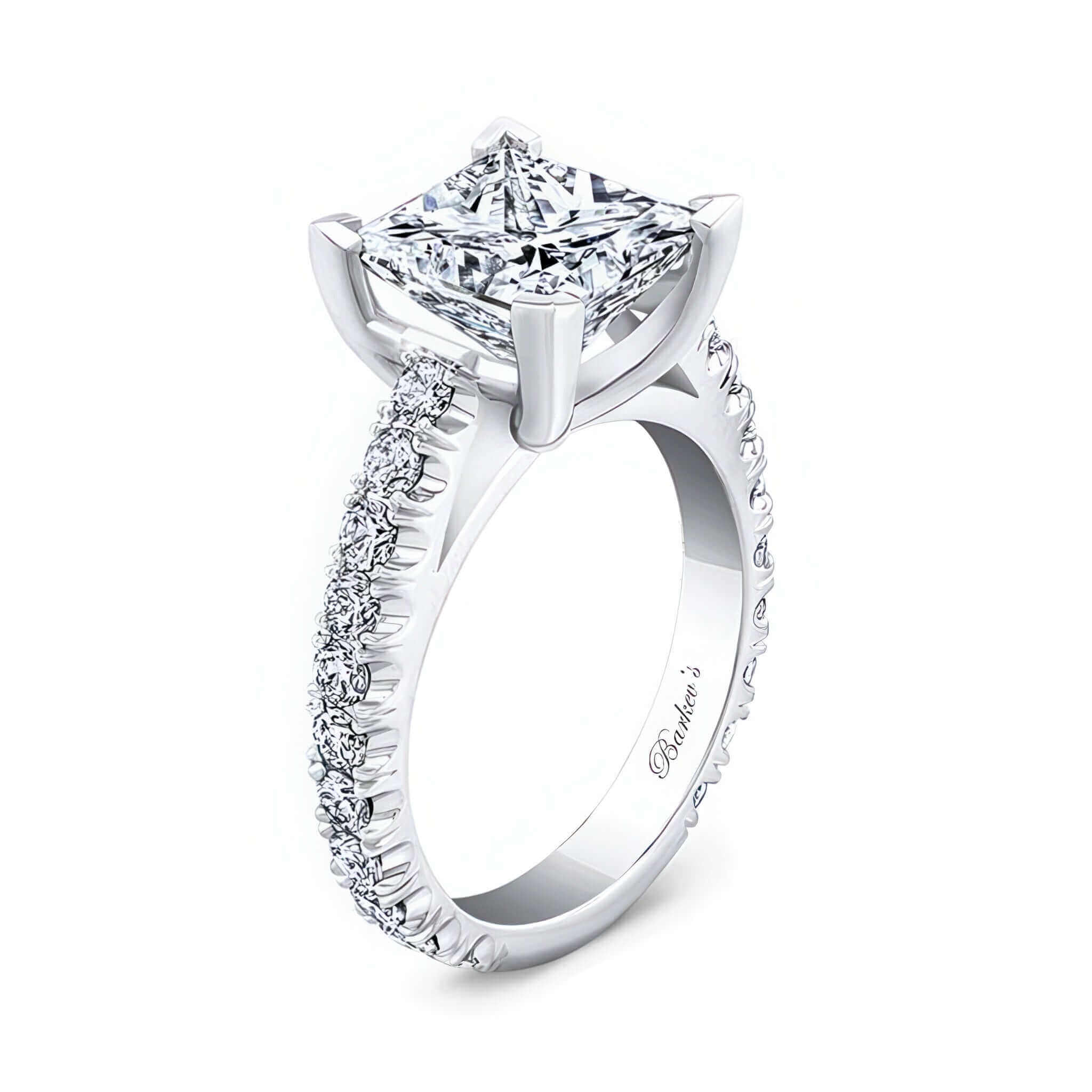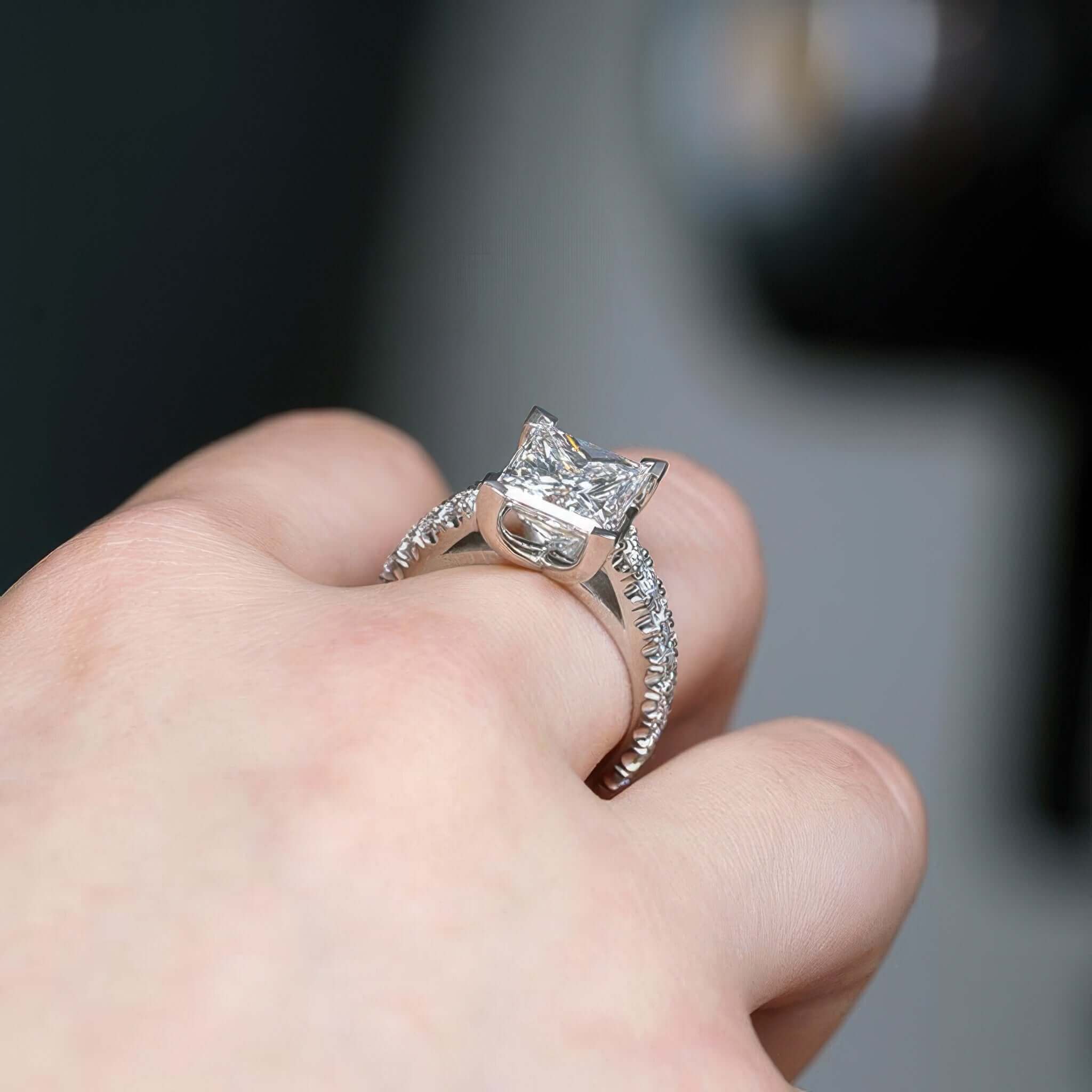 A Glamorous 4 carat princess cut diamond ring featuring a stunning large center with a river of side diamonds flowing on the shank for a show stopping look.