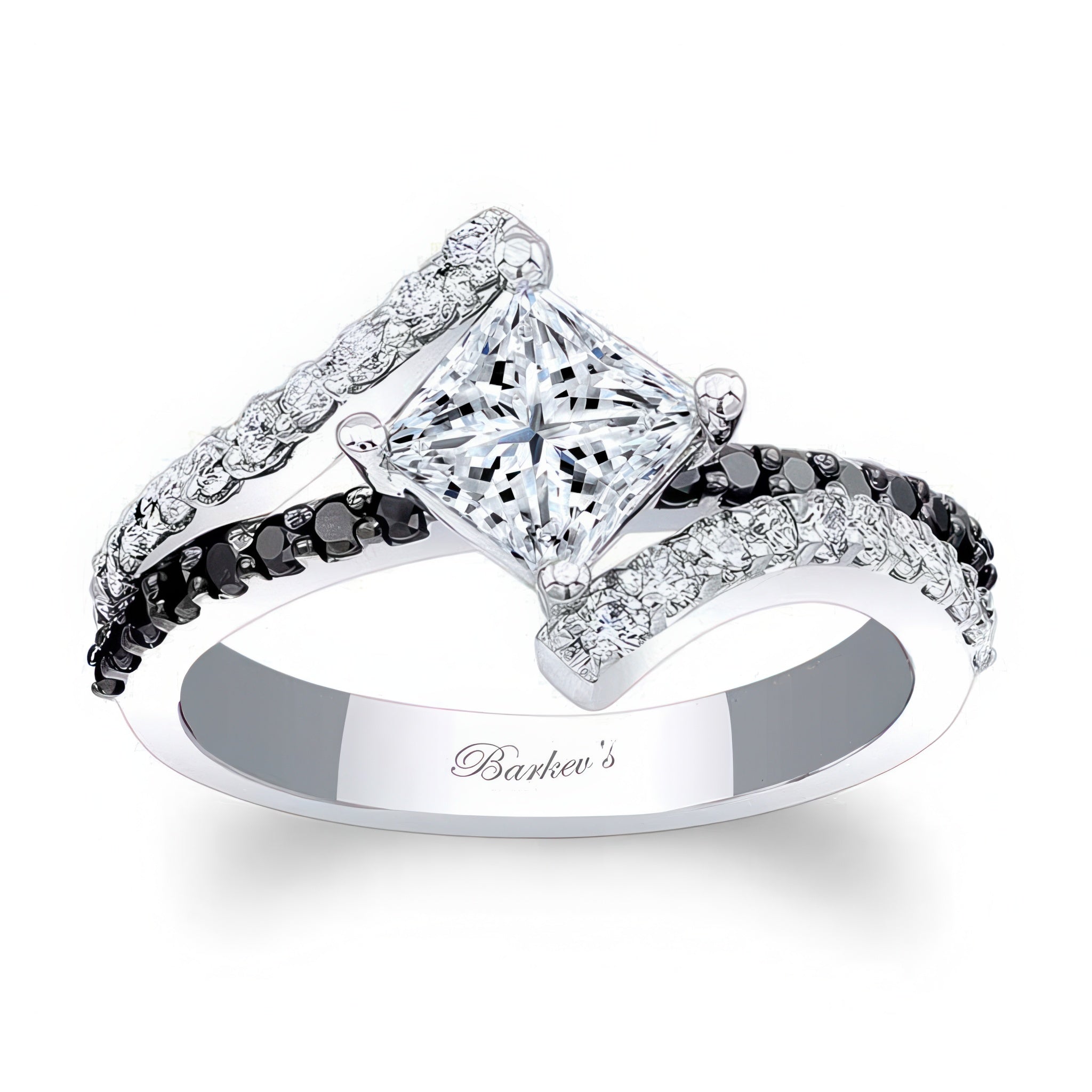 This classic black diamond accent kite set engagement ring features a prong set princess cut center while the ridges of the split shank and bridge are all adorned with shared prong set black and white diamonds for an added touch of elegance.