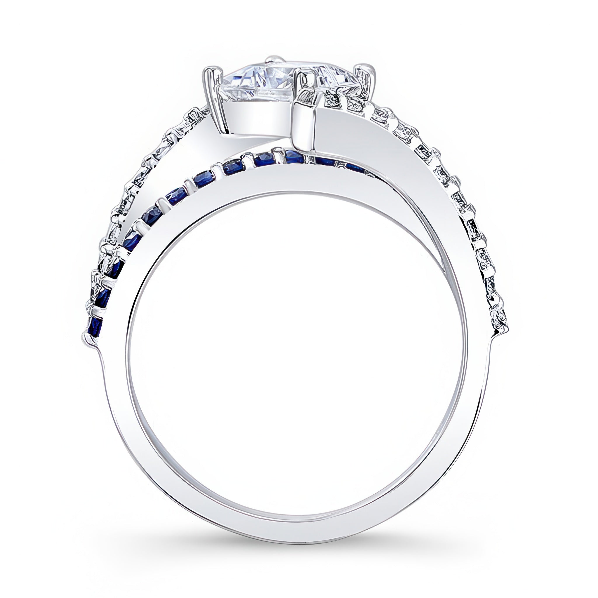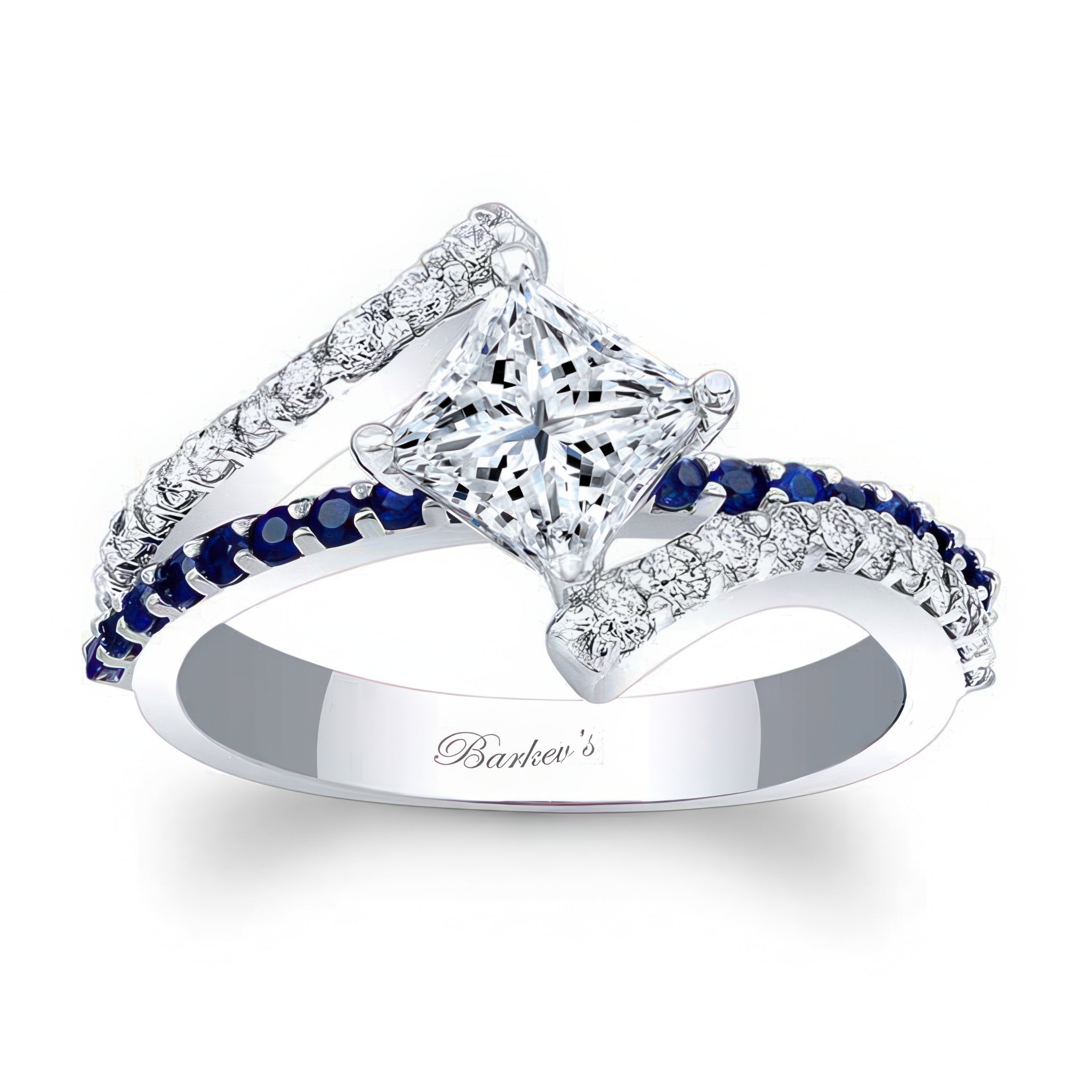 This classic blue sapphire accent kite set engagement ring features a prong set princess cut center while the ridges of the split shank and bridge are all adorned with shared prong set diamonds and blue sapphires for an added touch of elegance.