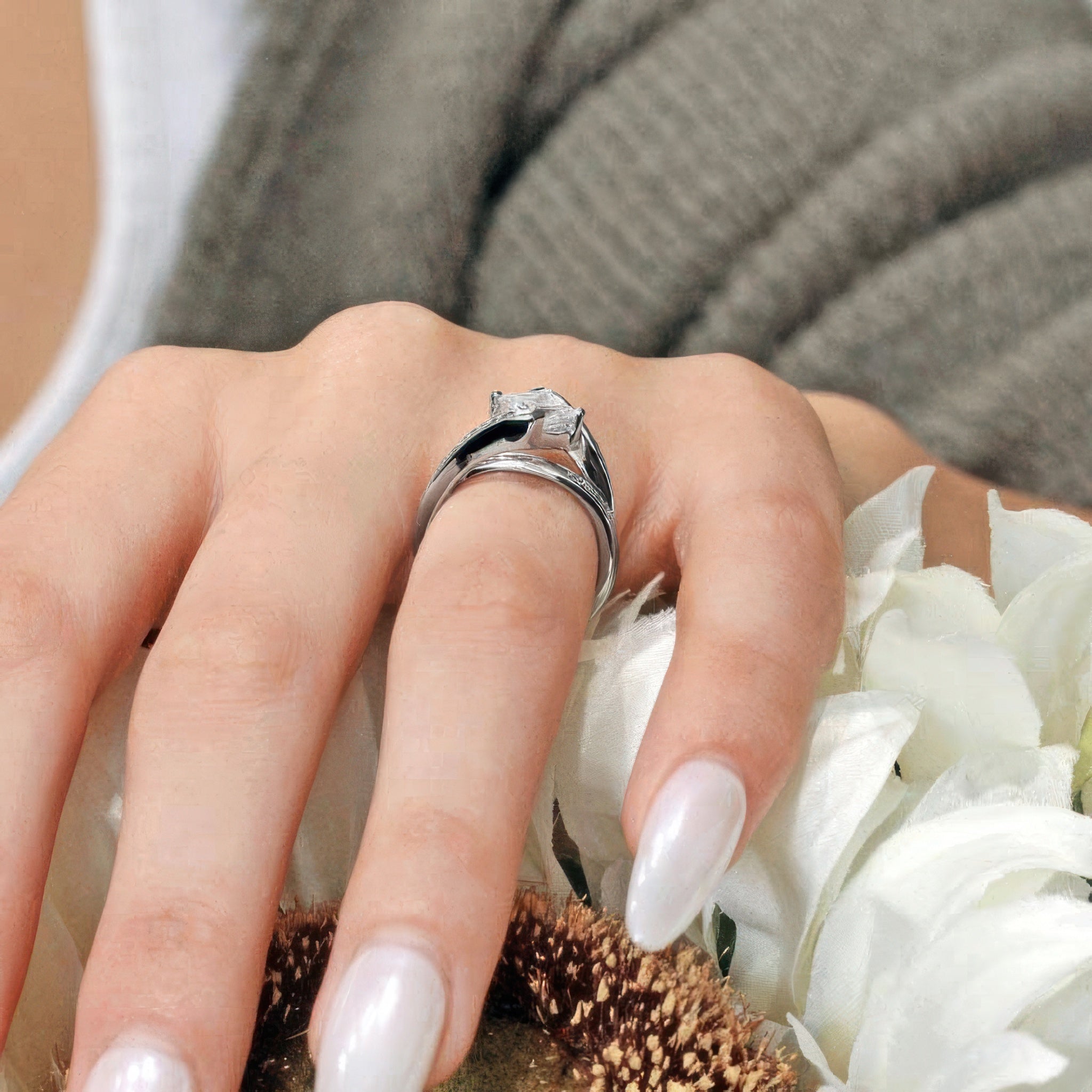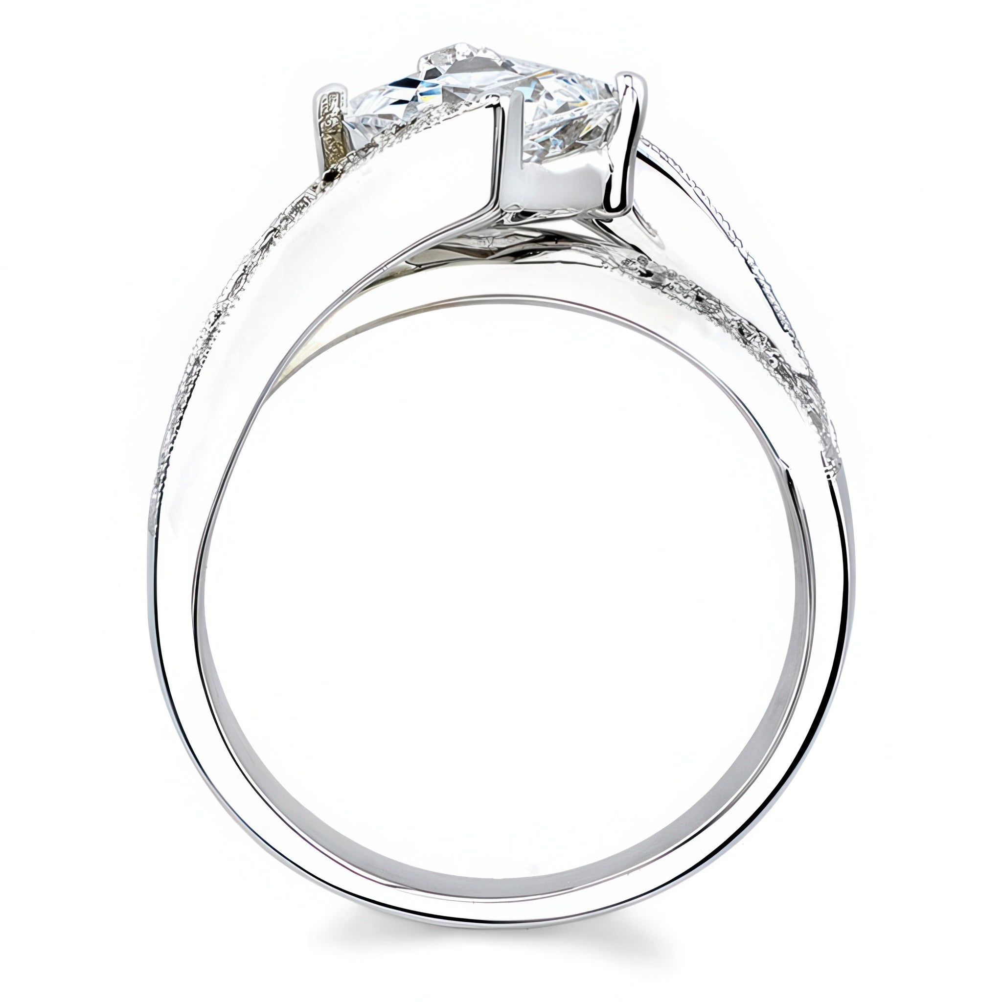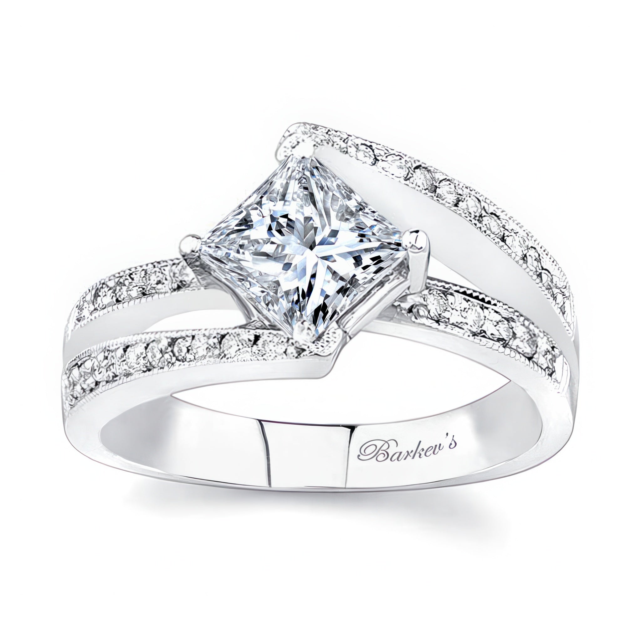 This classic princess cut engagement ring sports a prong set center with a split shank that rises on the outside while the inner shank disappears underneath with pave diamonds.