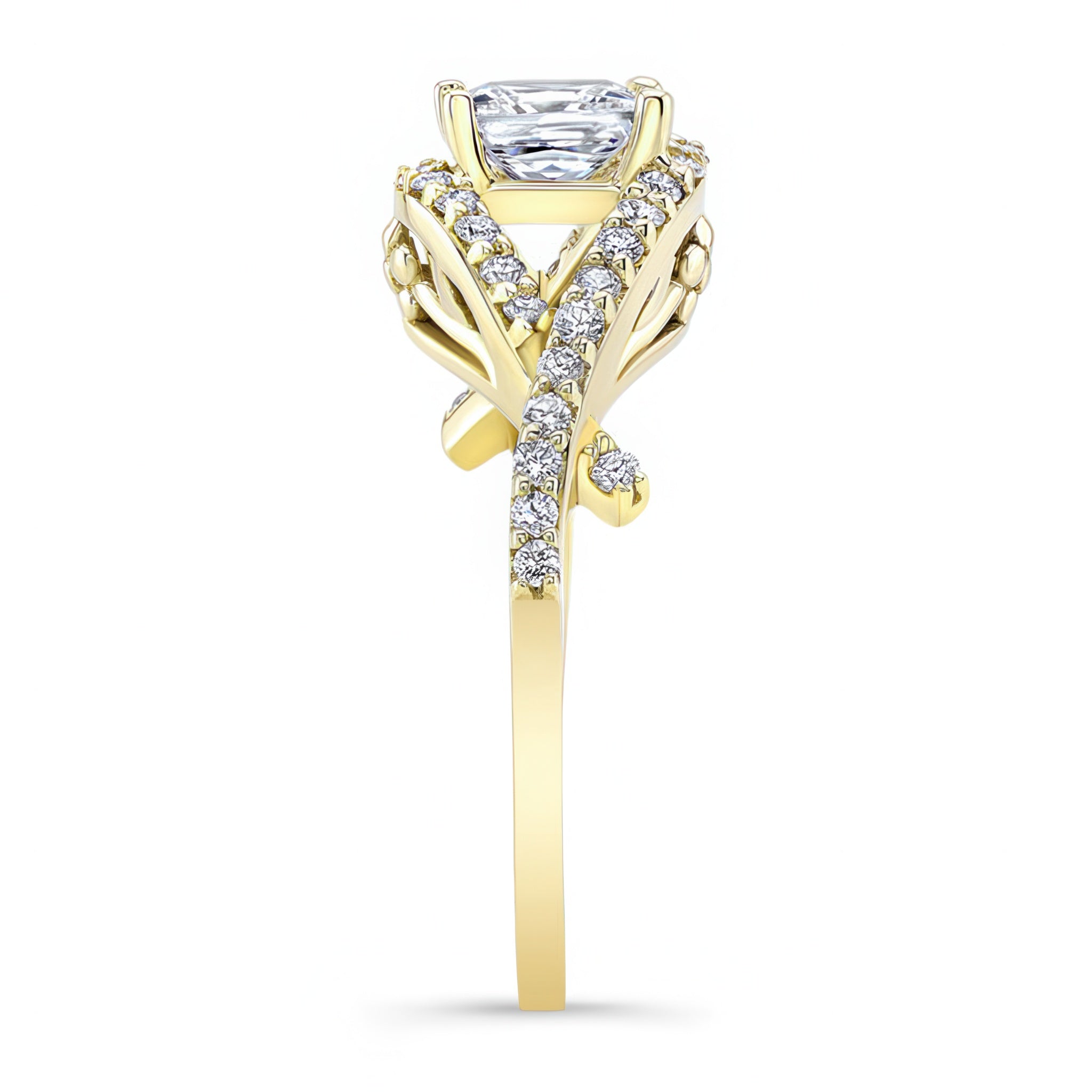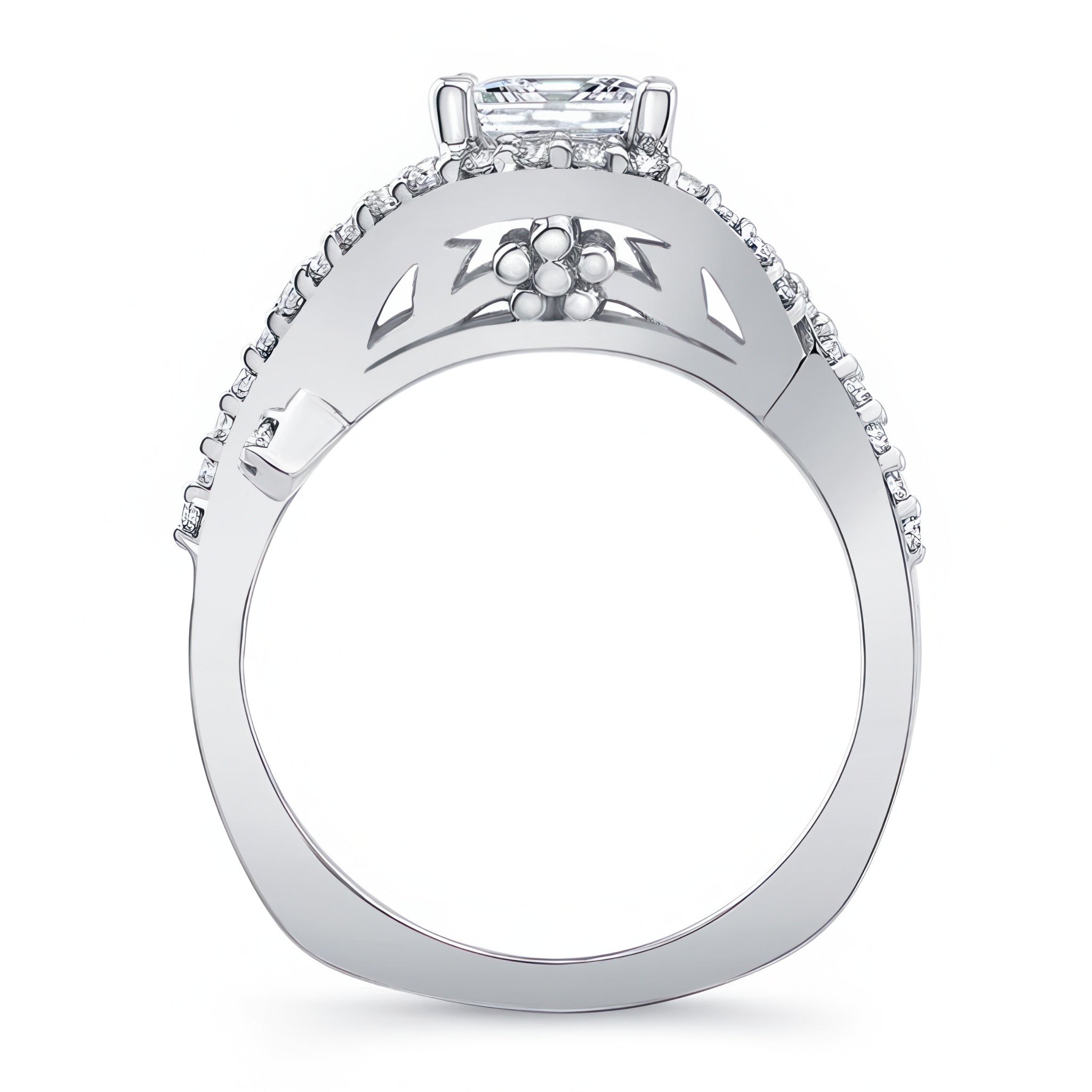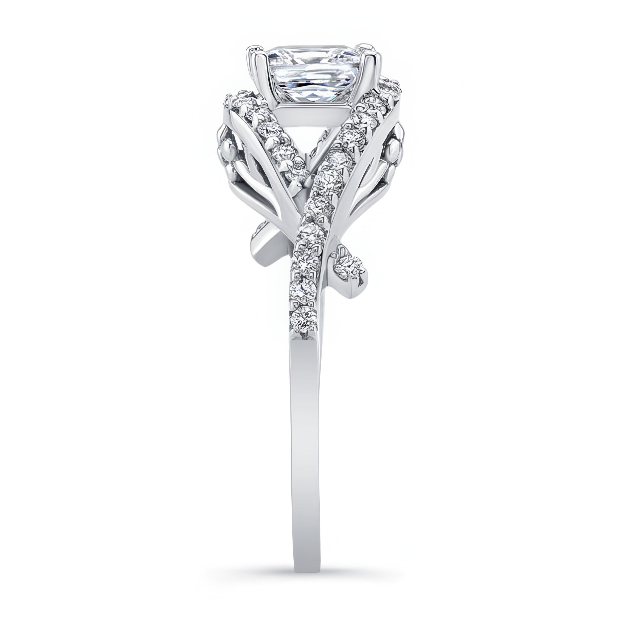 This criss cross princess cut diamond ring features a prong set center with an open curving frame adorned with shared prong set diamonds for a sparkling work of art.