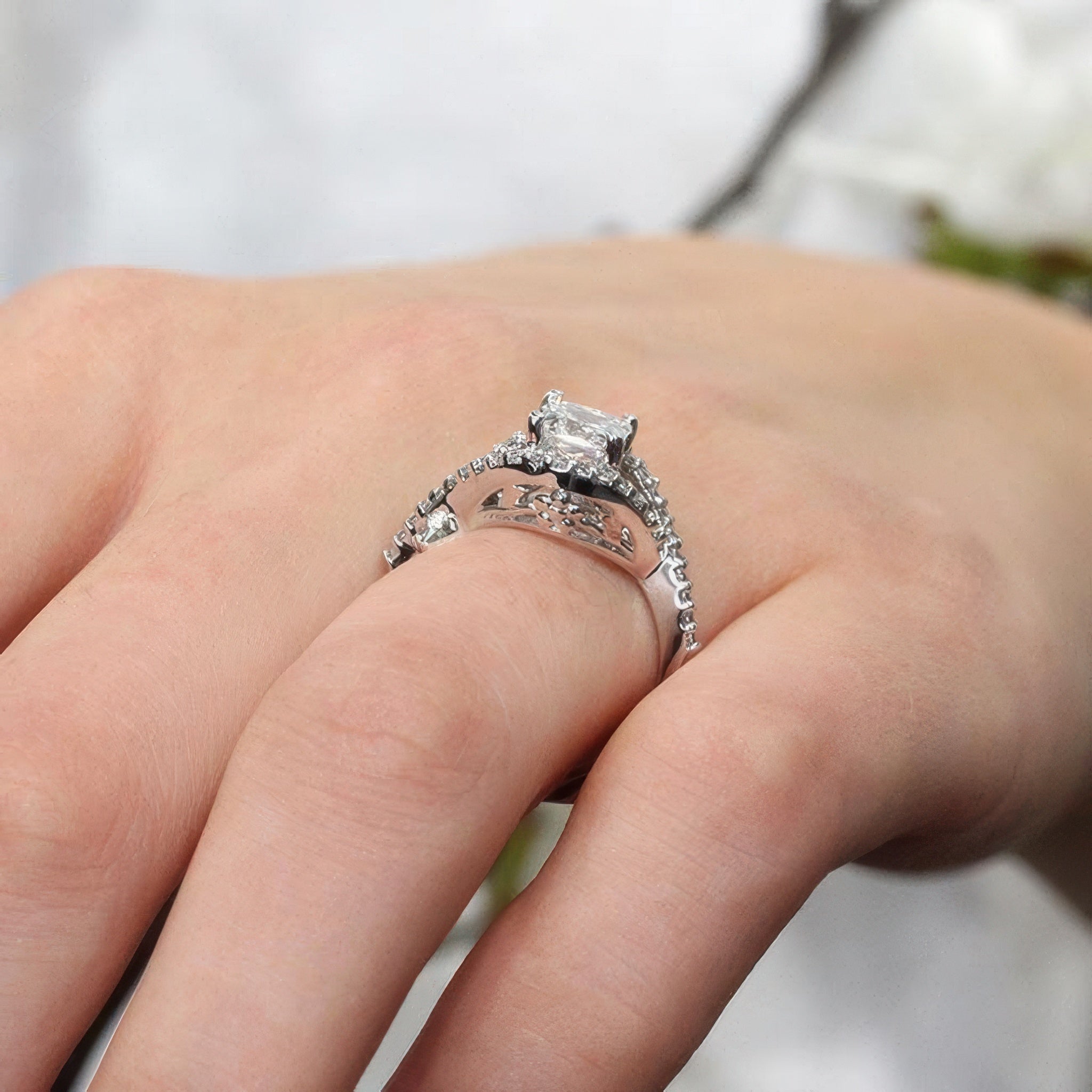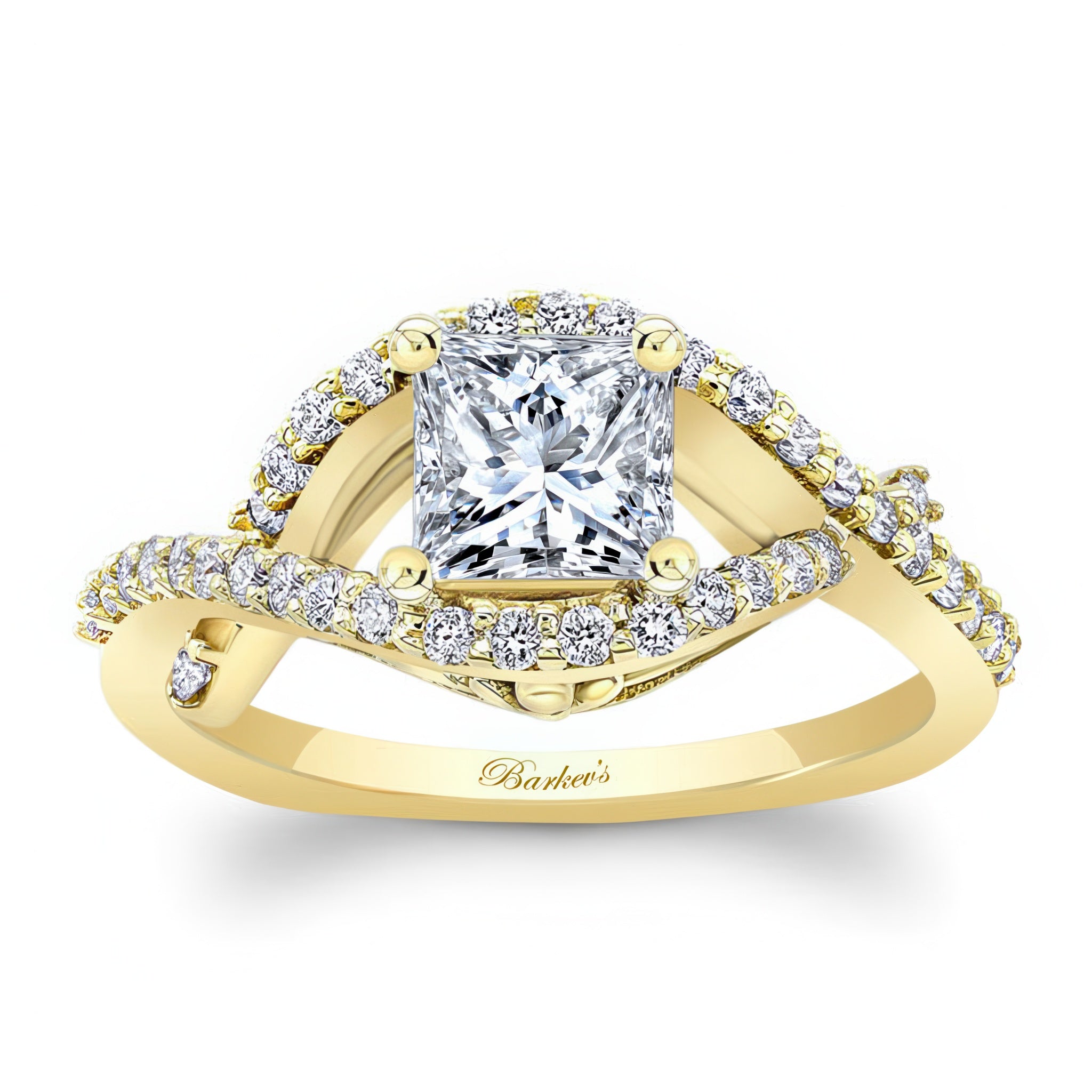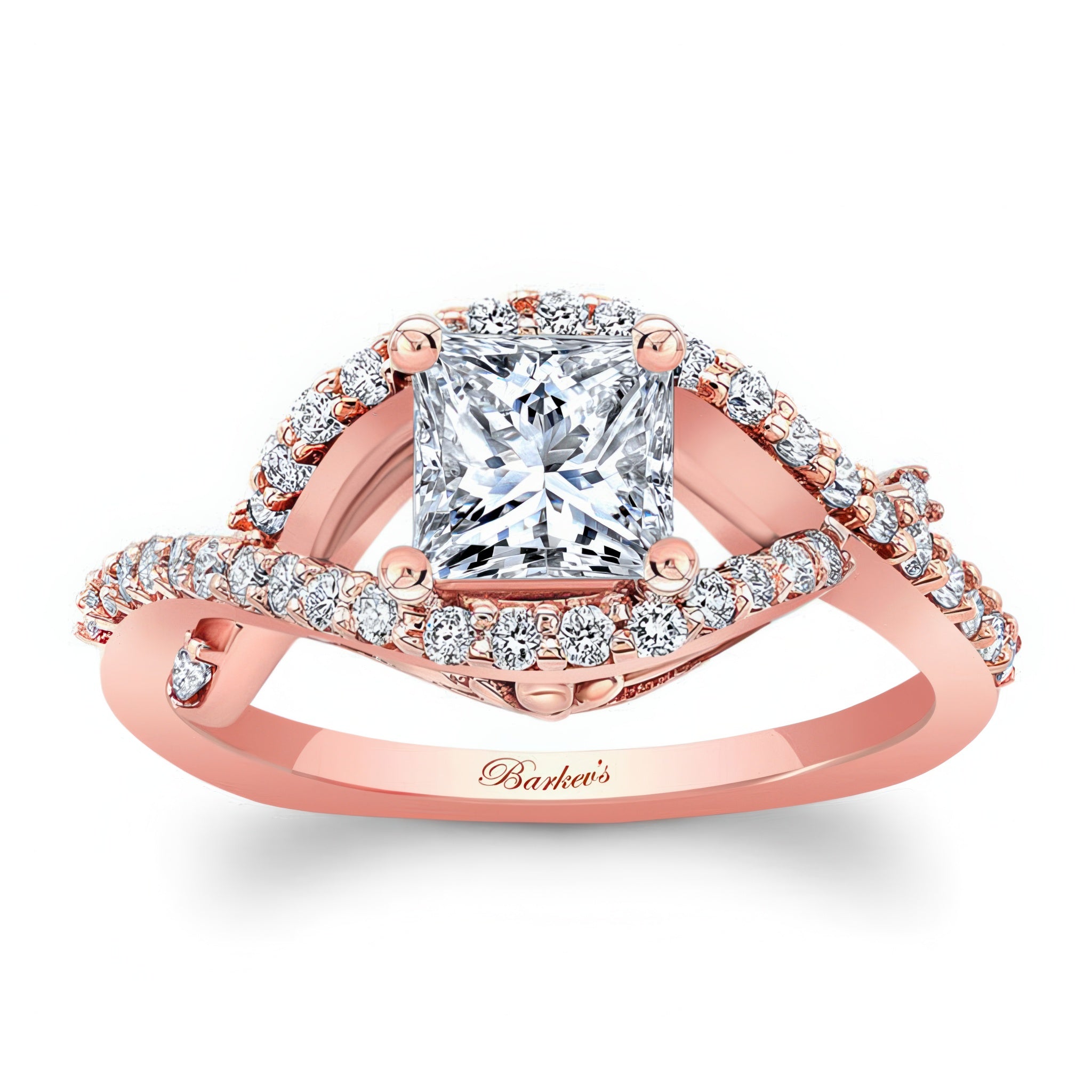 This criss cross princess cut diamond ring features a prong set center with an open curving frame adorned with shared prong set diamonds for a sparkling work of art.