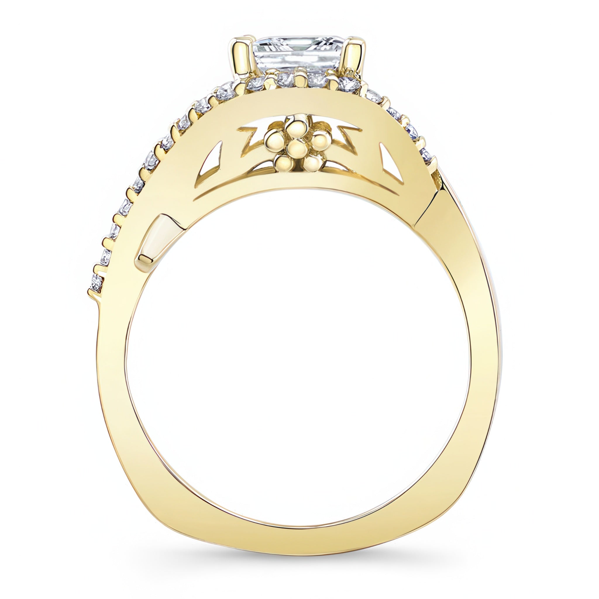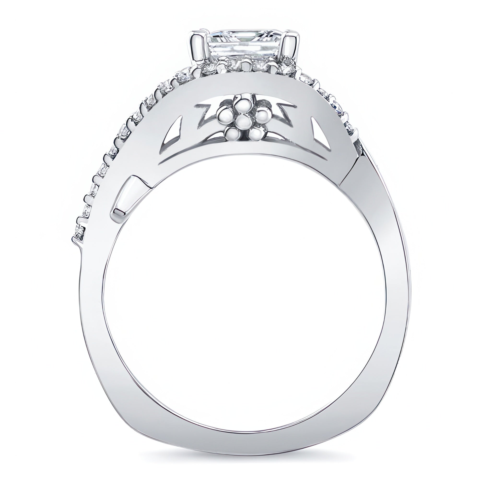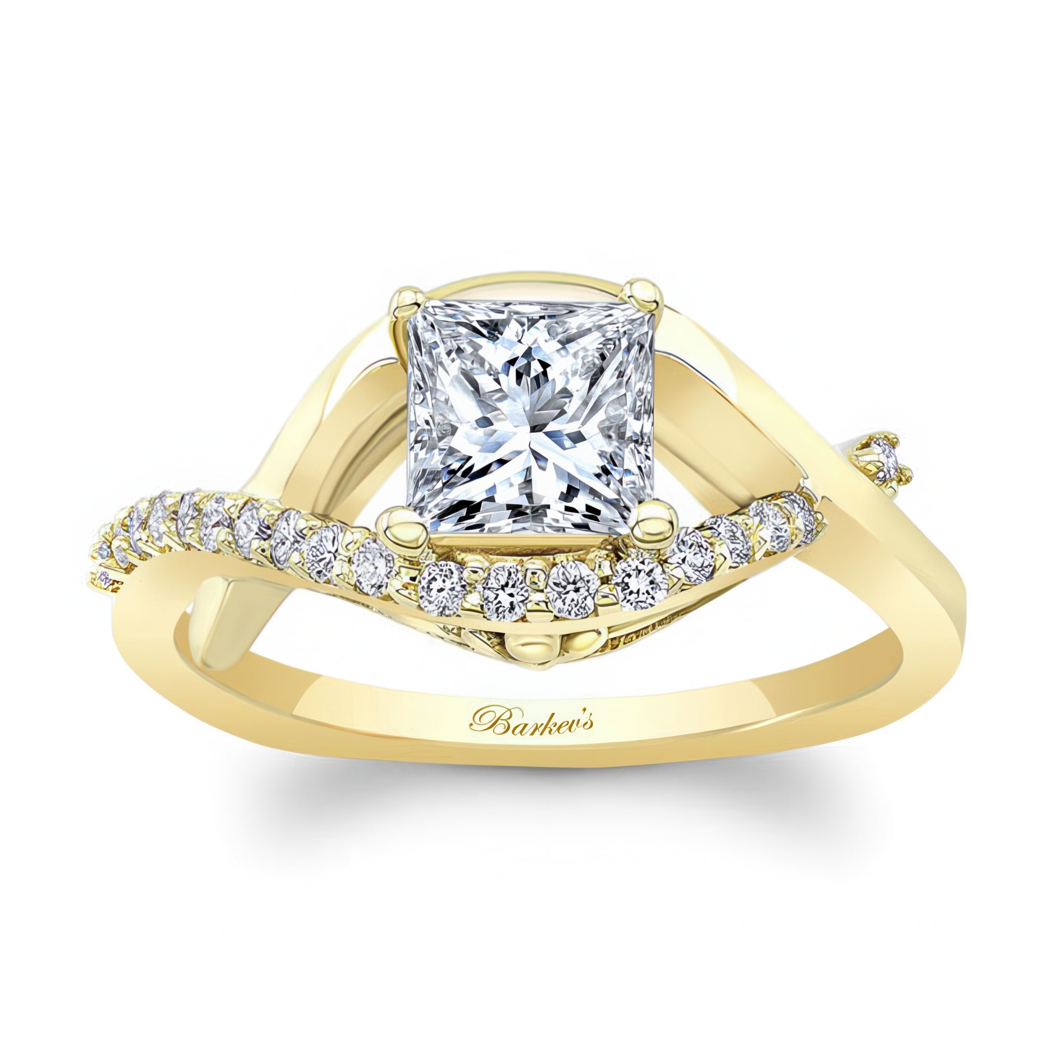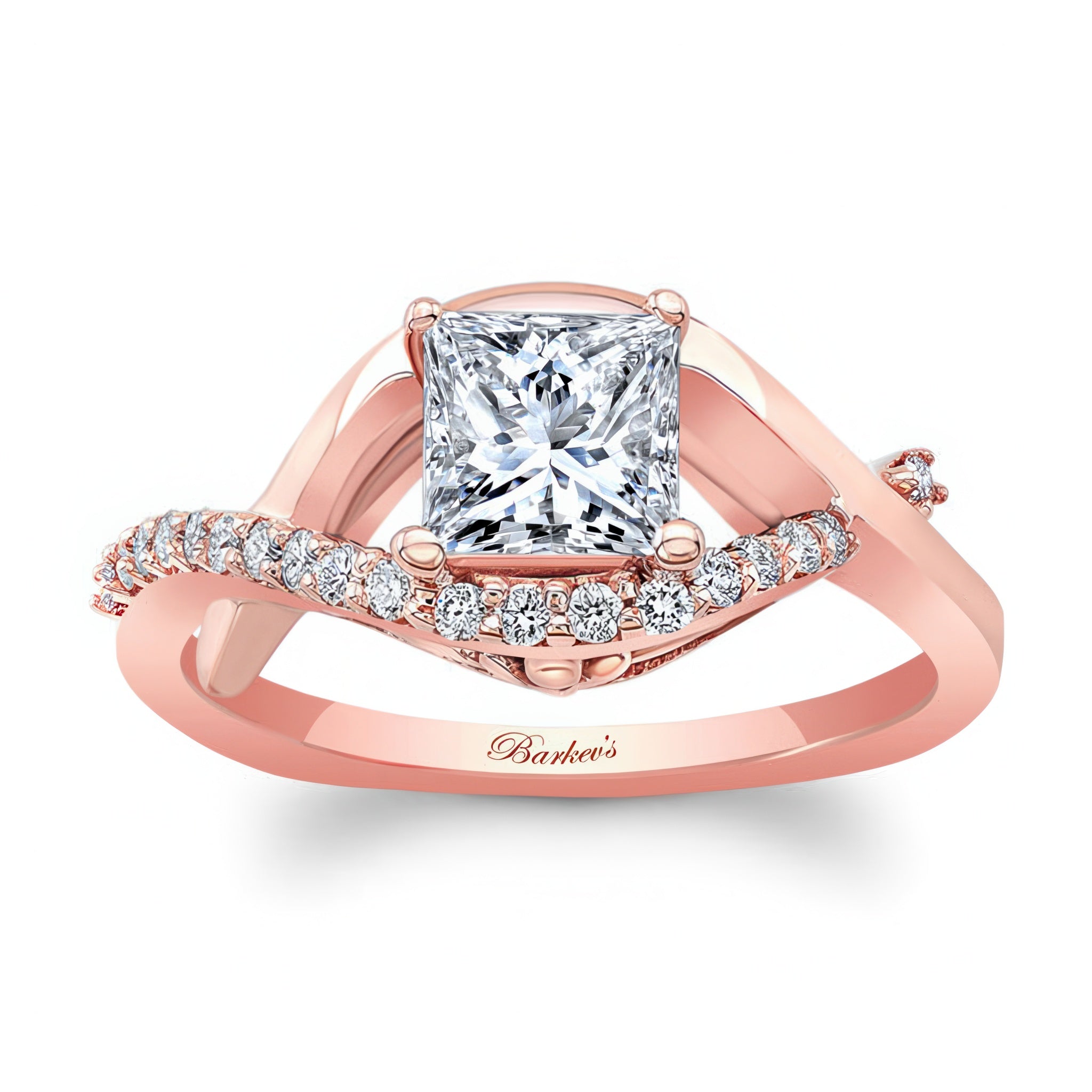 This criss cross princess cut engagement ring features a prong set center that stands gracefully in the middle of the curving open frame with one of the curves adorned with shared prong set diamonds for a dazzling work of art.