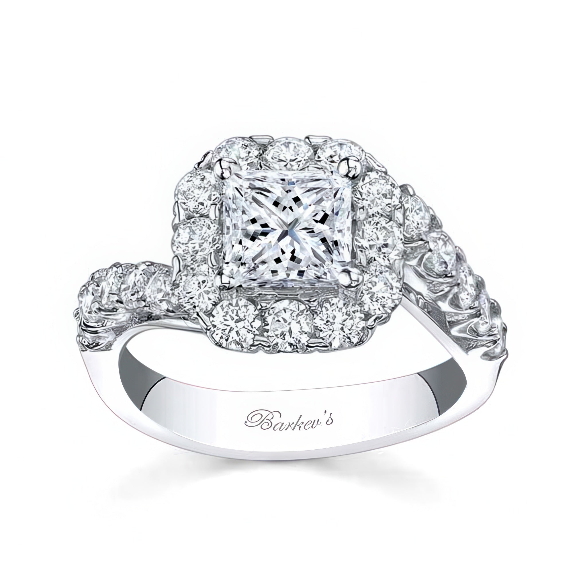 This beautiful halo princess cut ring features a prong set princess cut center with a diamond halo around it and more diamonds on the shank for a stunning look.