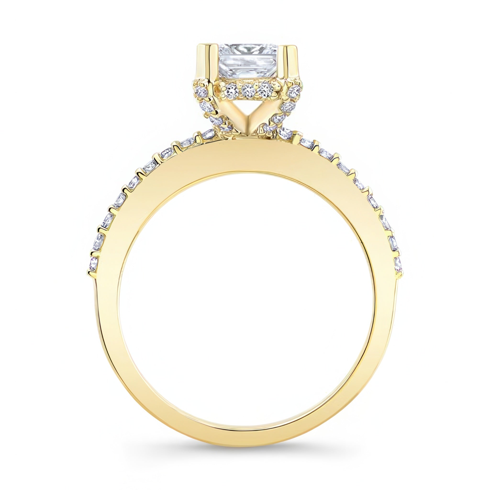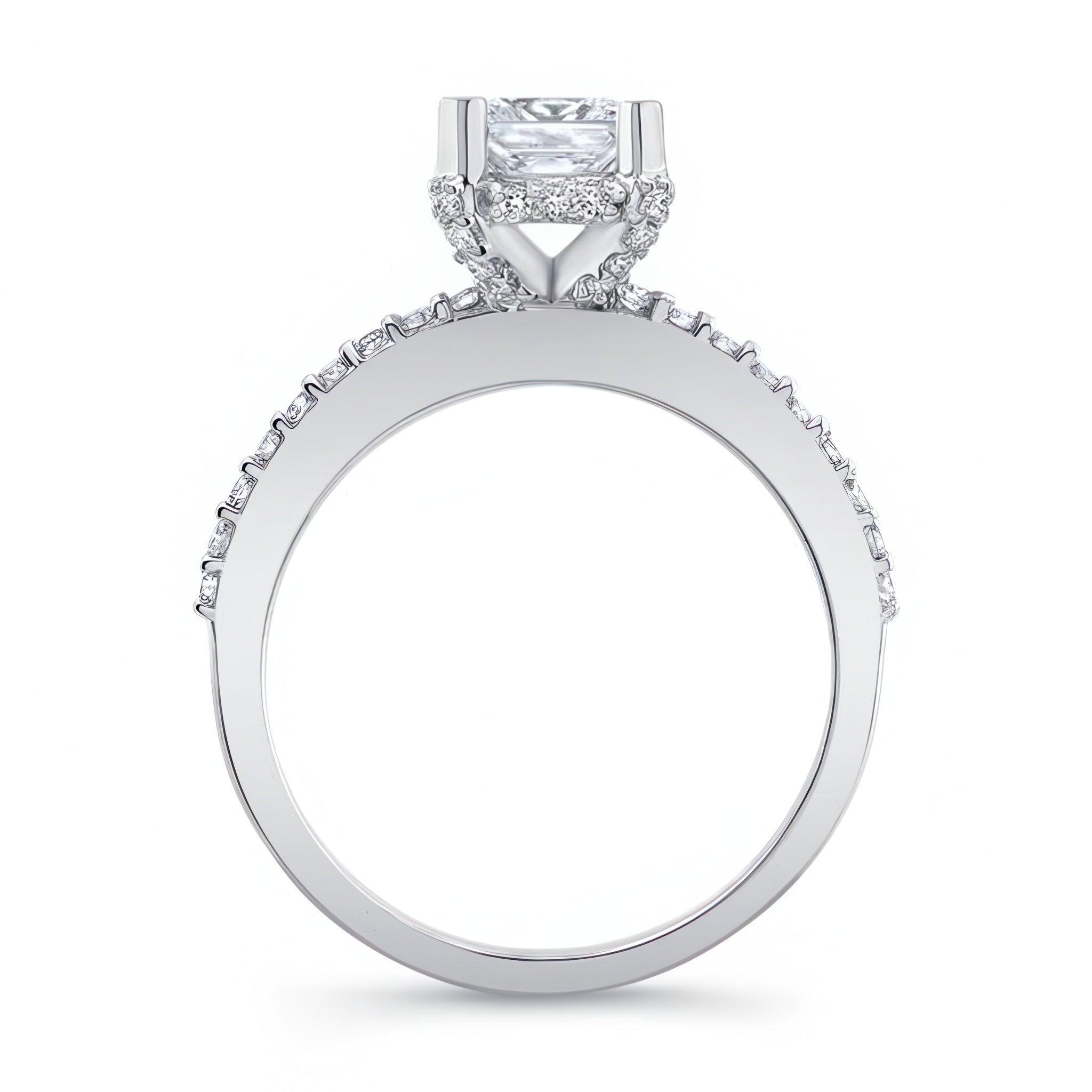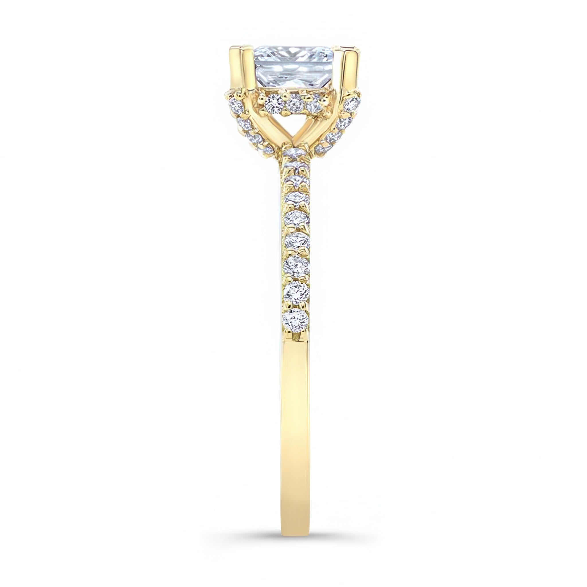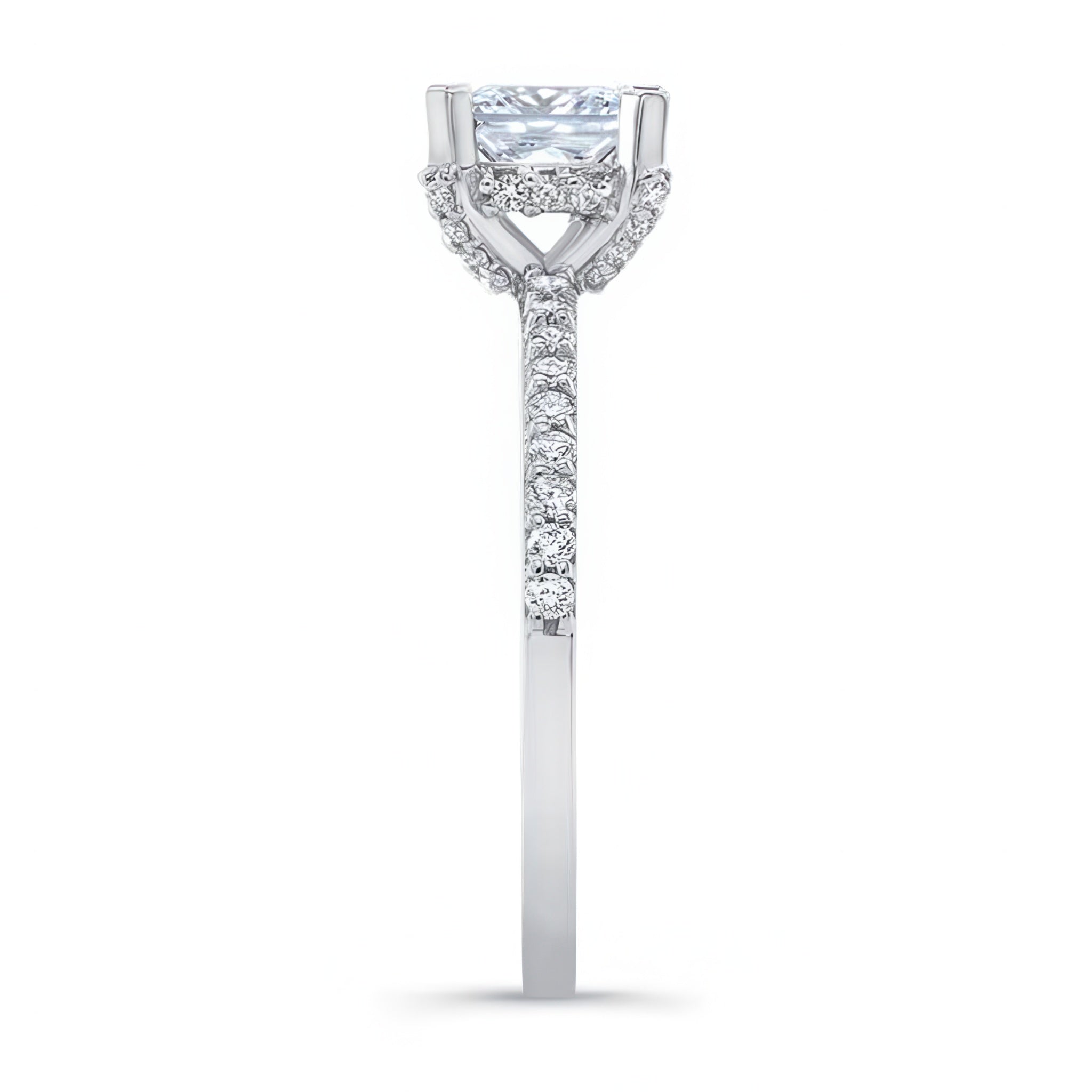 An enchanting hidden halo princess cut engagement ring featuring a center surrounded by diamonds underneath and more flowing down the sides for a look that demands attention.