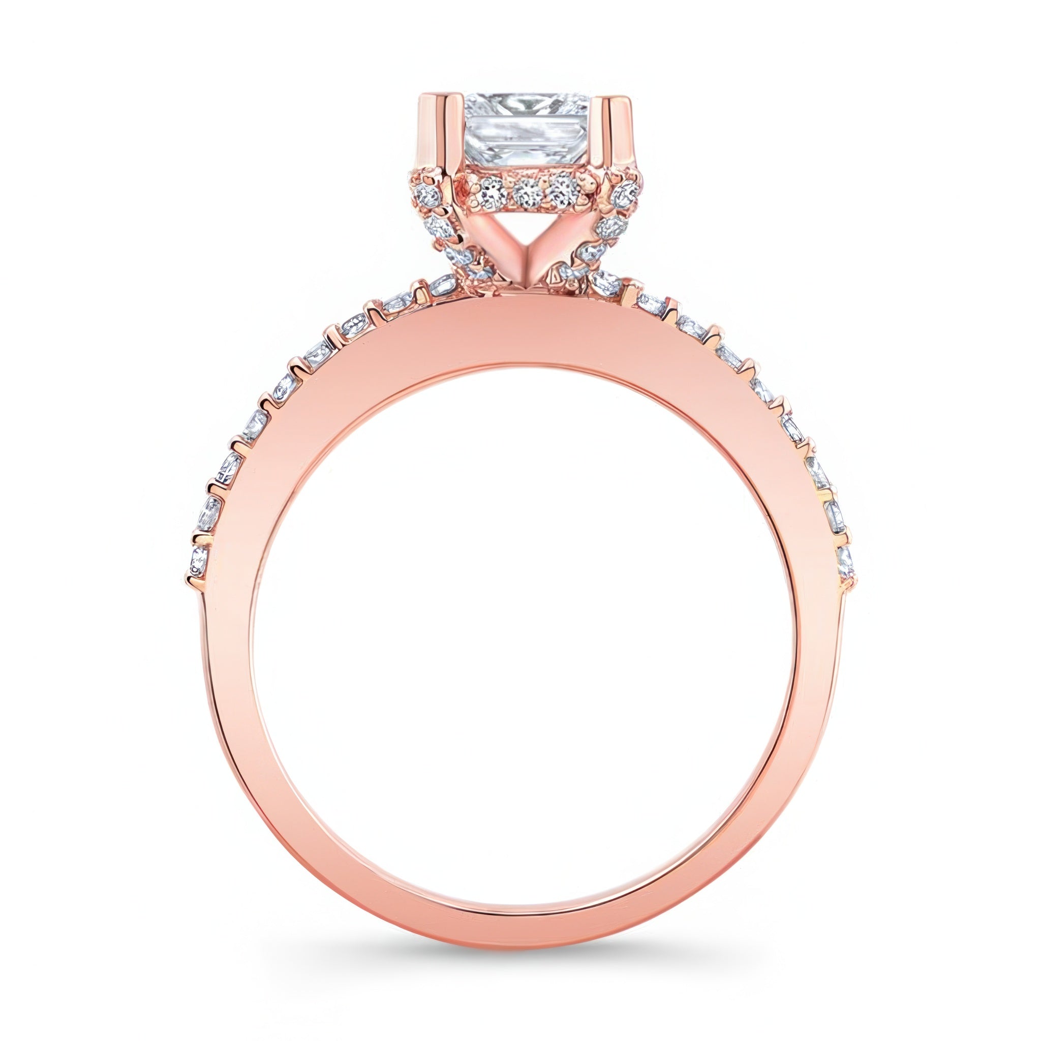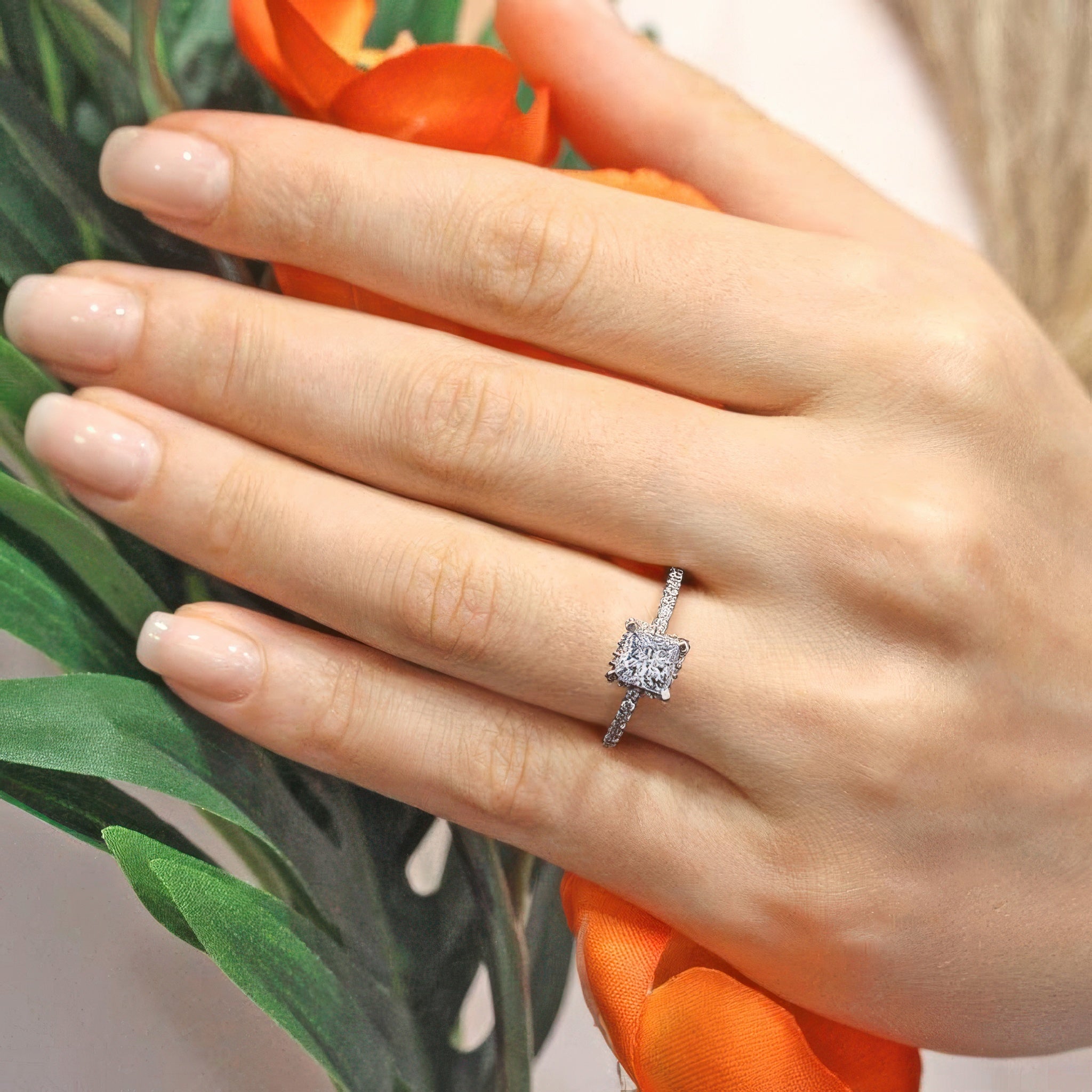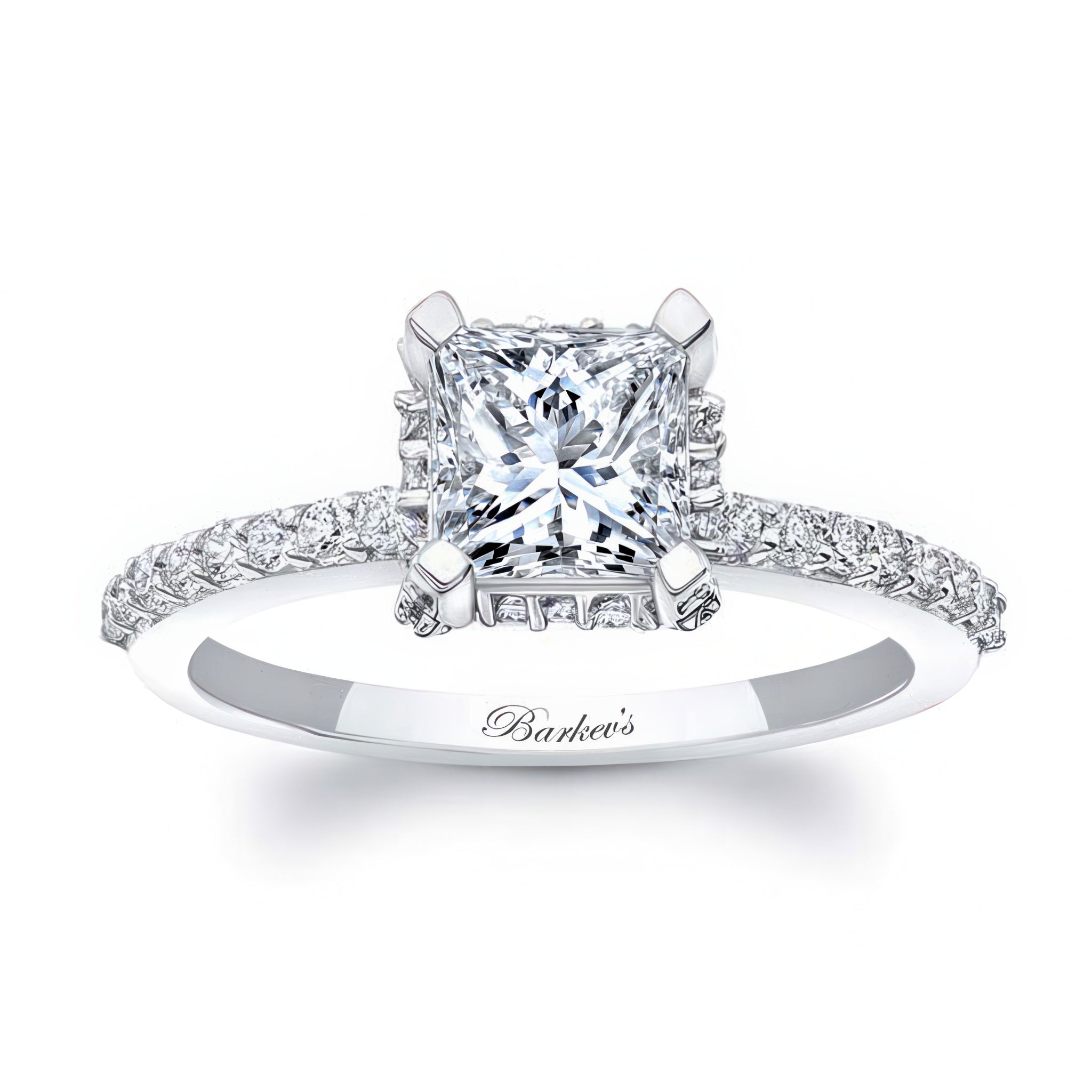 An enchanting hidden halo princess cut engagement ring featuring a center surrounded by diamonds underneath and more flowing down the sides for a look that demands attention.