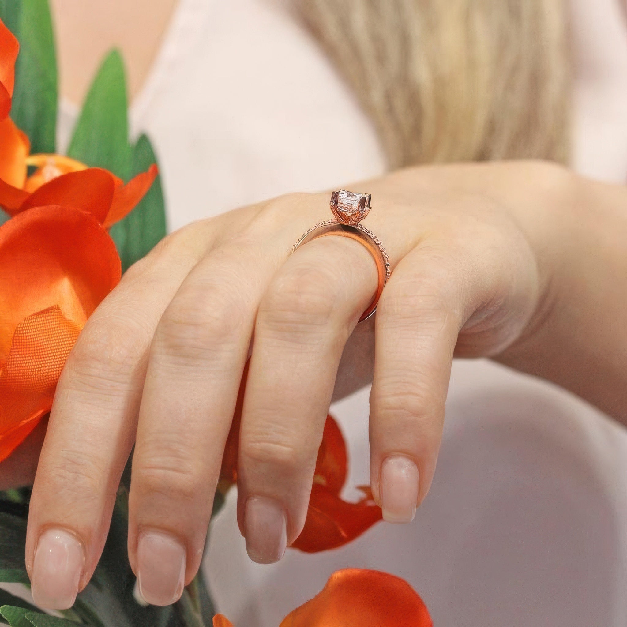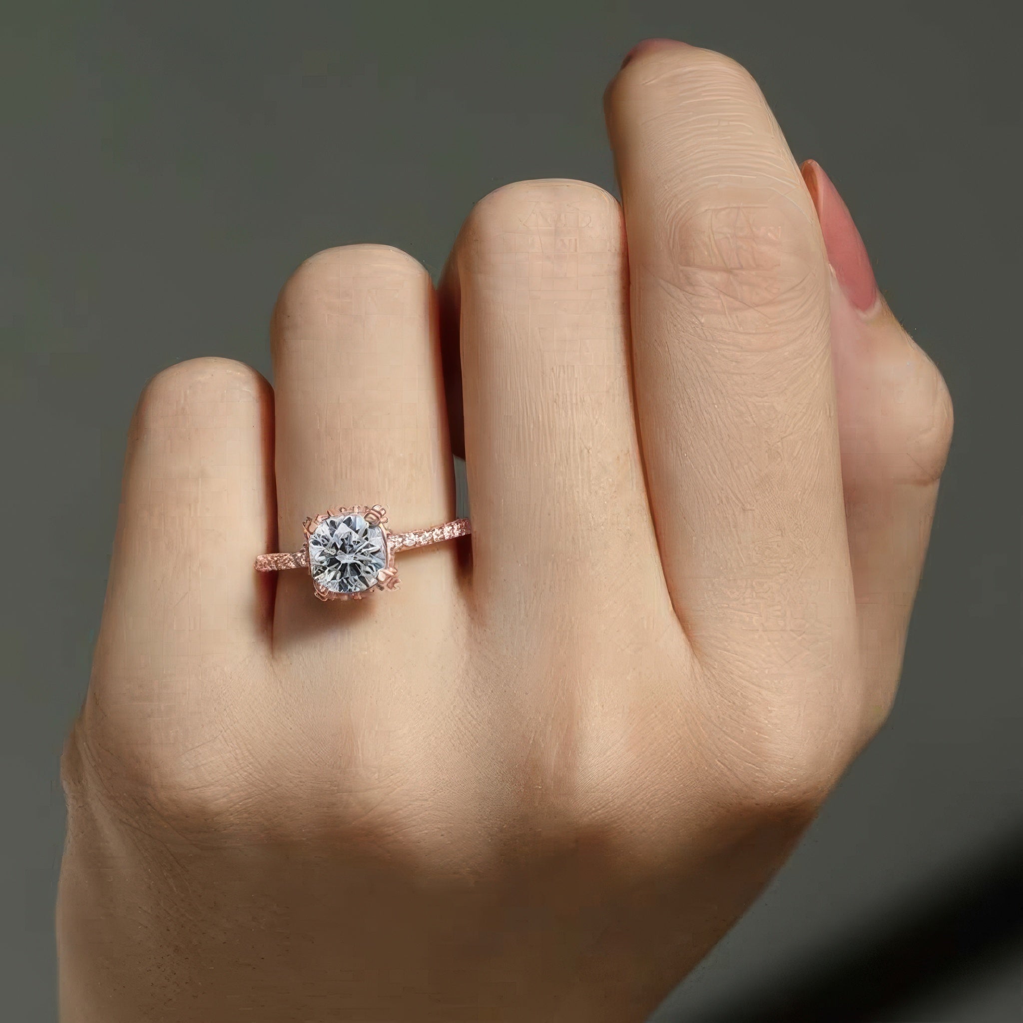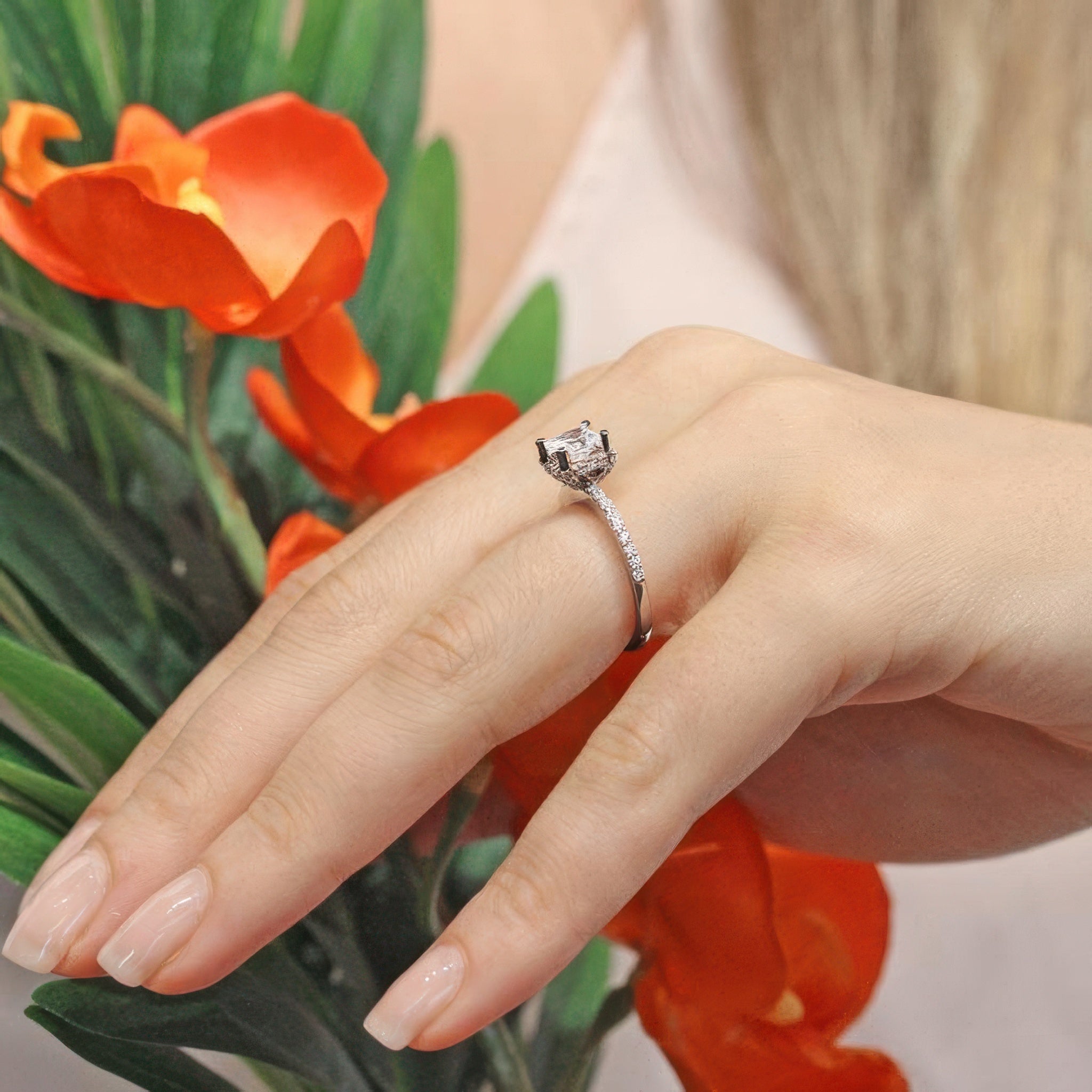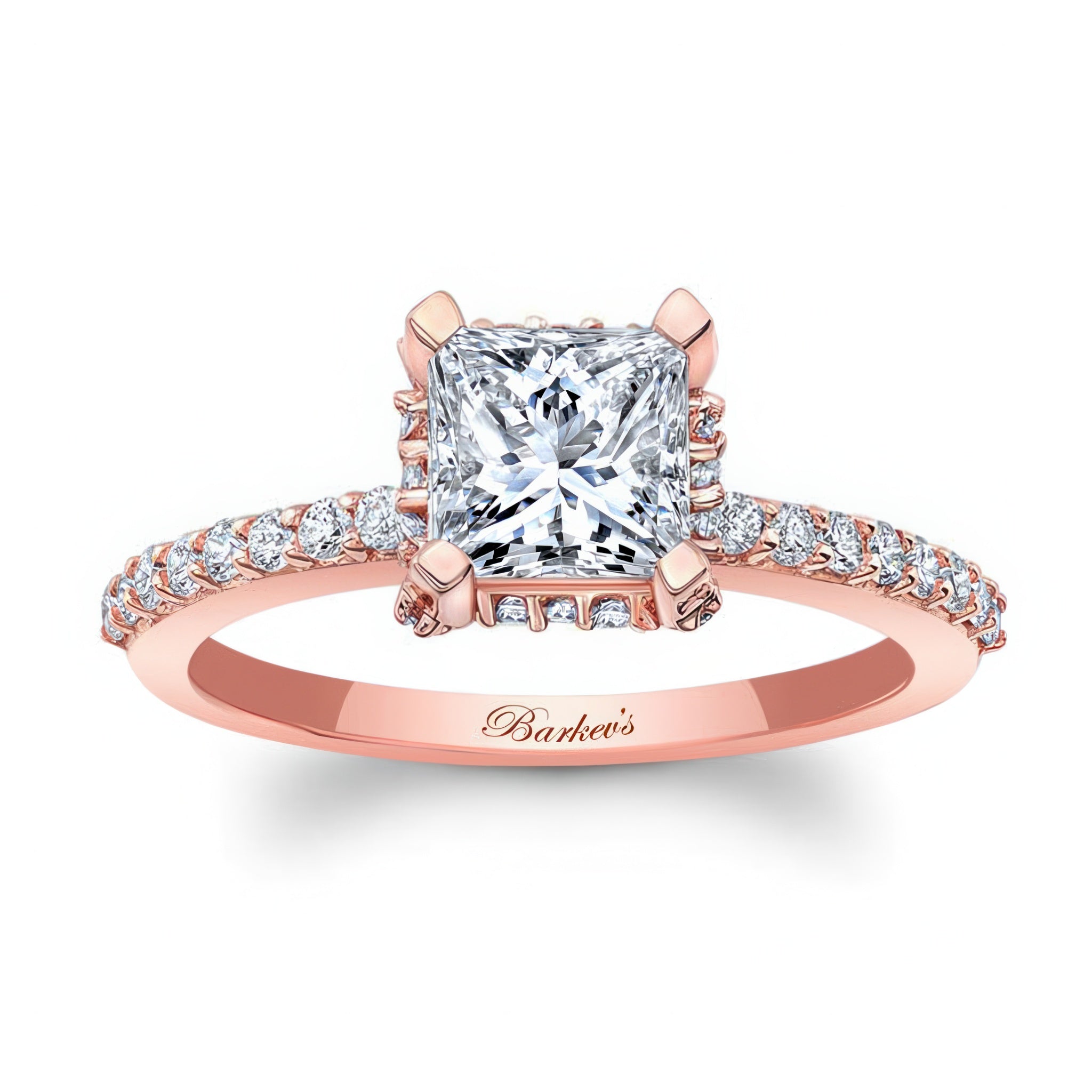 An enchanting hidden halo princess cut engagement ring featuring a center surrounded by diamonds underneath and more flowing down the sides for a look that demands attention.