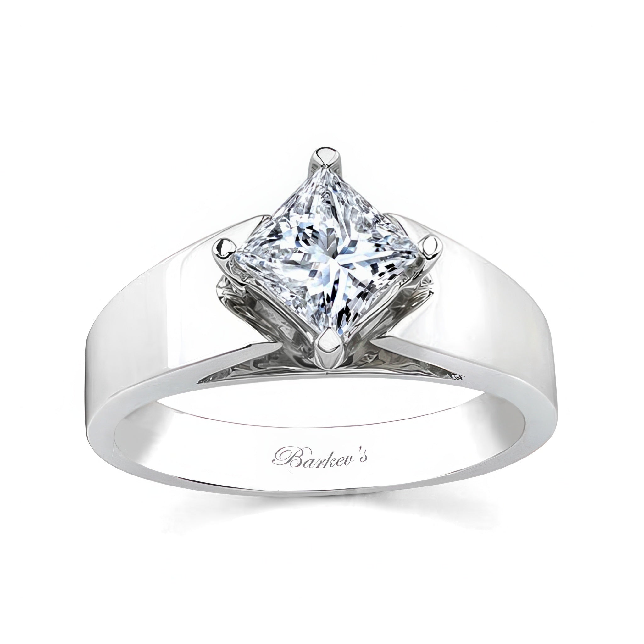 This kite set princess cut solitaire ring features a kite set princess cut center with a flat tapering cathedal shank.