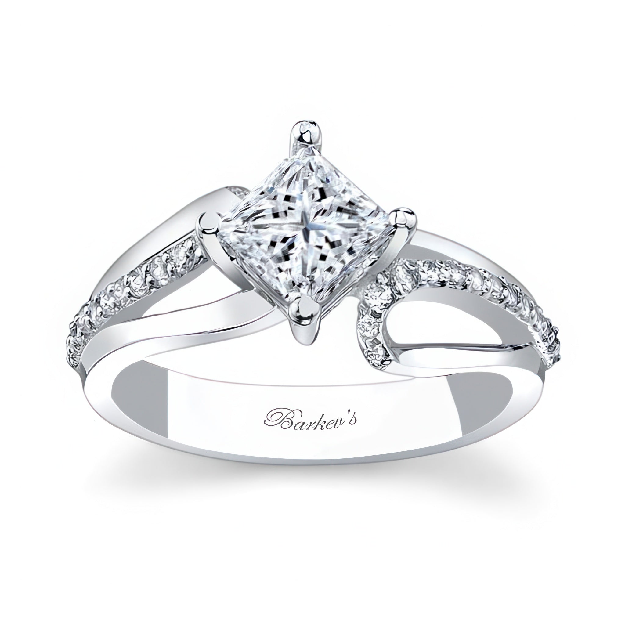 This looping split shank princess cut ring features a prong set princess cut center with artfully looping shoulders adorned with shared prong set diamonds for an elegant statement.