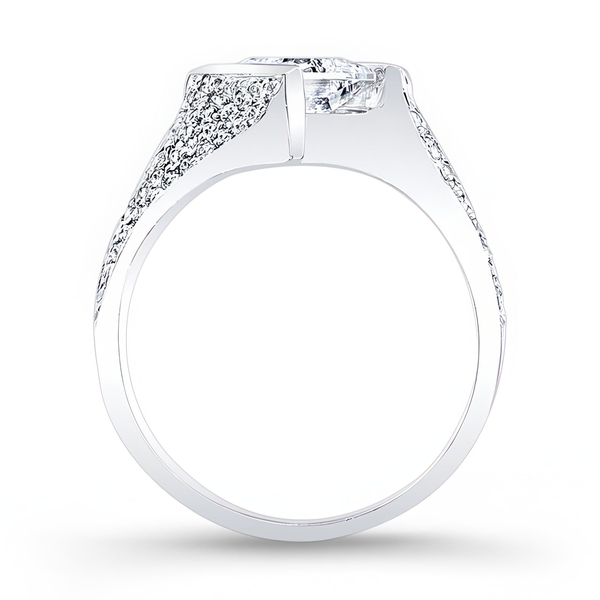 This pave princess cut diamond ring features a channel set center with pave set diamonds on the shoulders for a dramatic look of vogue.