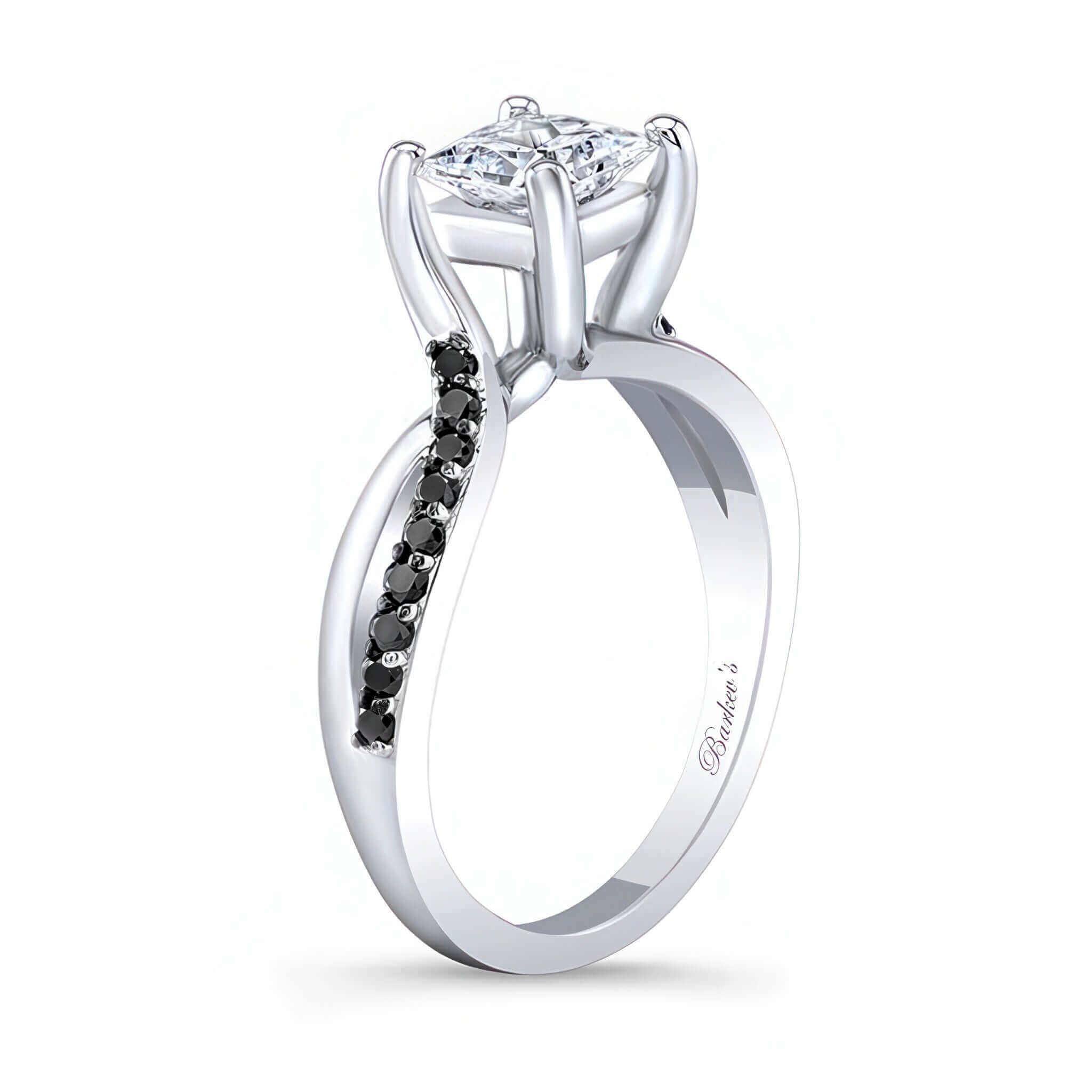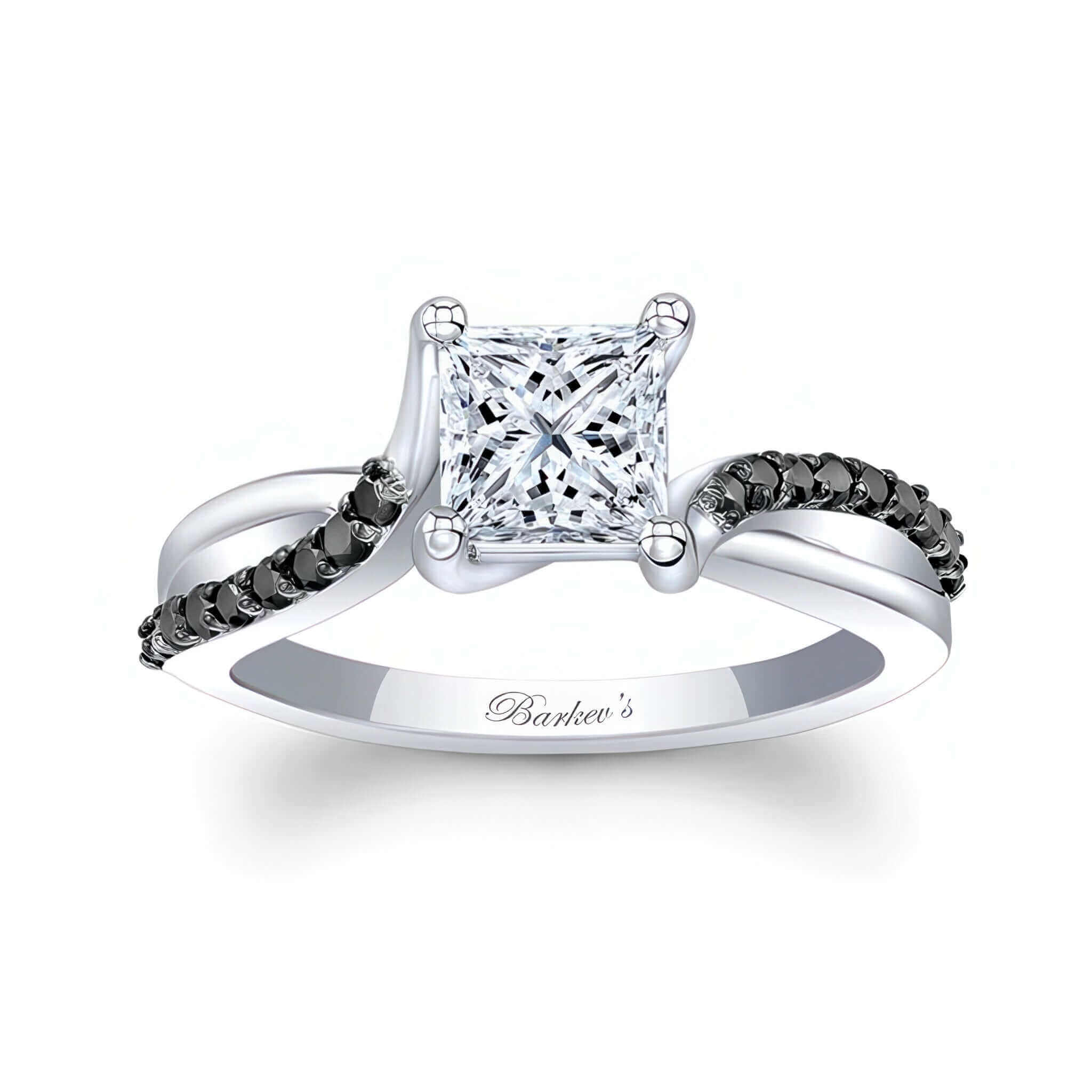 A stunning princess cut black diamond accent ring featuring a prong set center with a sprinkle of shared prong black diamonds set on the slightly curving split shank for a truly beautiful statement.